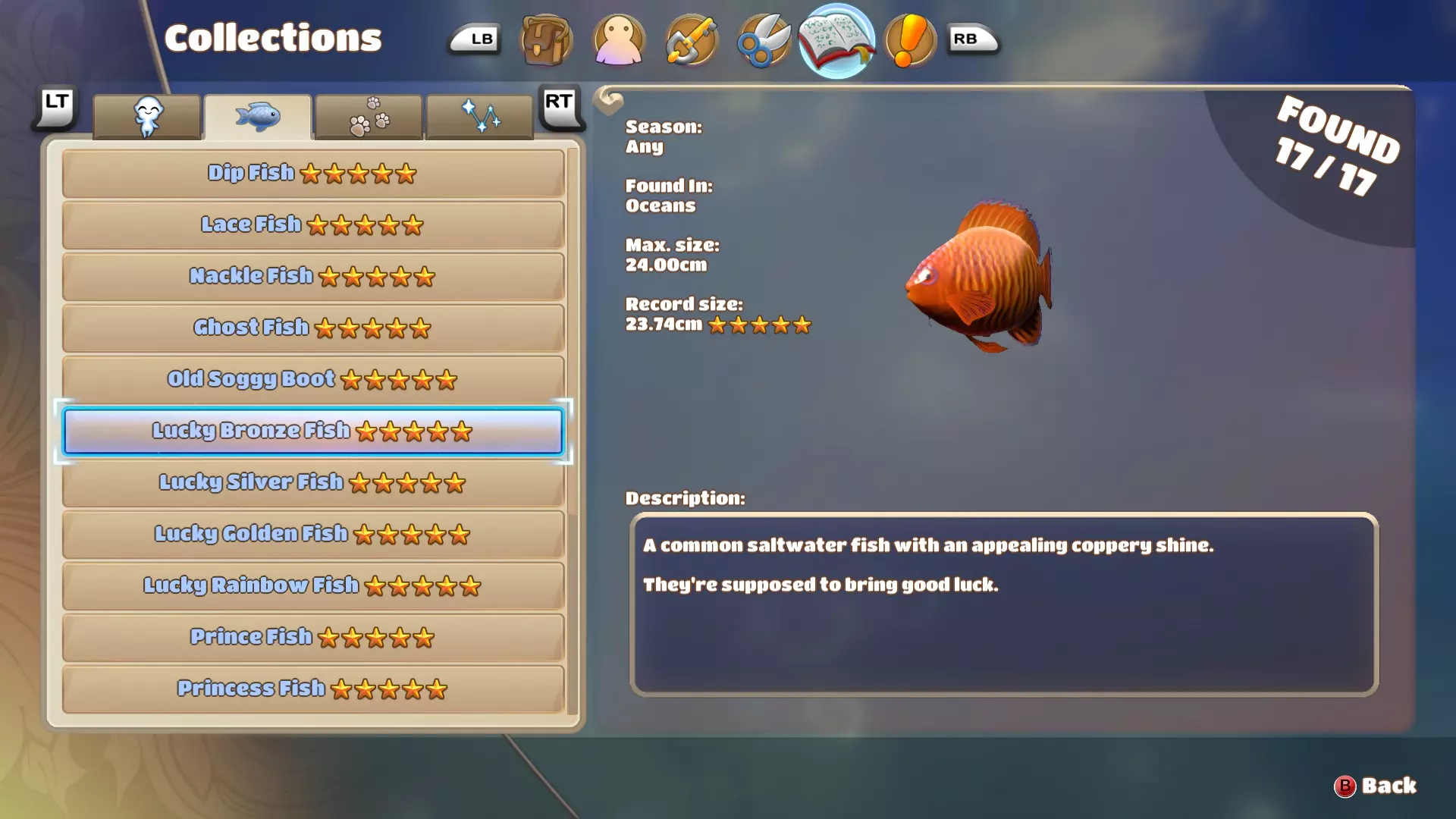 幸运青铜鱼是一种体型肥硕、游动速度相当缓慢的鱼。它很容易与其他幸运鱼区分开来,因为它明显更小,游得更慢,而且尾鳍上有一个钩状的裂口(这个裂口可能是个bug)。 幸运银鱼
