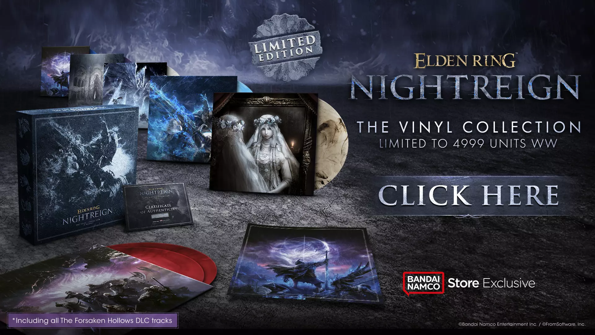 难忘的艺术家 本合集中的每一首乐曲均由FromSoftware的音效团队创作,该团队还负责了如《黑暗之魂》三部曲等其他FromSoftware, Inc.游戏的优秀原声音乐。 这款特别的收藏物品仅在万代南梦宫官方商店发售,且数量有限。一旦最后一张唱片售罄,将不再进行再生产。此限定版包含: - 一个高品质的收纳盒 - 57首音乐曲目(完整原声带,包括DLC【被遗忘的空洞】中的所有曲目) - 七张带星光效果的高品质黑胶唱片(每张唱片均独一无二,因此个别副本可能有所不同) - 六个折叠式唱片套,每个都带有独特的全彩图片 - 一幅艺术印刷品(尺寸:300×300毫米) - 一张编号为1至4999的真伪证书 *此黑胶版本仅在万代南梦宫欧洲、澳大利亚、中东、印度和美国商店独家发售。