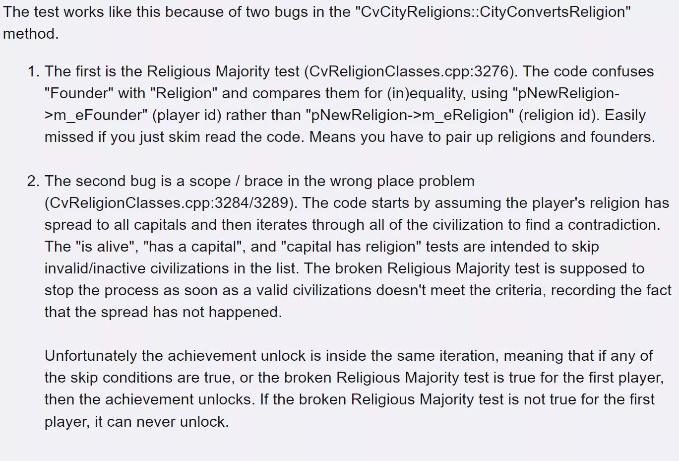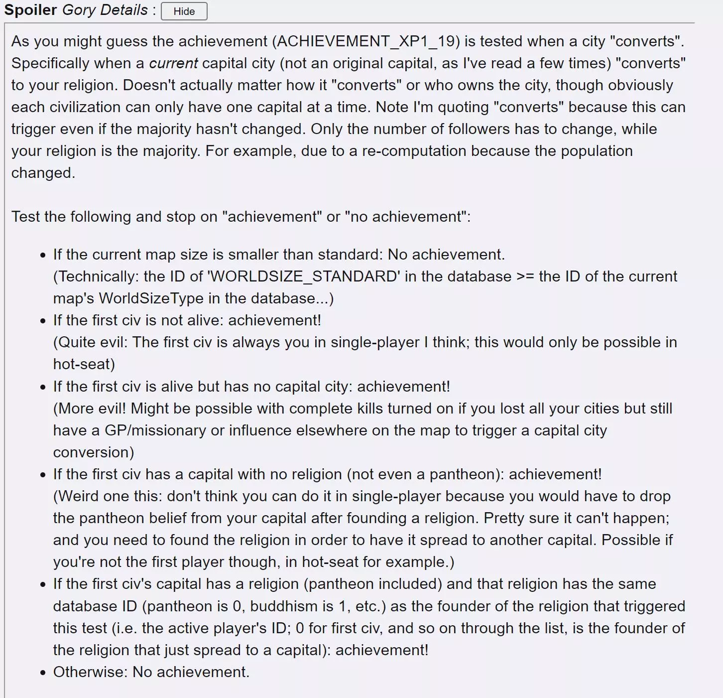 我们是一家人 在标准或更大尺寸的地图上,成为所有首都城市的主流宗教。 许多玩家都有这样的经历:仅仅在标准或更大尺寸的地图上让自己的宗教成为所有首都城市的主流宗教,并不一定能解锁该成就,但它仍有可能被解锁。关于不同玩家如何解锁该成就,有很多说法。在撰写本文时,本指南的作者列出了以下一些解锁策略。如果你有未在此列出的好策略,请在评论中提出建议或成为本指南的贡献者!感谢你的帮助! 要求 要解锁【We are Family】,显然需要满足以下要求。《文明5》众神与国王扩展包(美丽新世界扩展包可能适用但未经验证) 标准或更大尺寸的地图 通用提示与策略 无论你采用以下哪种策略来解锁该成就,都需遵循一个明确的规则: 如果你在自己的首都创立了宗教,不要专注于传播这一宗教(这似乎是主要的混淆点) 1. 放弃你所有的城市,并将你的宗教传播到其他任何玩家的首都 将游戏设置为开启完全消灭模式(完全消灭意味着玩家在其所有城市和可用单位被摧毁前不会被淘汰) 作为玩家1(任何单人游戏中的默认设置),放弃你所有的城市。在行动之前,收集传教士或大先知,以便在你失去所有城市后传播宗教。当你没有任何城市时,使用你的传教士和先知将宗教传播到另一个存活且活跃的玩家的首都,之后应该会解锁成就。 2.传播已被消灭玩家1的宗教(仅限热座模式) 开始一场热座模式游戏,在玩家1将其宗教传播给你控制的某个玩家后,消灭玩家1。玩家1被消灭后,将其宗教传播到另一个玩家的首都,应该会解锁成就。 3.使用你自己创立的宗教 你或许可以用自己创立的宗教解锁此成就,但你必须严格遵守一些规则,否则成就将无法解锁。在另一个非首都的次要城市建立你的宗教,使该城市成为你的宗教的圣城和创立城市。不要在你的首都创立宗教!宗教的圣城不能是首都。一旦你的宗教建立并创立,开始用传教士和大先知(确保这些单位属于你要传播的宗教!)瞄准其他玩家的首都城市。你的首都应该已建立万神殿。按照上述规则和步骤,你应该能解锁成就。本指南的一位贡献者在《神与王》资料片中仅转化了一个AI文明的首都就以此方式解锁了成就。为什么?没人知道,但确实有效。让AI文明玩家为你解锁该成就。部分玩家称AI玩家曾为他们解锁过此成就,这很可能是因为AI玩家将其宗教传播到了其他首都。5.传播已传播给你的AI文明宗教:允许其他文明将其宗教传播到你的城市。当你有一座城市以其他玩家的宗教为主要宗教后,开始将该宗教传播到每个玩家的首都以及你自己的首都。由于该成就的机制较为复杂,你或许会发现阅读关于【We are Family】成就的文明爱好者论坛帖子有所帮助。来自文明爱好者论坛的帖子,一位名为notimminently的用户分享了对游戏代码逻辑运作方式的分析: 引用自notimminently: