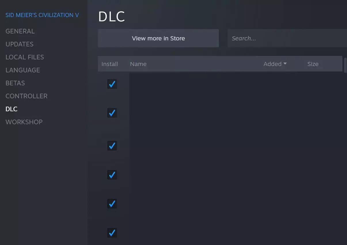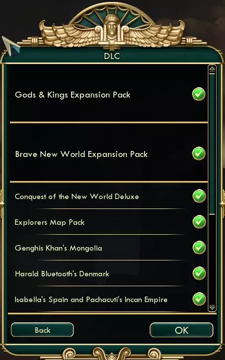 这些选项中最有用的是能够切换《美丽新世界》和《神与王》扩展包。这些扩展包会直接影响你下一场新游戏将运行的《文明5》版本,这对某些可能只能在特定《文明5》版本中解锁的成就有直接影响。 换句话说,有些成就是只能在《文明5》原版基础游戏中解锁的,有些成就可能只能在《神与王》游戏中解锁,最后《美丽新世界》也有其专属成就。 你可以通过在Steam库中进入《席德·梅尔的文明5》的属性页面,查看自己拥有的确切DLC包和内容清单。了解自己是否拥有解锁特定成就所需的内容是很有用的。右键点击并打开【属性...】对话框选项后,从屏幕左侧的菜单中选择【DLC】。