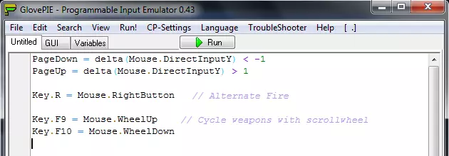 使用GlovePIE让你的Xbox 360(或许还有Xbox ONE)手柄或其他XInput兼容手柄适配《 Carmageddon Max Pack》 步骤: 你需要GlovePIE,这是一款免费软件。 下载并解压后,运行GlovePie.exe,然后将以下内容复制粘贴到GlovePIE中: Key.NUMPAD8 = xinput.RightTrigger Key.NUMPAD8 = xinput.LeftStickY > 0.7 Key.NUMPAD2 = xinput.LeftTrigger Key.NUMPAD2 = xinput.LeftStickY < -0.7 Key.NUMPAD4 = XInput.LeftStickX < -0.3 key.NUMPAD6 = XInput.LeftStickX > 0.3 var.Inverted = false //设置右摇杆反转偏好(True或False) var.dz = 0.3 // 0.0 - 1.0 var.spd = 26 // 0 - 100 if Xinput1.RightStickY < -(var.dz) or Xinput1.RightStickY > (var.dz) Mouse.DirectInputY = 鼠标.DirectInputY - (变量.速度)*(Xinput1.右摇杆Y) 结束条件 如果 Xinput1.右摇杆X < -(变量.死区) 或 Xinput1.右摇杆X > (变量.死区) 鼠标.DirectInputX = 鼠标.DirectInputX + (变量.速度)*(Xinput1.右摇杆X) 结束条件 //设置死区(值在0到1之间) 变量.左死区X = 0.30 变量.左死区Y = 0.30 变量.右死区X = 0.30 变量.右死区Y = 0.30 /*如果 Xinput.摇杆1X < -变量.右死区X 或 Xinput.摇杆1X > 变量.右死区X 则 按键.小键盘4 = 按键.小键盘4 //鼠标.DirectInputX = 鼠标.DirectInputX + 8*死区(Xinput.摇杆1X) 如果 变量.反转 = 真 则{ 如果 Xinput.摇杆1Y < -变量.右死区Y 或 Xinput.摇杆1Y > 变量.右死区Y 则 鼠标.DirectInputY = 鼠标.DirectInputY + 8*死区(Xinput.摇杆1Y) }else{ 如果 Xinput.摇杆1Y < -变量.右死区Y 或 Xinput.摇杆1Y > 变量.右死区Y 则 鼠标.DirectInputY = 鼠标.DirectInputY - 8*死区(Xinput.Joy1Y) } */ 空格键 = xinput.A 上方向键 = xinput.上 下方向键 = xinput.下 Q键 = xinput.左肩键 E键 = xinput.右肩键 W键 = xinput.左肩键和xinput.右肩键 ESC键 = xinput.开始键 Tab键 = Xinput.B C键 = Xinput.返回键 Z键 = Xinput.左摇杆键 回车键 = Xinput.右摇杆键 退格键 = Xinput.X 插入键 = Xinput.Y 使用时请点击运行并启动游戏 此脚本并非完美,其中包含一些未使用的代码,但它的效果应与键盘操作相当(个人认为更优) 哦,你需要在游戏中使用默认按键配置,或者自行修改脚本