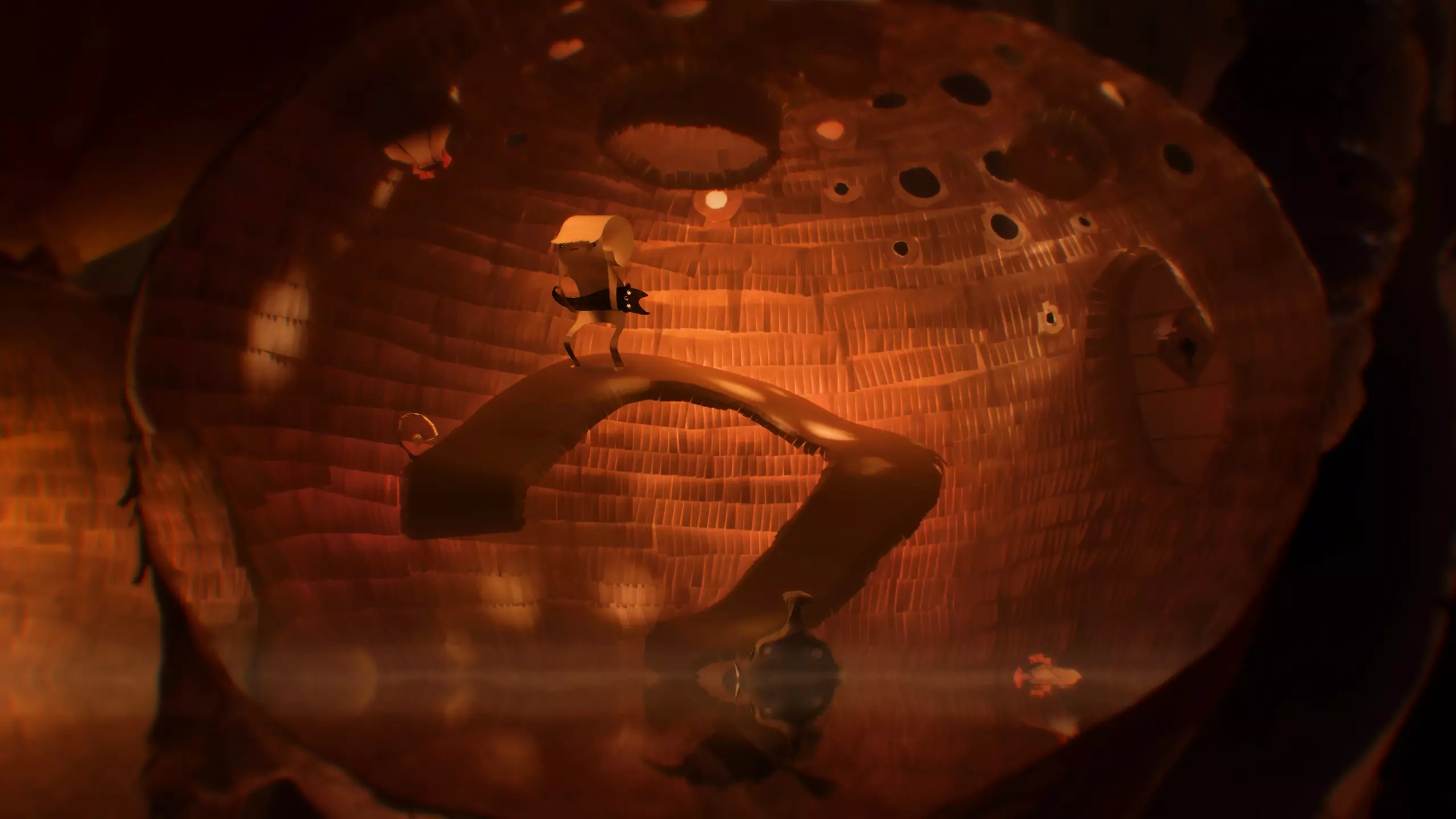 光线 持续向左奔跑,同时躲避燃烧的陨石。 通过此区域后,向下再向右走。 与两个生物互动,桥就会降下。 爬下去,从右到左移除所有种子。 现在穿过桥到另一边。 在桥下,你会注意到一个猫形生物被压在一些碎石下。 移开碎石并与它互动。