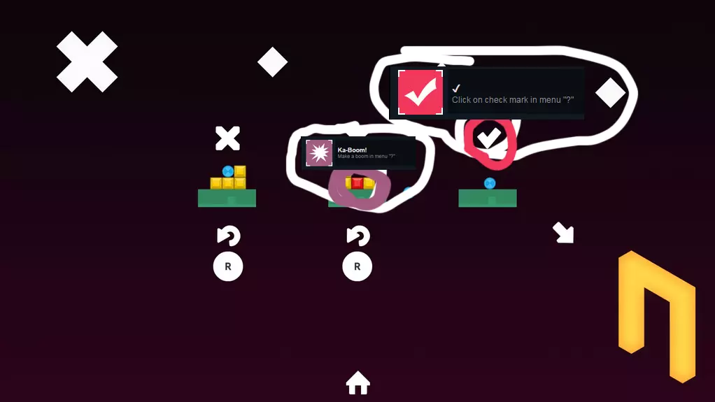 在42关这里,点击勾选框就能获得成就。同时点击中间的红色立方体。现在就完成了。在这个关卡中,要引爆位于中心位置的红色立方体。这样就能获得全部3个成就。