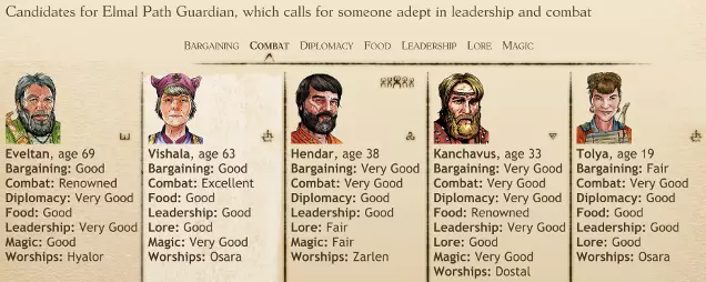 该仪式的官方描述要求由精通战斗与领导能力的人主持。领导能力固然有益,但如果找不到两者兼备的人选,也可以忽略。战斗能力则是必不可少的。仪式中领导能力的不足会略微降低成功几率;而战斗能力的欠缺则可能导致探索者丧命。 大多数仪式只能由与对应神祇性别相同的贵族主持。本仪式是个部分例外:除男性非萨满外,崇拜奥萨拉的女性也可主持艾尔玛尔路径守护者仪式。这体现了奥萨拉与她父亲的亲密关系及相似之处。 艾尔玛尔的信徒在这项探索中自然具备优势;奥萨拉的信徒实际上也享有这一优势。不过,这个加成并不意味着你应该选择埃尔马尔/奥萨拉的信徒,比如,如果多斯塔尔的信徒在战斗方面声名远扬,而你最好的埃尔马尔或奥萨拉战士仅仅是非常优秀。 如果你进行这个仪式是为了增强探索者的能力,那么选择一位你希望加入你的圈子的年轻人。否则,只需从可用的选择中挑选最优秀的战士即可。