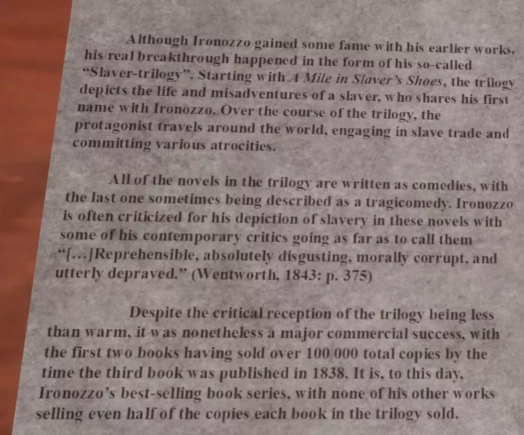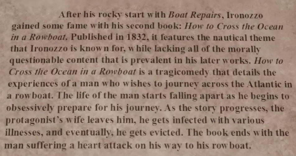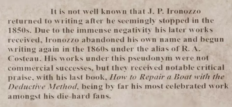 笔记 在车厢内有多个笔记,它们会为你提供关于书籍排列顺序的信息。关键在于找出J. P. Ironozzo所著的书籍以及这些书籍的出版时间。此外,该作者还使用了其他重要的笔名进行过作品发表。 车厢内的多个笔记将帮助你对书籍进行排序。这些笔记包含了关于J. P. Ironozzo所著书籍的顺序以及他的笔名的提示。