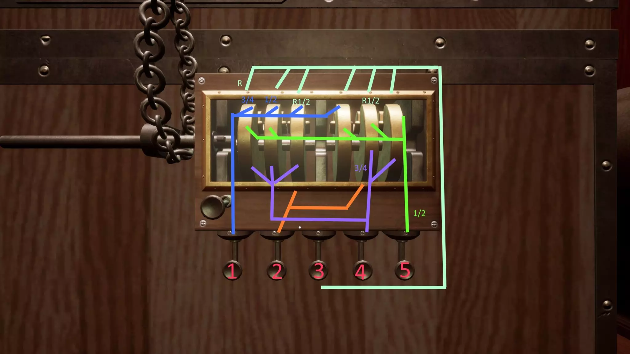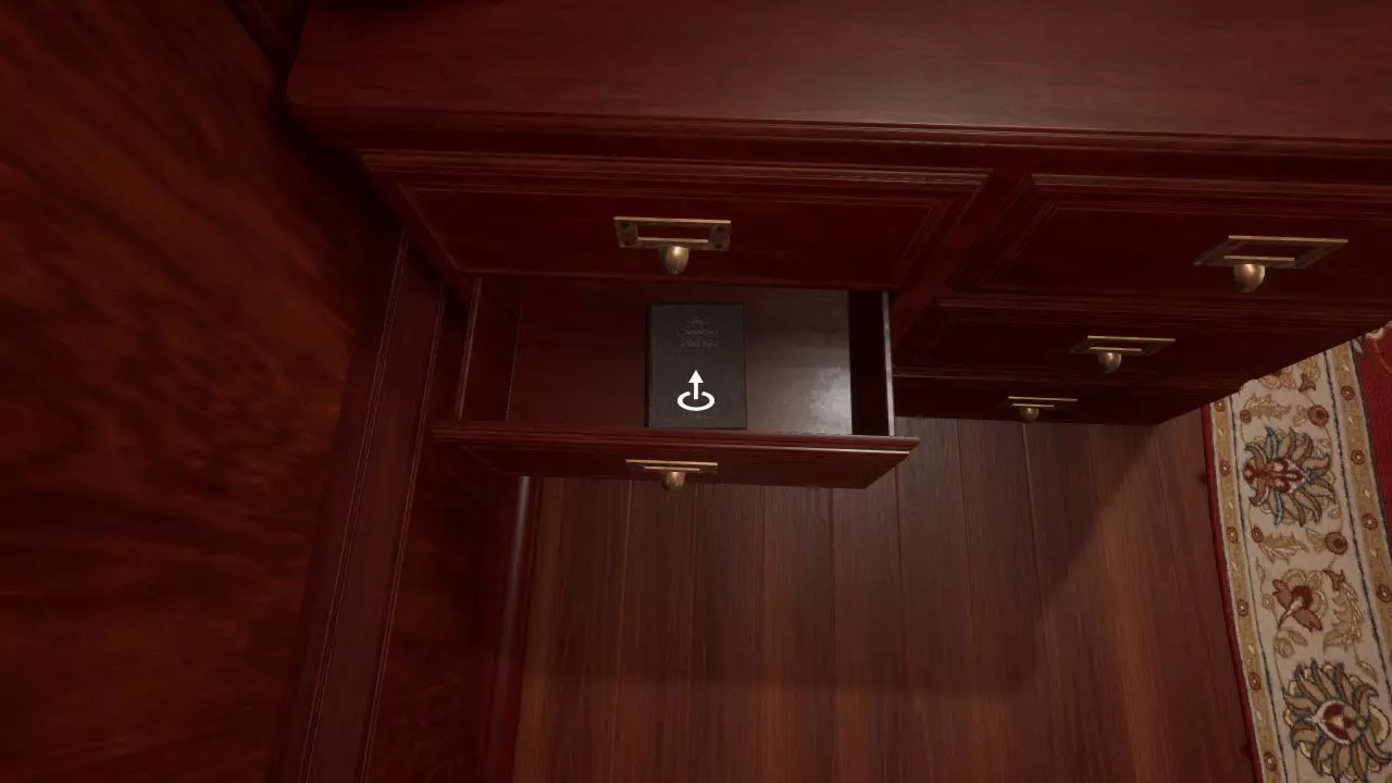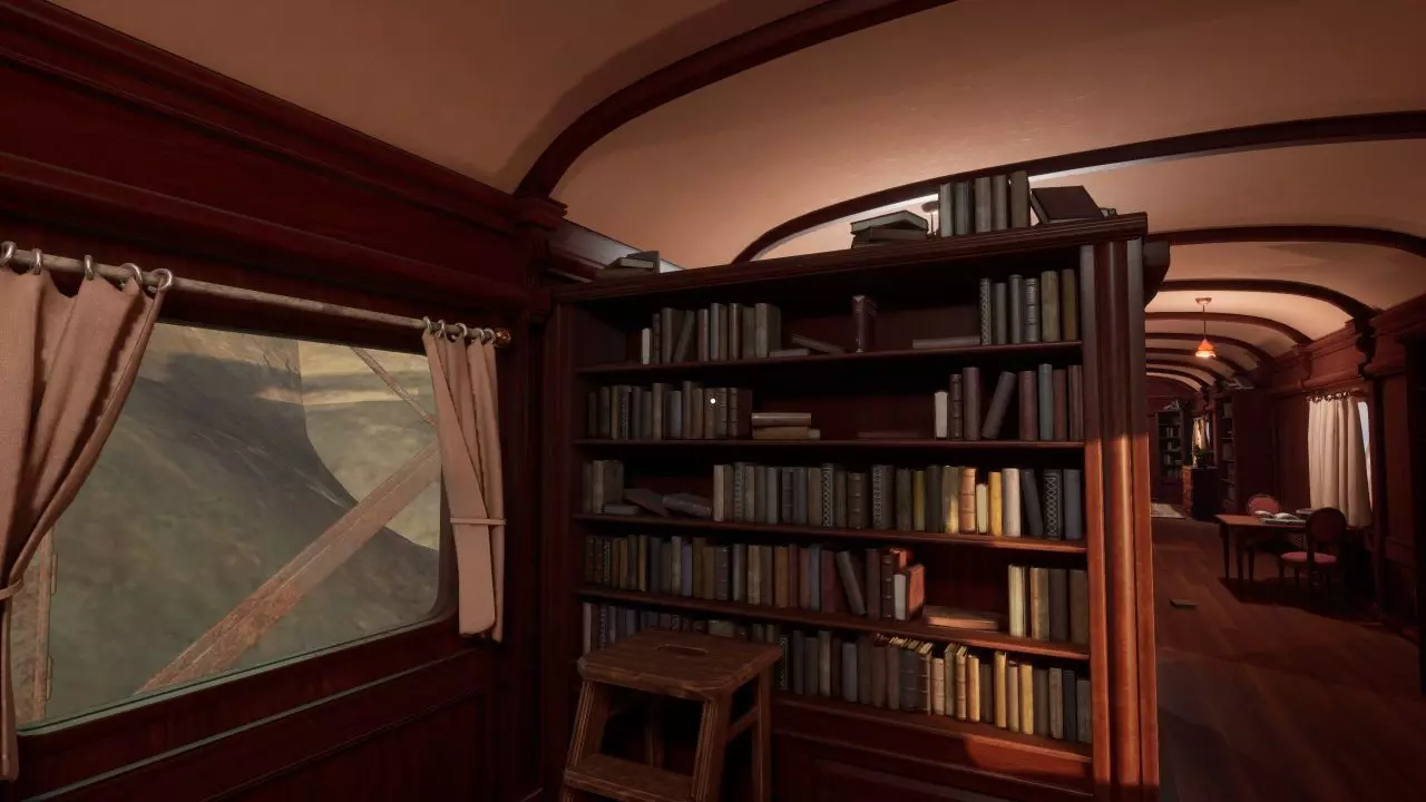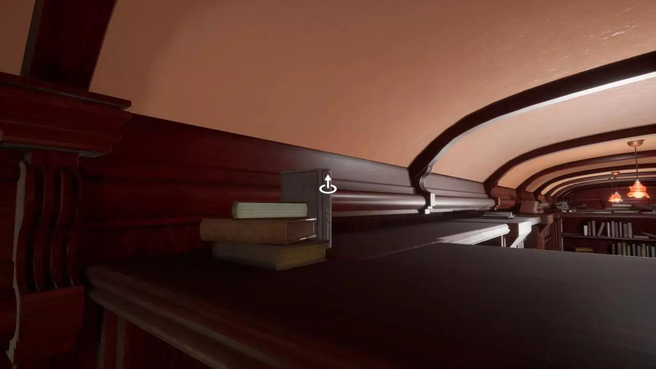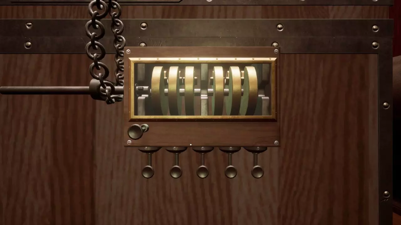 箱子 在游戏最开始,你就能找到一个装有所需书籍之一的箱子。要打开箱子,必须调整机关,使插销能够完全滑过整排。 在第一节车厢中,你会发现一个箱子,里面装有第一本相关书籍。要打开它,你需要调整机关,让插销能够一路滑过。