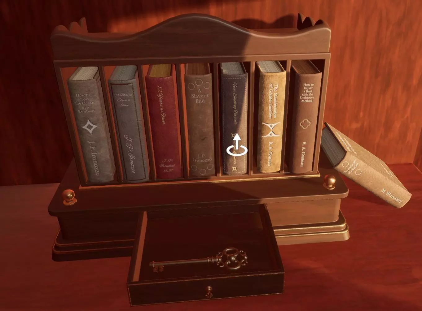 第一本 船只修理 第二本 如何乘划艇渡海 1832 根据笔记和书脊上的信息,可得出以下书籍顺序。 根据笔记和书脊上的日期,你可以按以下方式排列书籍。 隐藏文本 如何乘划艇渡海(1832) 奴隶的一英里(系列第一本) 为奴十二年(1837) 奴隶制度的终结(1838) 四支冒烟的枪管 超凡智慧的显现 如何用演绎法修理船只(最后一本) 书籍 其中一本书在箱子里。 3号 cabin 你需要一把放在架子上的钥匙,然后书就在一个手提包里。从关卡末尾附近的架子上拿起钥匙,然后检查三号车厢的钱包。