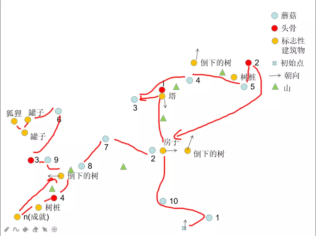 游戏一开始往前(北)走,沿途收集左右两边的蘑菇(1和10); 到房子处收集旁边的蘑菇(2),转动房子里的雕像获得成就; 再往北走,到塔处拿到头骨(1),收集西北方向的蘑菇(3),然后往东北上坡收集蘑菇(4); 接着往东走,收集树桩东南角的蘑菇(5),以及东北角的头骨(2); 往西南方向走,回到房子处(房子较大容易辨认); 从房子处向西走,在树下可以收集到蘑菇(7); 然后向西南走找到倒下的树(在路上可以收集蘑菇8),从树往西南走,拿到头骨(4); 再向西南走,找到树桩,再往西走找到N获得成就; 回到倒下的树,向西北走收集蘑菇(9),在蘑菇西边拿到头骨(3); 向北走,在狐狸前的空地上收集蘑菇(6),完成收集。