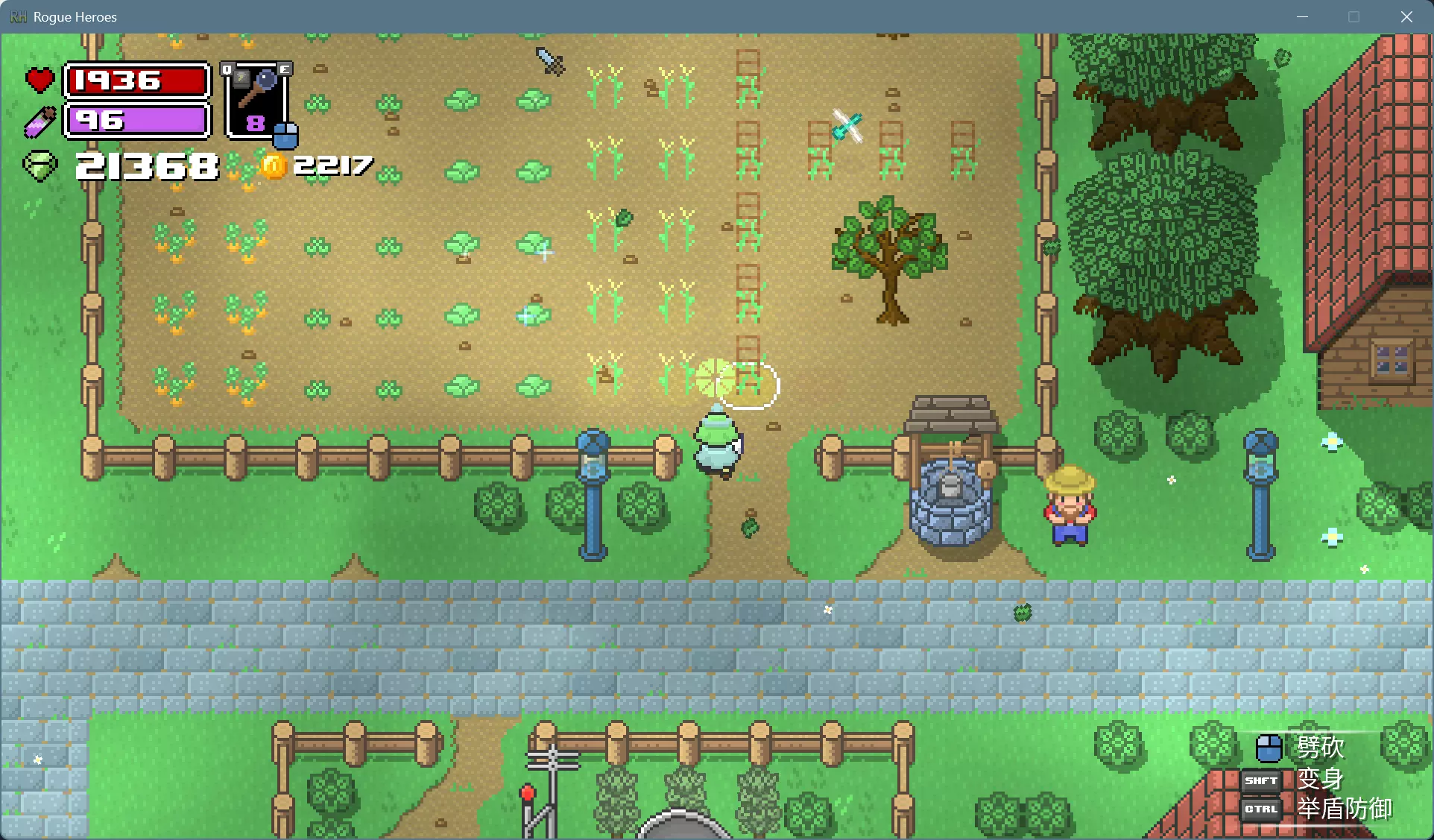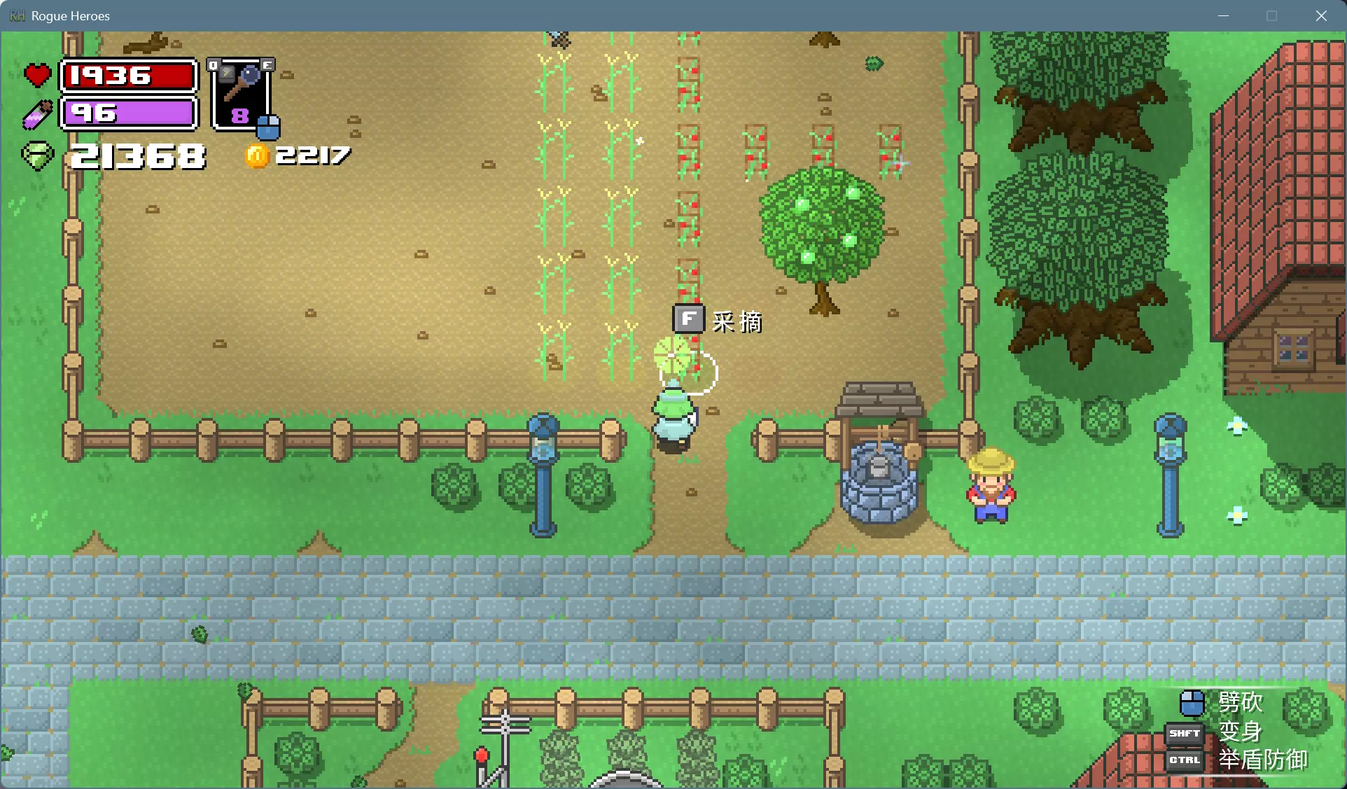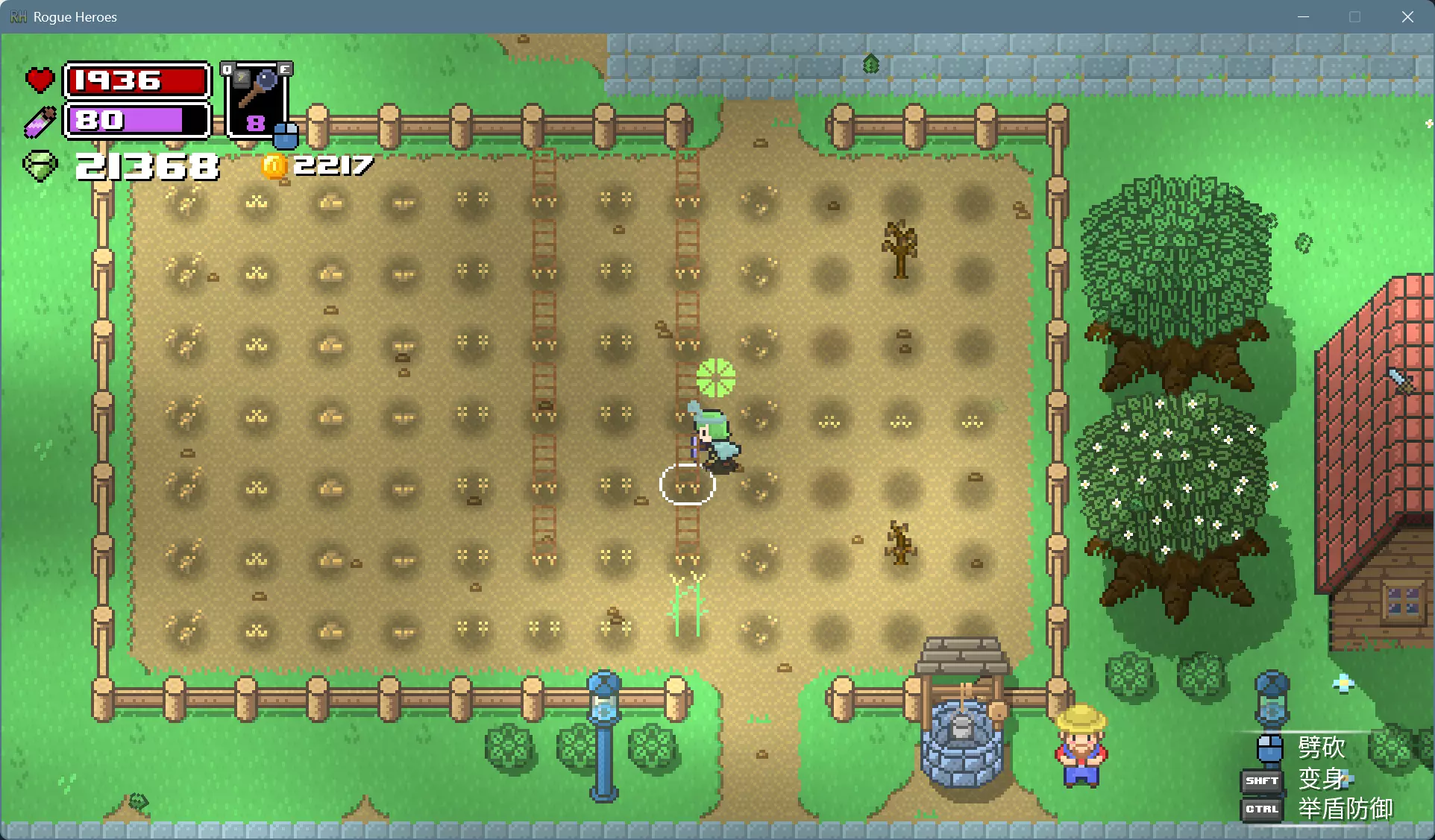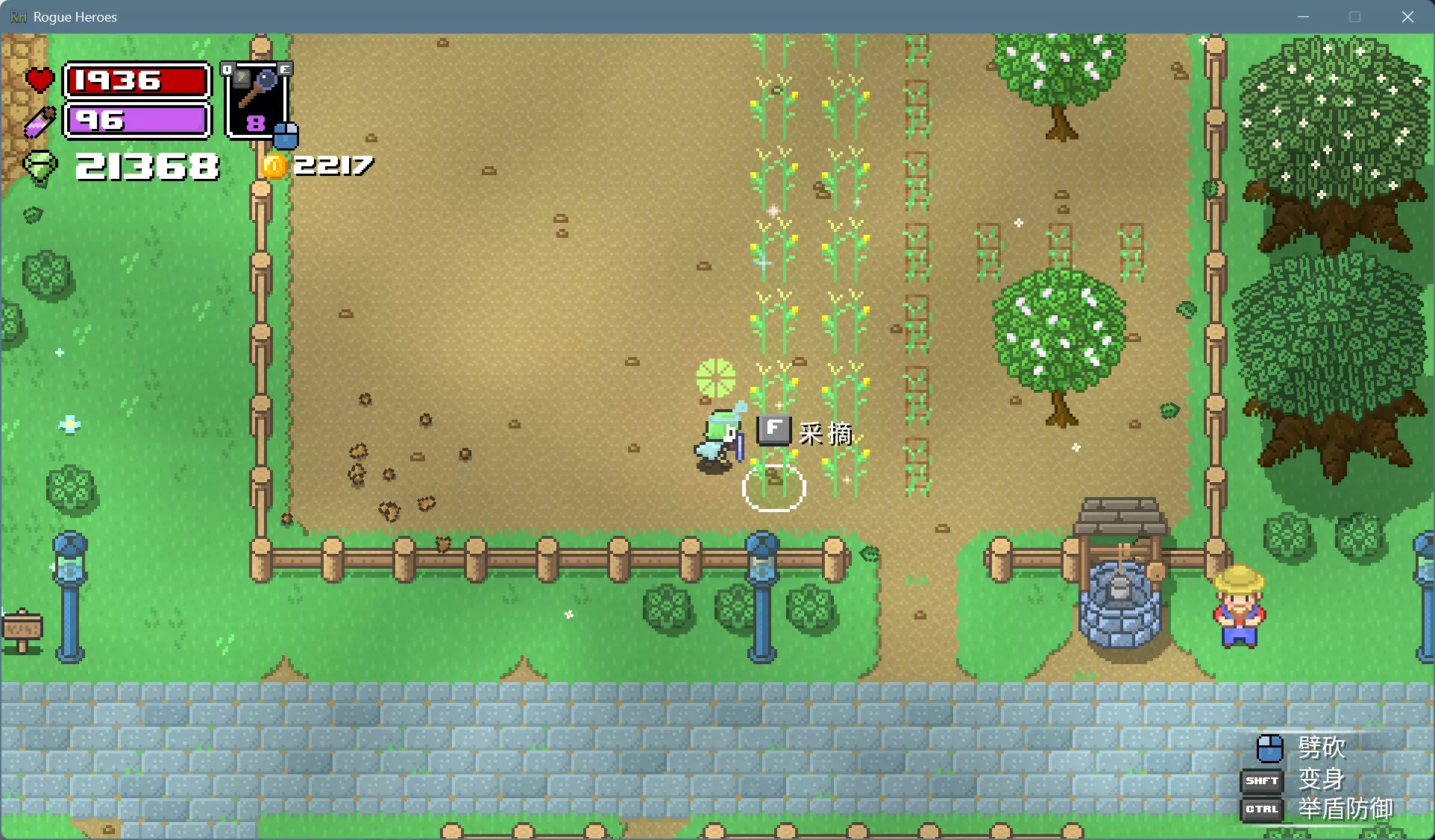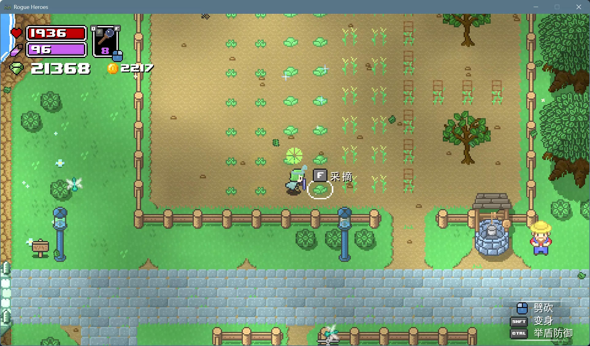 可以用水壶打井水一棵棵浇水,更简便的办法是用法杖施展风暴术,消耗的魔力可以通过睡觉和靠近祭坛恢复。 打雷下雨的时候就可以上床睡觉了,醒来就是晴朗的第二天。如果发现天还黑着,而作物下面的土地已经干了,就再施展一次风暴术回去睡觉。 种植的作物成熟后会有闪光特效,靠近可以采摘。各种作物的生育期和栽培制度不尽相同,前3种只能收获1次,后3种能多次收获。 收获卷心菜