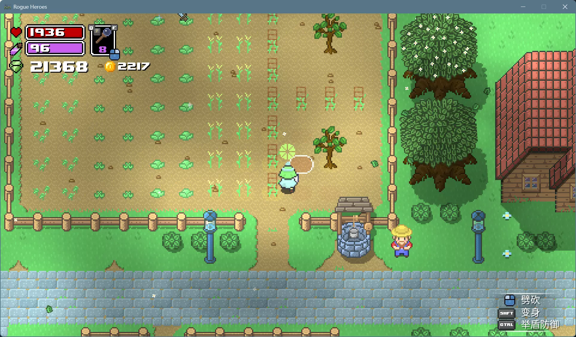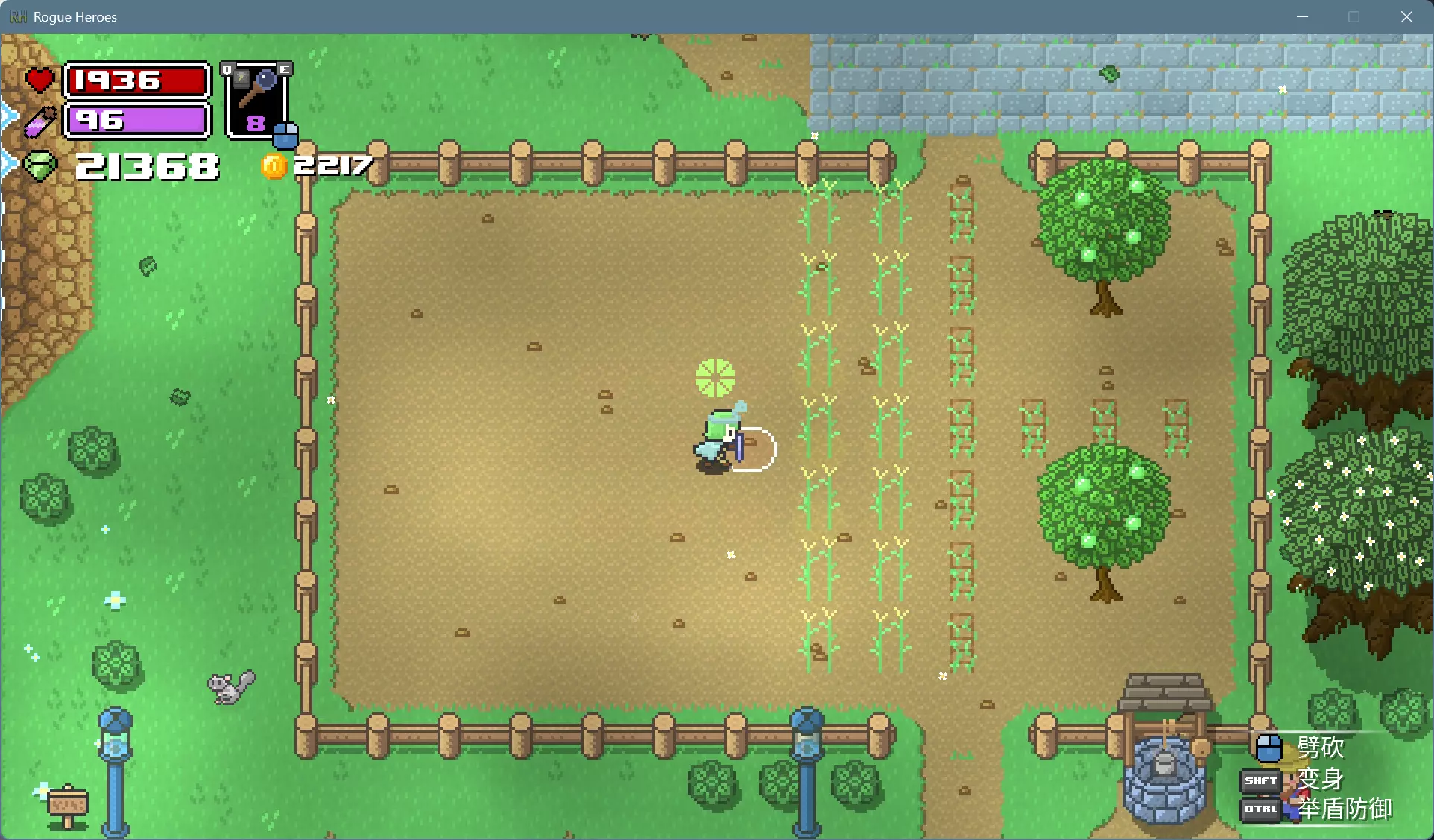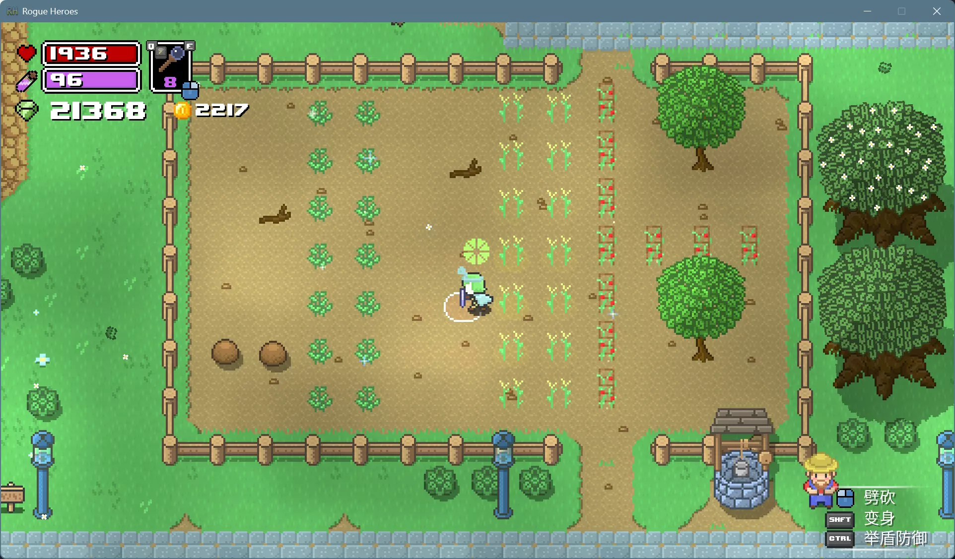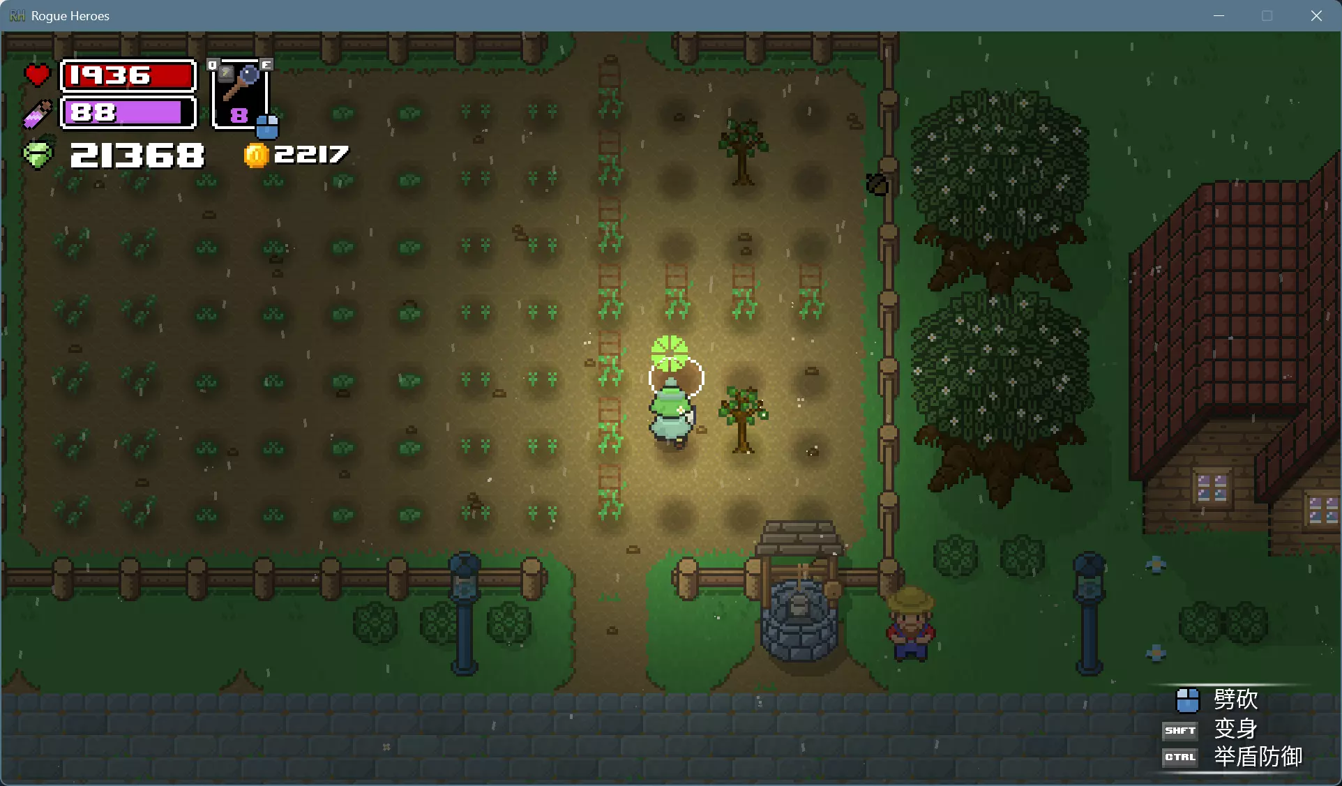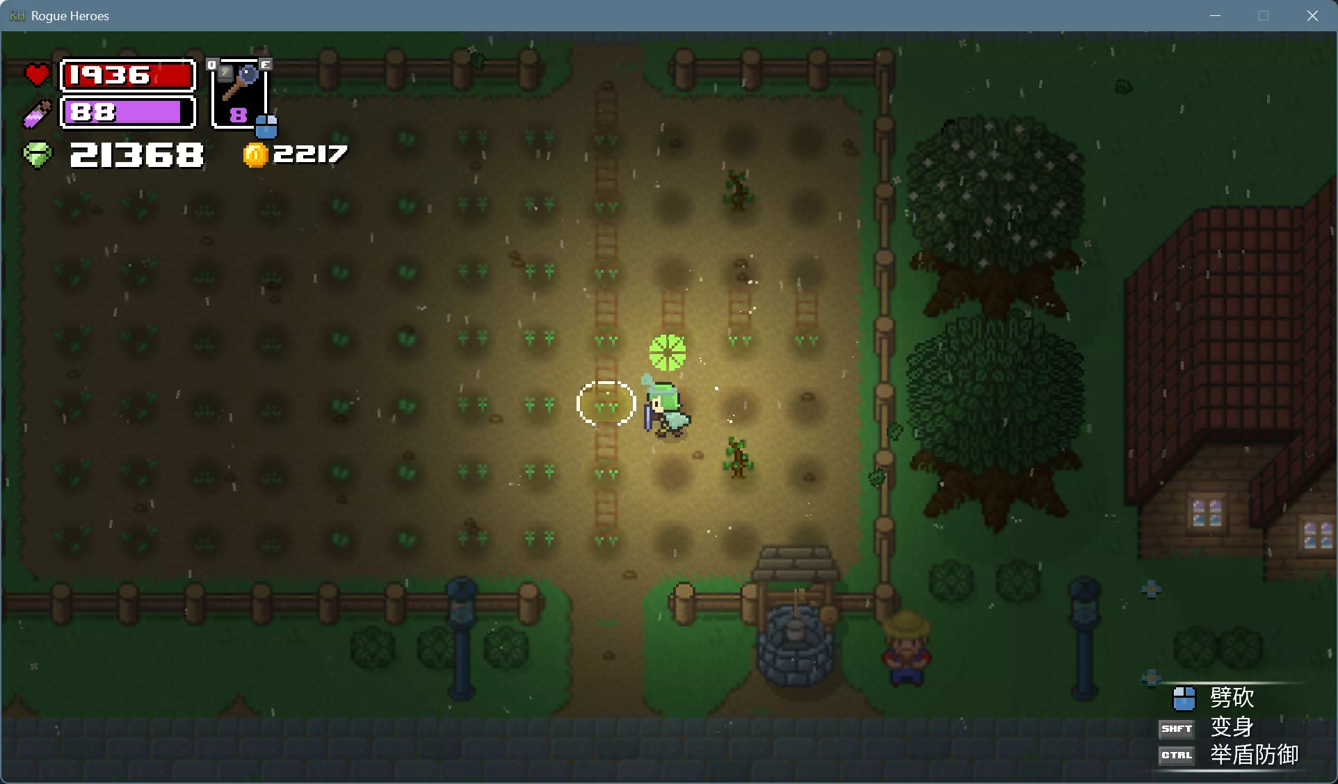 可以用水壶打井水一棵棵浇水,更简便的办法是用法杖施展风暴术,消耗的魔力可以通过睡觉和靠近祭坛恢复。 打雷下雨的时候就可以上床睡觉了,醒来就是晴朗的第二天。如果发现天还黑着,而作物下面的土地已经干了,就再施展一次风暴术回去睡觉。 种植的作物成熟后会有闪光特效,靠近可以采摘。各种作物的生育期和栽培制度不尽相同,前3种只能收获1次,后3种能多次收获。 收获卷心菜