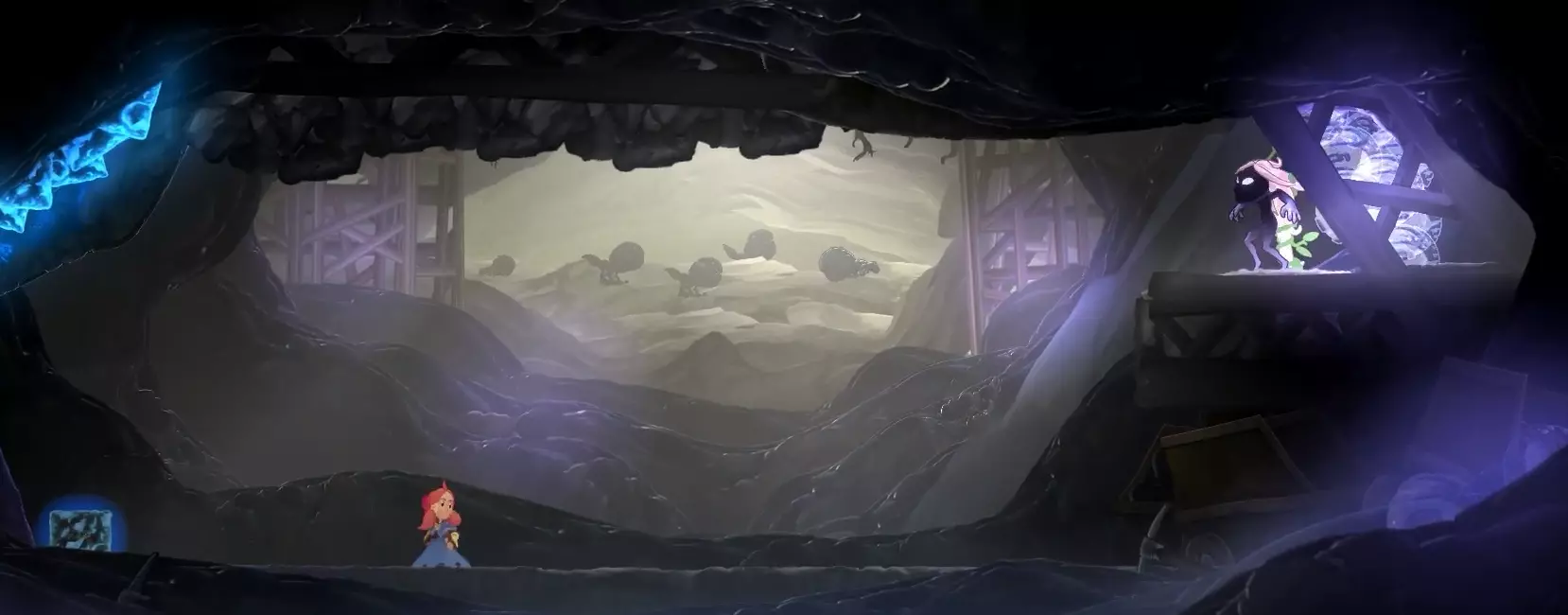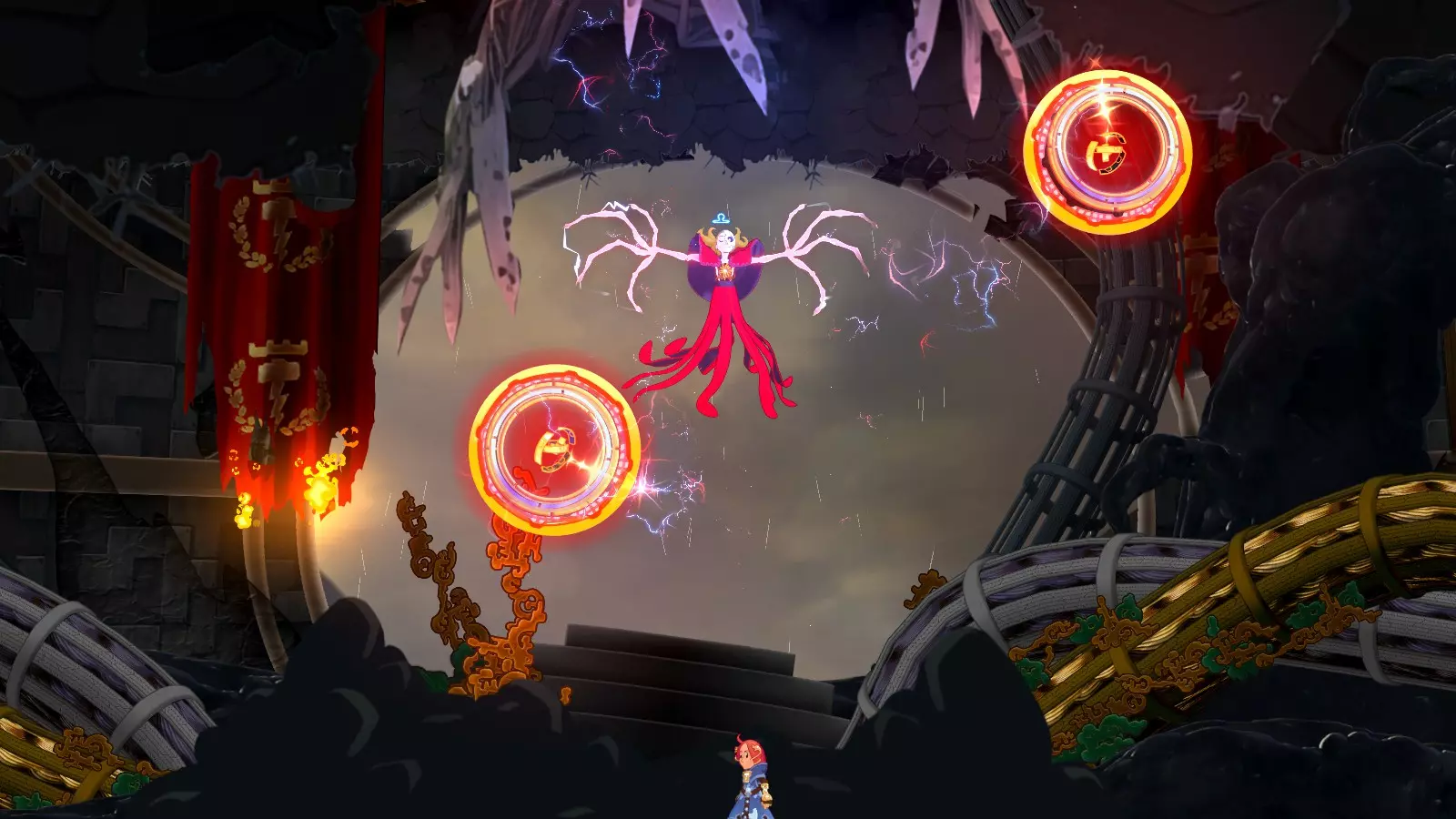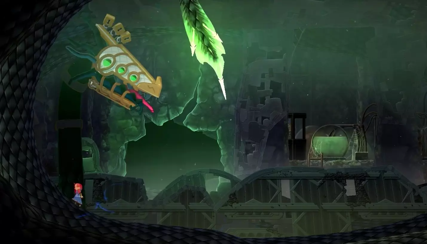 (通关时若未收集全部收集要素和秘密要素,将达成普通结局。) 需要持续用斧头投掷造成伤害,且敌人会从两侧召唤机械自爆兵,因此战斗难度稍高。 之后在第二阶段,需利用磁场移动至 boss 上方,使用下劈攻击才能击破。 (中等难度) 6. 大婶(真结局 boss)