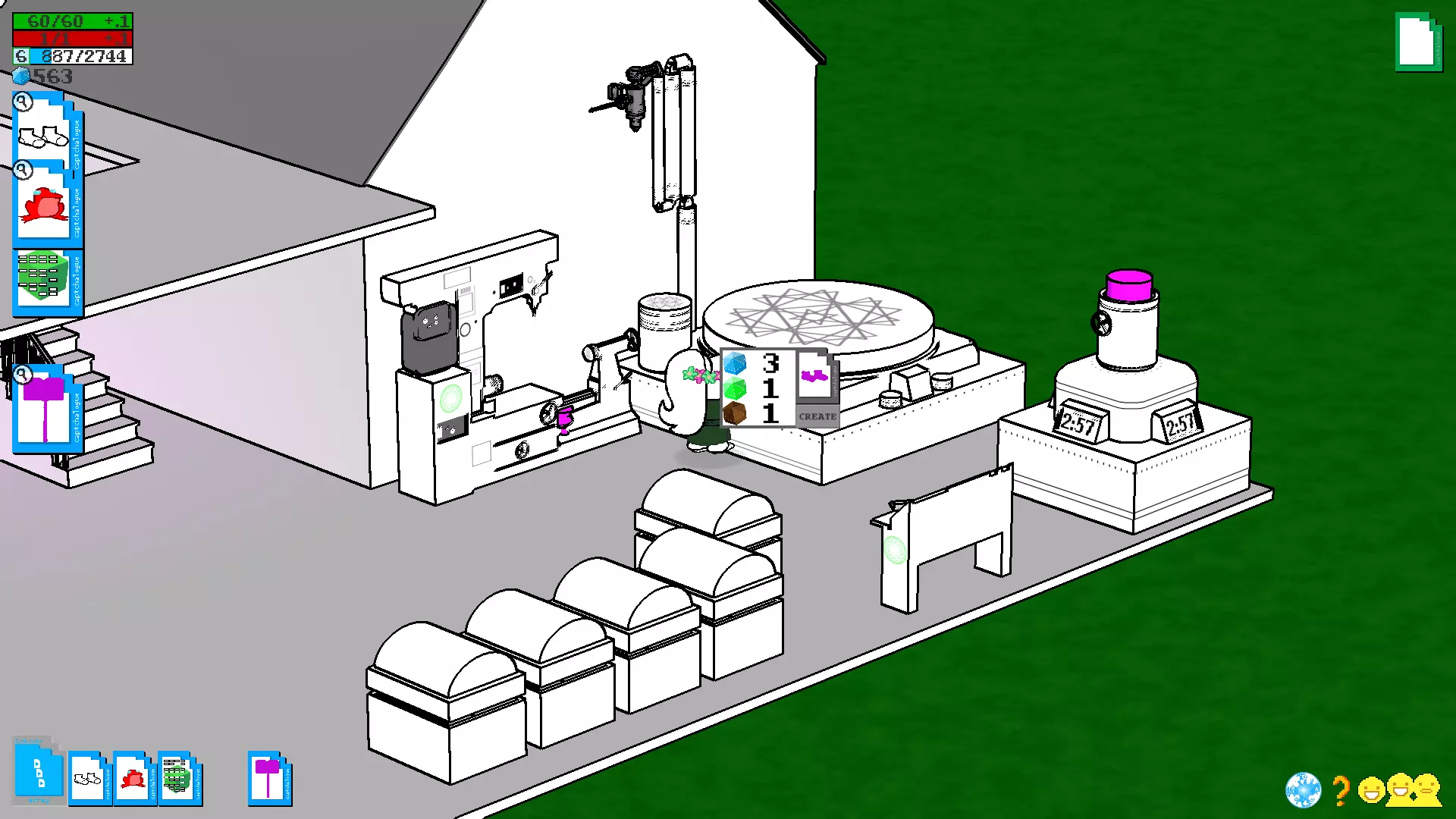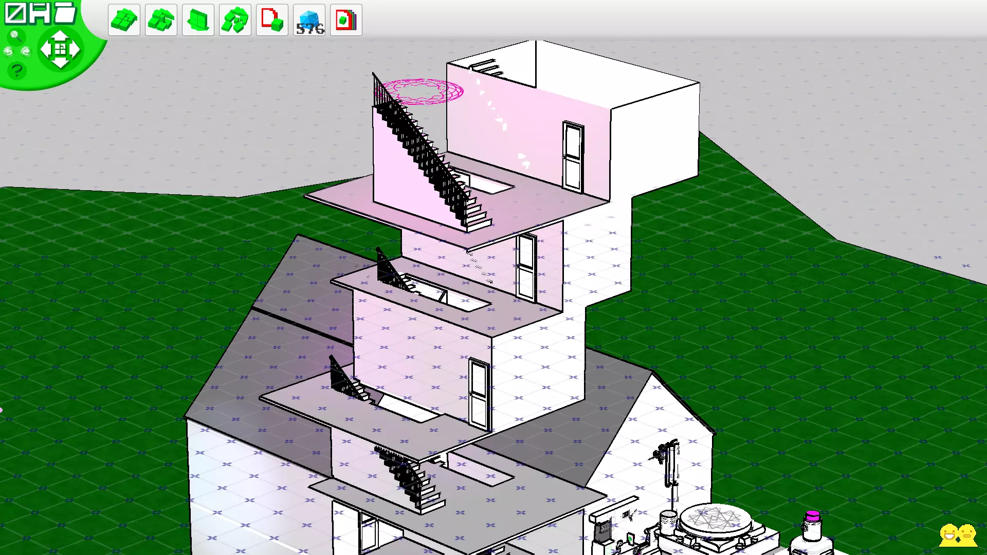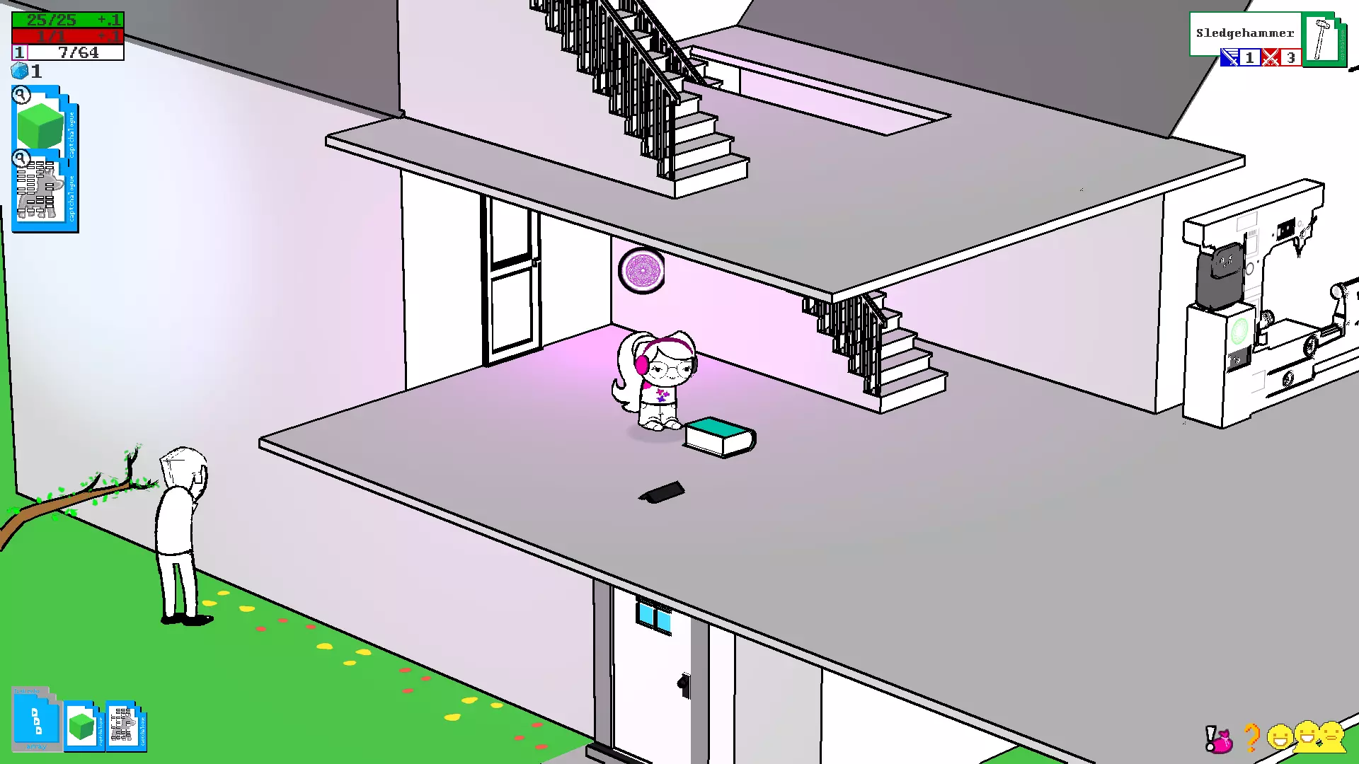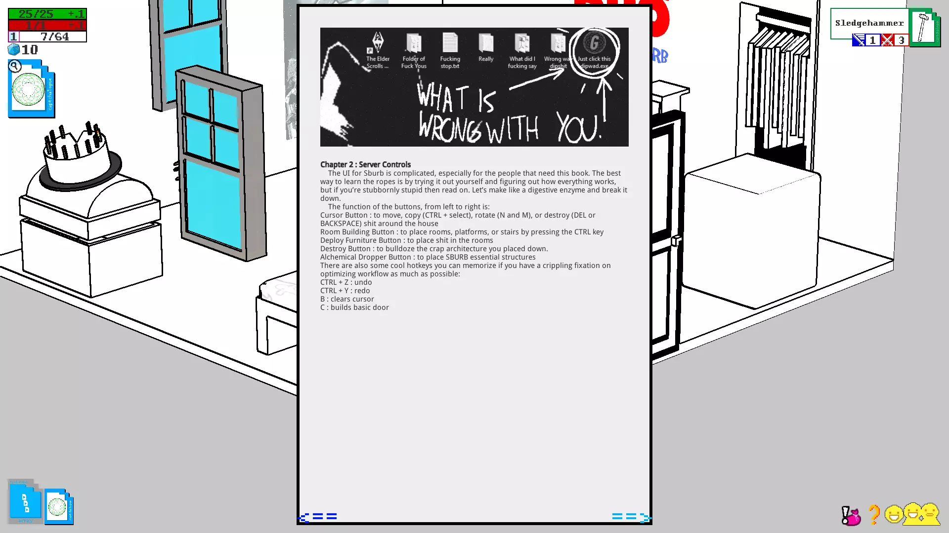 获得期待已久的磁盘后,前往房间,将磁盘插入电脑并进入建造模式。如果和朋友一起玩,那么你将担任服务器玩家的角色,而朋友则是客户端玩家,在建造模式中你将能看到朋友及其房屋(朋友也会有磁盘,并且会成为你的服务器)。单人游戏时,你自己既是服务器又是客户端,因此将在自己的房子里建造。建造 在详细说明如何使用这个家庭模拟器之前,以下是菜单说明: