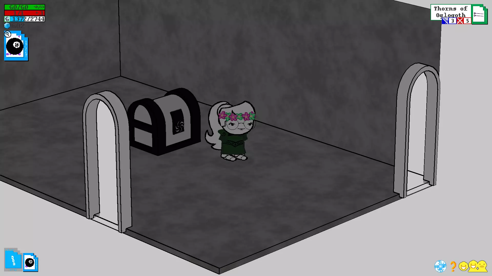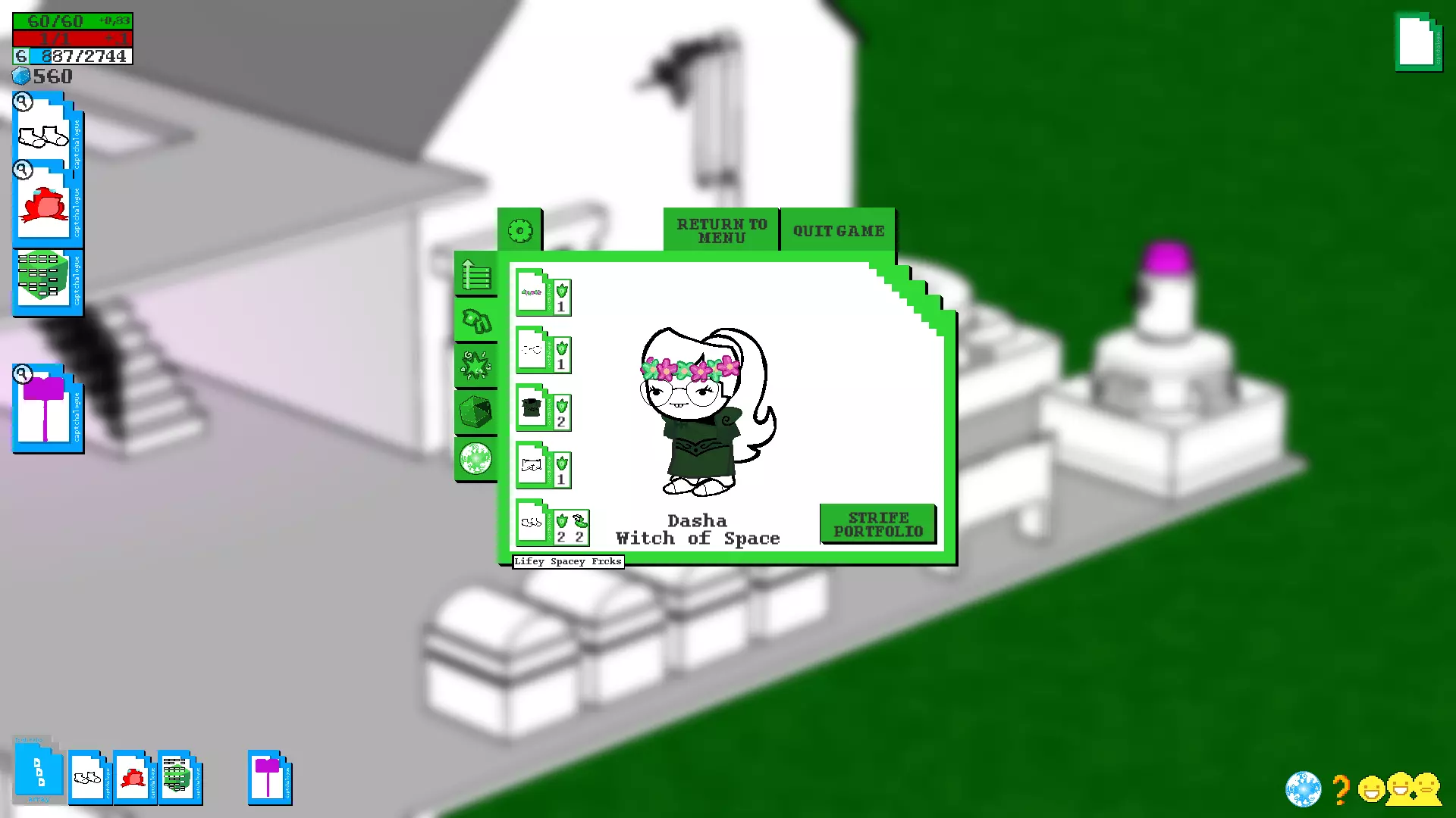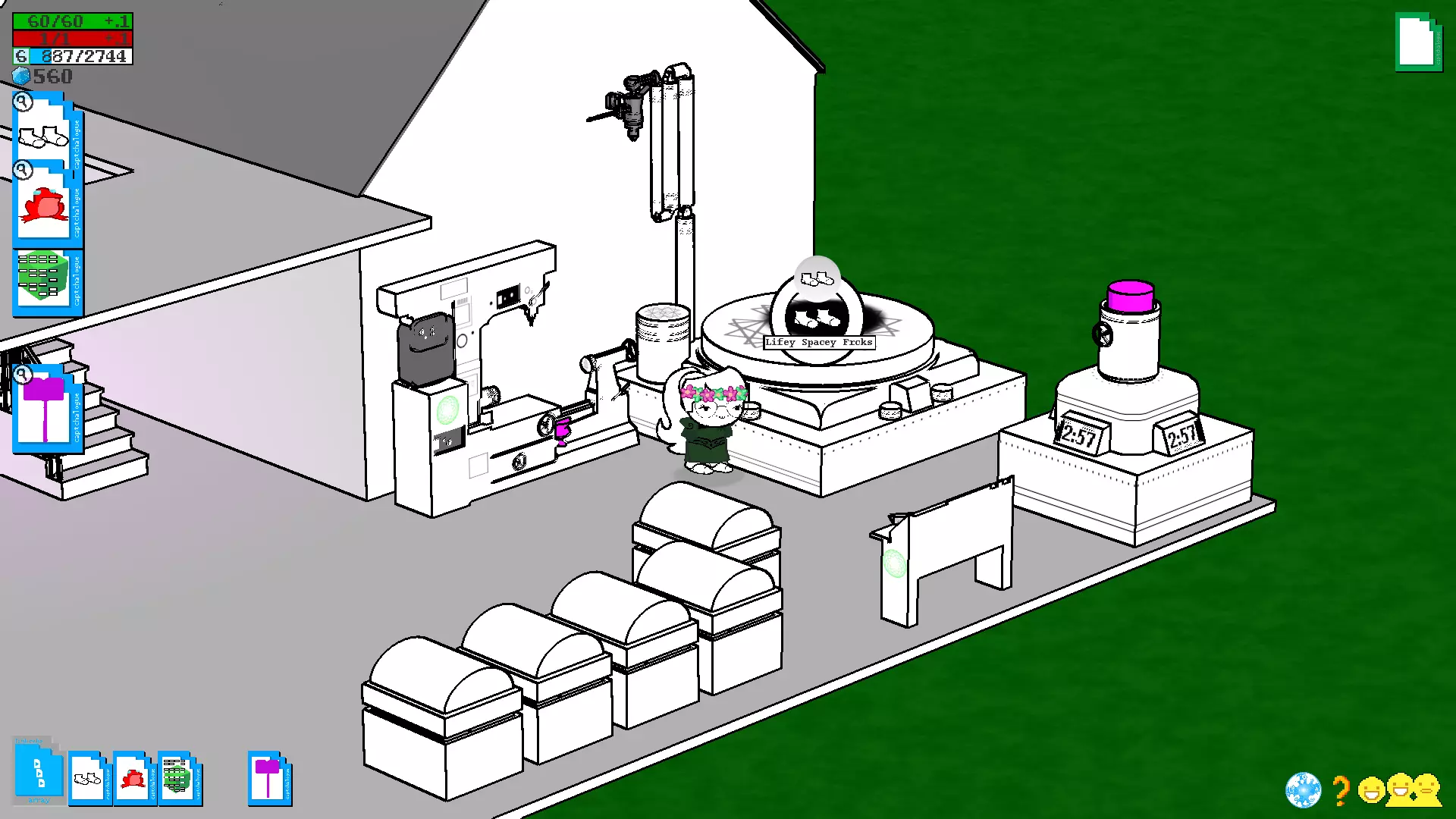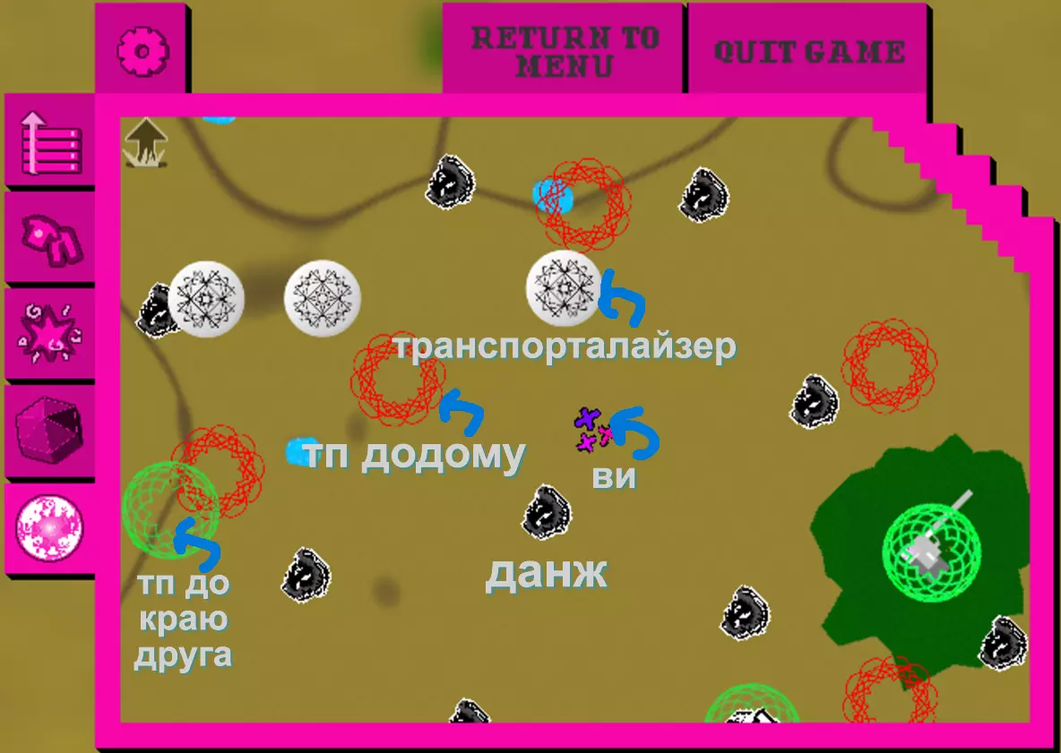 (看看我现在的酷炫靴子) 制作新物品不仅能帮助你提升防御等级,还能改善武器的属性(不过,属性越好,制作该武器的成本就越高……) 4.3. 奇妙标签及其出处 每个物品都有自己的标签,而标签本身又包含特定的属性,具体取决于该物品是武器还是装备。此外,当你创建带有特定标签的物品时,系统会要求你提供具体的材料清单。在第7部分中,你可以看到一个表格,其中列出了哪些物品具有标签以及如何组合这些标签。4^2 核心精灵和原型物品 基础原型物品 精灵 使用物品 对敌人效果 鱿鱼精灵 鱿鱼毛绒玩具、午餐盒、魔法书、海报 脸上的触手、可爱的眼睛 萨萨克精灵 萨萨克 假胡子/眼镜、法师帽 侦探精灵 《问题侦探》海报或“帽子”牌帽子 时尚的外套和帽子 骑士精灵 骑士头盔或盔甲 盔甲(仅对骑士有效) 猫精灵 死猫(白色或黑色) 耳朵、尾巴、猫脸 兔子精灵 空中监狱兔子(毛绒玩具)、兔子比尼帽,邦斯拉默(武器),史莱哲希尔(武器),黄金兔子,兔子耳朵 鸟精灵 死鸟(白色或黑色)翅膀,喙 卡尔精灵 小卡尔 小卡尔的形象——脸,衣服,手套 史莱姆精灵 绿色史莱姆 幽灵弹簧单高跷,海报 史莱姆的脸,弹簧腿(可能无法使用) 飞蛾精灵 灯/熔岩灯 飞蛾的翅膀和外观 达顿精灵 查尔斯·达顿的照片或达顿的诗集 达顿的脸 狗精灵 动物标本狗 耳朵,尾巴,狗脸 公主精灵 大型公主玩偶 公主的粉色连衣裙 小丑精灵 小丑玩偶小丑服装,无损坏 清晰精灵 可通过/item命令添加到自己物品栏的对抗类物品。物品代码 图标 备注 prot7-UP Dio/7up 可能存在故障 protARDA Aradia 无对话 protCAGE Nic Cage 就是尼古拉斯·凯奇 protEQU Equius protERD Eridan protFFRI Feferi protHJEF Hella Jeff protJOJO Star Platinum protKNYA Kanaya protKRKT Karkat protLADR 梯子 嗯,就是个梯子 protLINK CDI Link protNPT Nepeta protSBRO Sweet Bro 无图标,但可使用 protSLLX Sollux protTRZI Terezi 带有龙元素,存在故障 protTVRS Tavros protVSKA Vriska protWGUY Wise Guy大门 要进入您的领地,您需要到达位于您家稍上方的大门。为此,我们需要再次玩“模拟人生”类游戏,并收集大量的装备才能到达那里。 这可以通过多种不同的方式实现,具体取决于您觉得哪种方式方便以及在当前阶段您拥有多少材料,但有个好消息!进入灵界后,你无需直接删除家中所有家具,你可以在家中击杀几只怪物,这样就能获得一些建材(另外,如果你建造的扩建部分足够宽敞,这种方式会为怪物生成提供更多空间。这对你而言是利是弊,由你自己决定)。