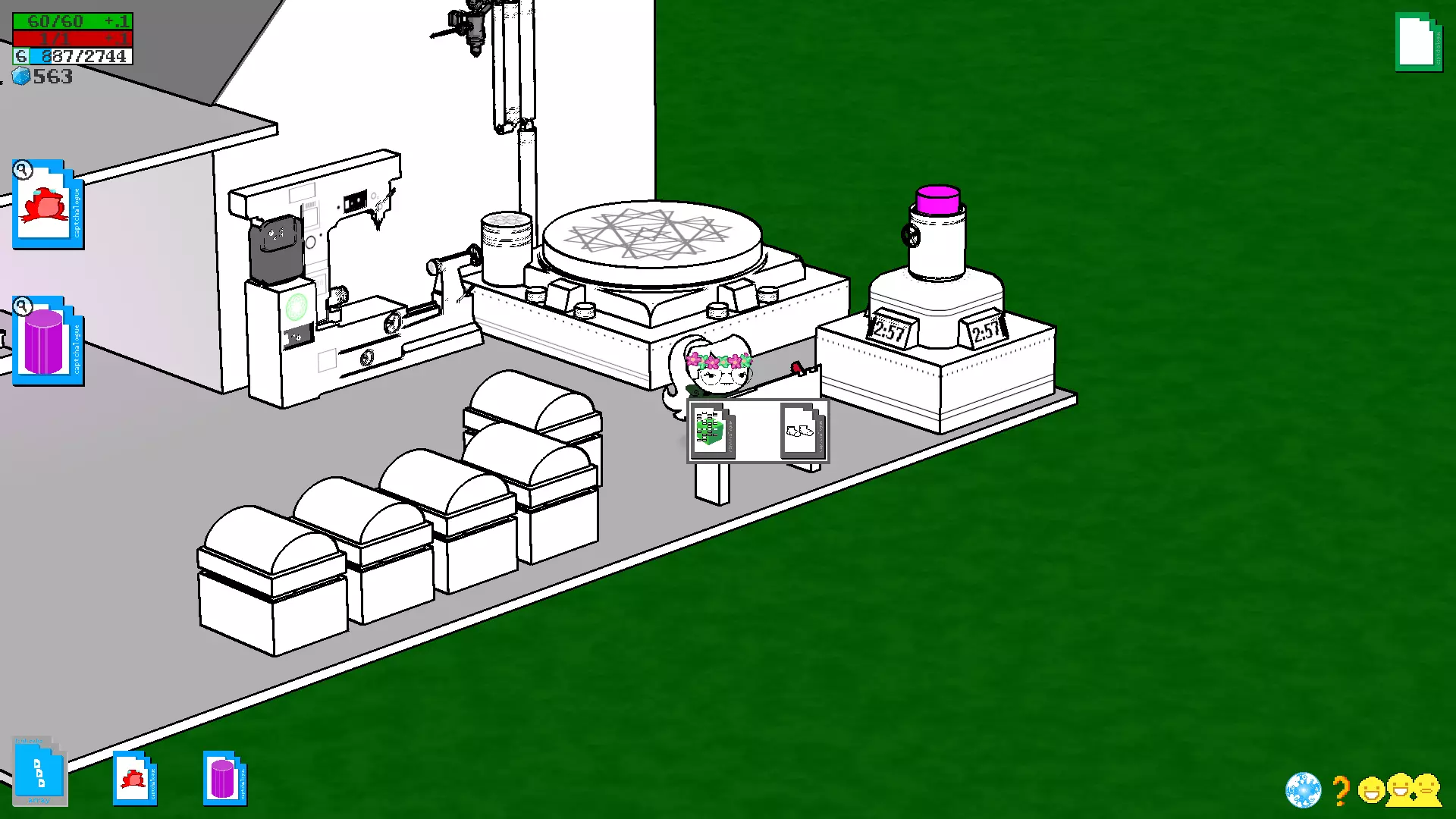 哇呀!你现在处于介质区域。接下来,你的领地将会出现怪物,要消灭它们,你需要一把好武器。关于这一点,下一部分会详细说明。 4. 武器与装备的制作 通常在教程中,制作相关的内容会先讲解,但由于制作需要基础的毛坯,我认为在进入介质区域之前就讲这个没什么意义。所以,我们继续往下看 ==> 4.1.卡片穿孔 这一功能在穿孔矩阵设计器的说明中已经提及,但在进入媒介阶段前,我们对其需求并不迫切。而现在,在进入媒介阶段并能稳定使用基础印刷机后,我们可以充分利用这一功能了。 穿孔功能首先用于物品的杂交,以及在需要时对物品进行复制。一般来说,在图腾雕刻机中执行和使用这些卡片有两种方法,具体取决于卡片的数量(一张或两张)。即使使用相同的物品作为基础,使用不同的方法也会产生不同的结果。有关标签的信息将在4.3小节中说明。单卡合成法(||) 单卡合成法的优势在于,能让原始物品的标签(属性)更好地转移到将由炼金术士创造的物品上。关于合成(我会以袜子为例说明),我们需要三个物品:完全普通的物体(perfectly generic object)、袜子图纸,以及你想要用来组合你的服装/武器等的另一张图纸。 完全普通的物体可以在约翰家你电脑左边的打印机处找到,其数量没有限制,所以你可以按需拿取。 接下来我们前往我们的性能矩阵设计器。点击它会看到两个卡牌插槽:左侧放置带有绿色立方体的卡牌,右侧放置带有袜子图案的卡牌,然后点击“Punch”,这样就能对带有立方体的卡牌进行打孔,并将带有袜子图案的卡牌上的信息记录到该卡牌上。