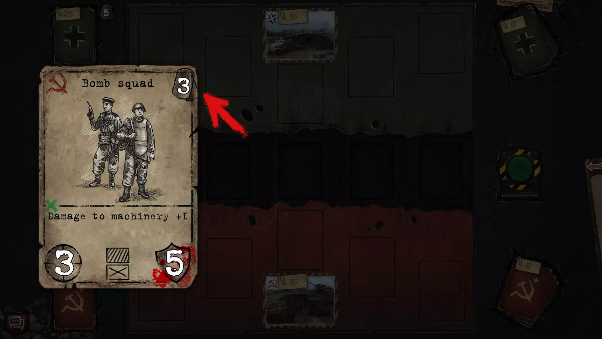 敌人发起攻击。将光标放在你要攻击的卡牌上,可攻击的卡牌会以绿色高亮显示,不可攻击的则显示为红色。 若要攻击敌方卡牌,需先点击你的卡牌,再点击敌方卡牌。注意准备好应对反击,反击伤害取决于相关卡牌的伤害值。 受伤的单位/受损的卡牌在后续回合中生命值会减少,除非对其使用各种治疗或修复手段。
