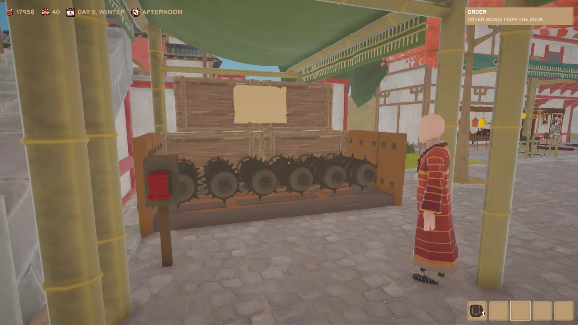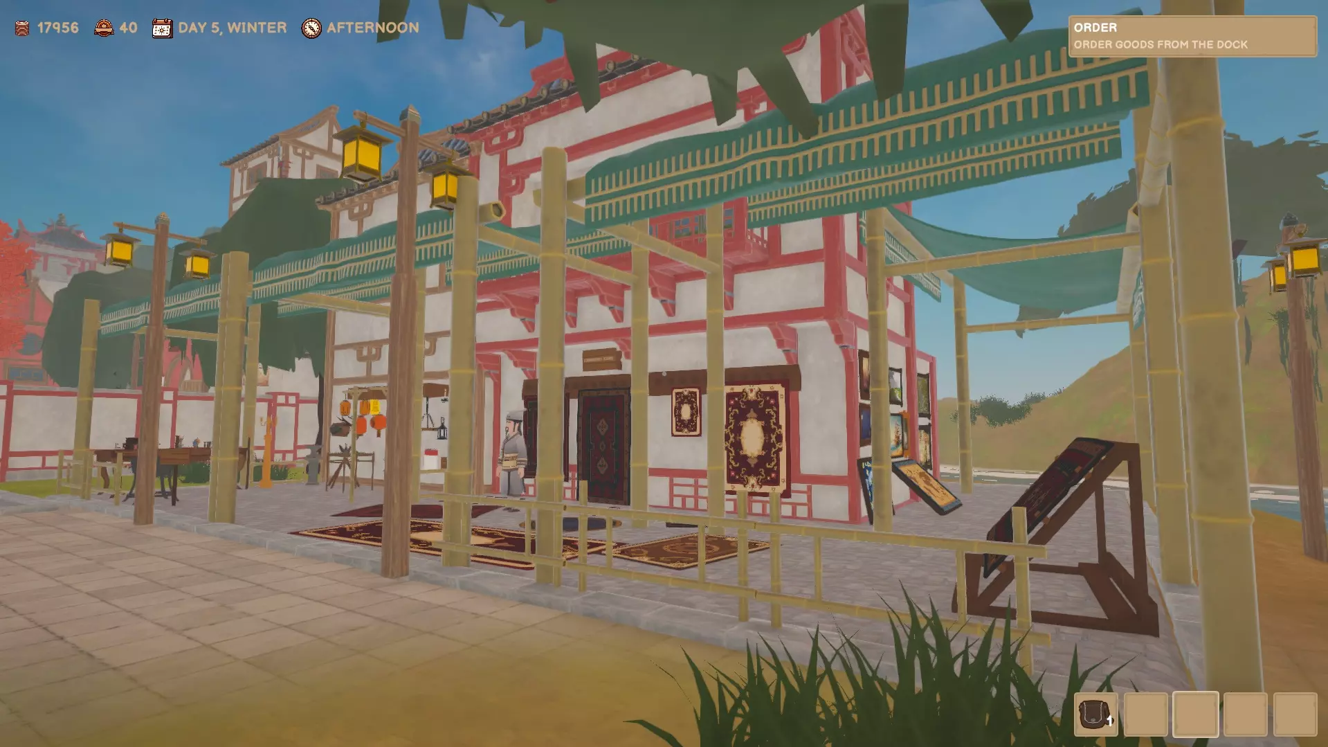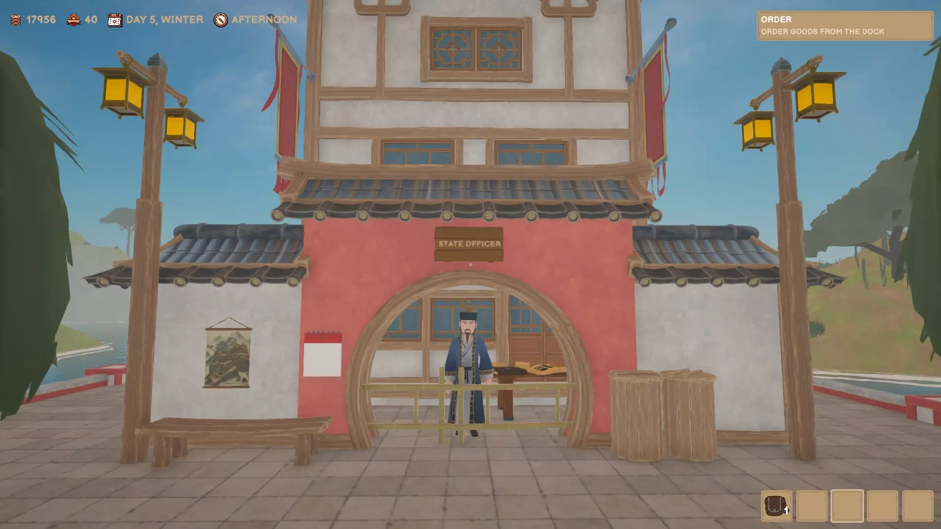 你可以向码头的女性订购货物。订单将于次日早晨在码头送达。你可以向州官员购买许可证,以便能够购买更多种类的产品。 市场/房屋/作坊