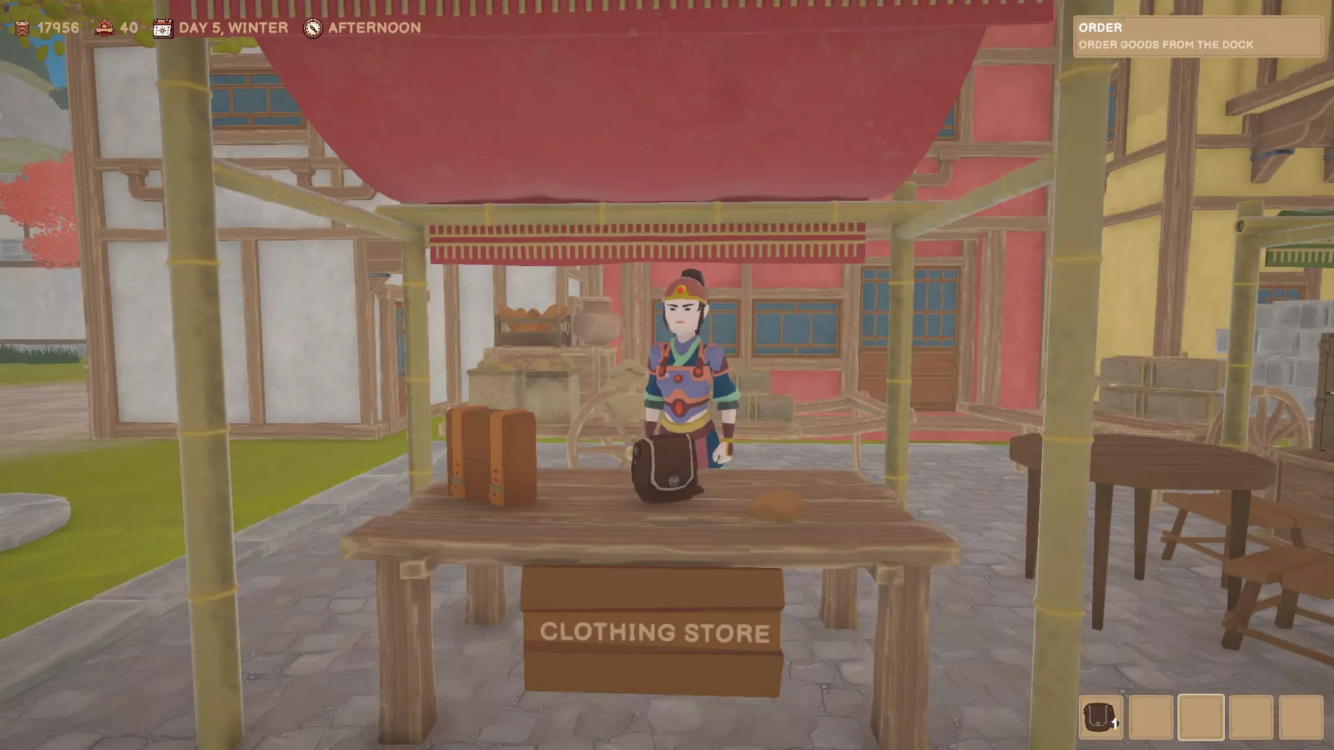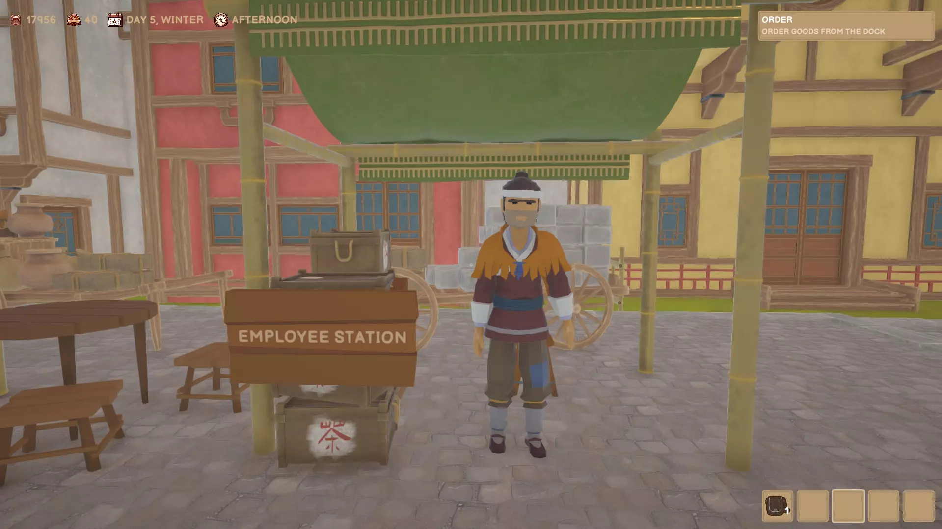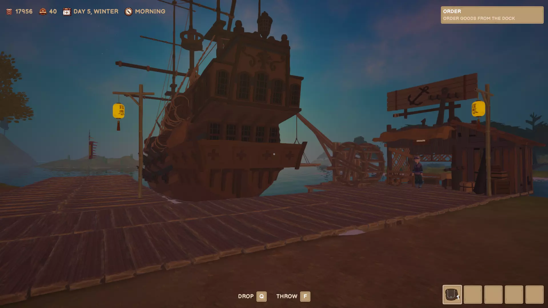 你可以向码头的女性订购货物。订单将于次日早晨在码头送达。你可以向州官员购买许可证,以便能够购买更多种类的产品。 市场/房屋/作坊