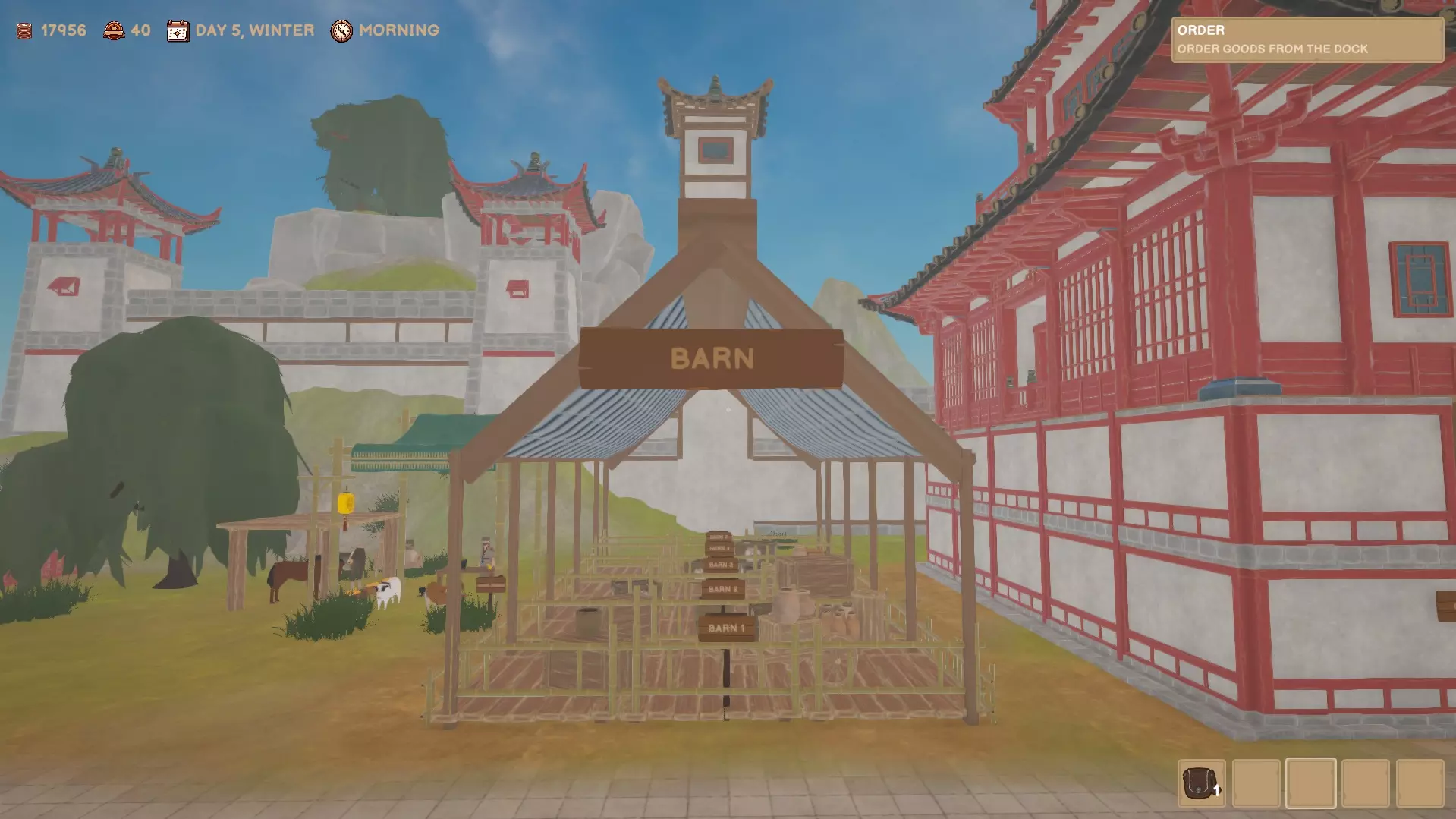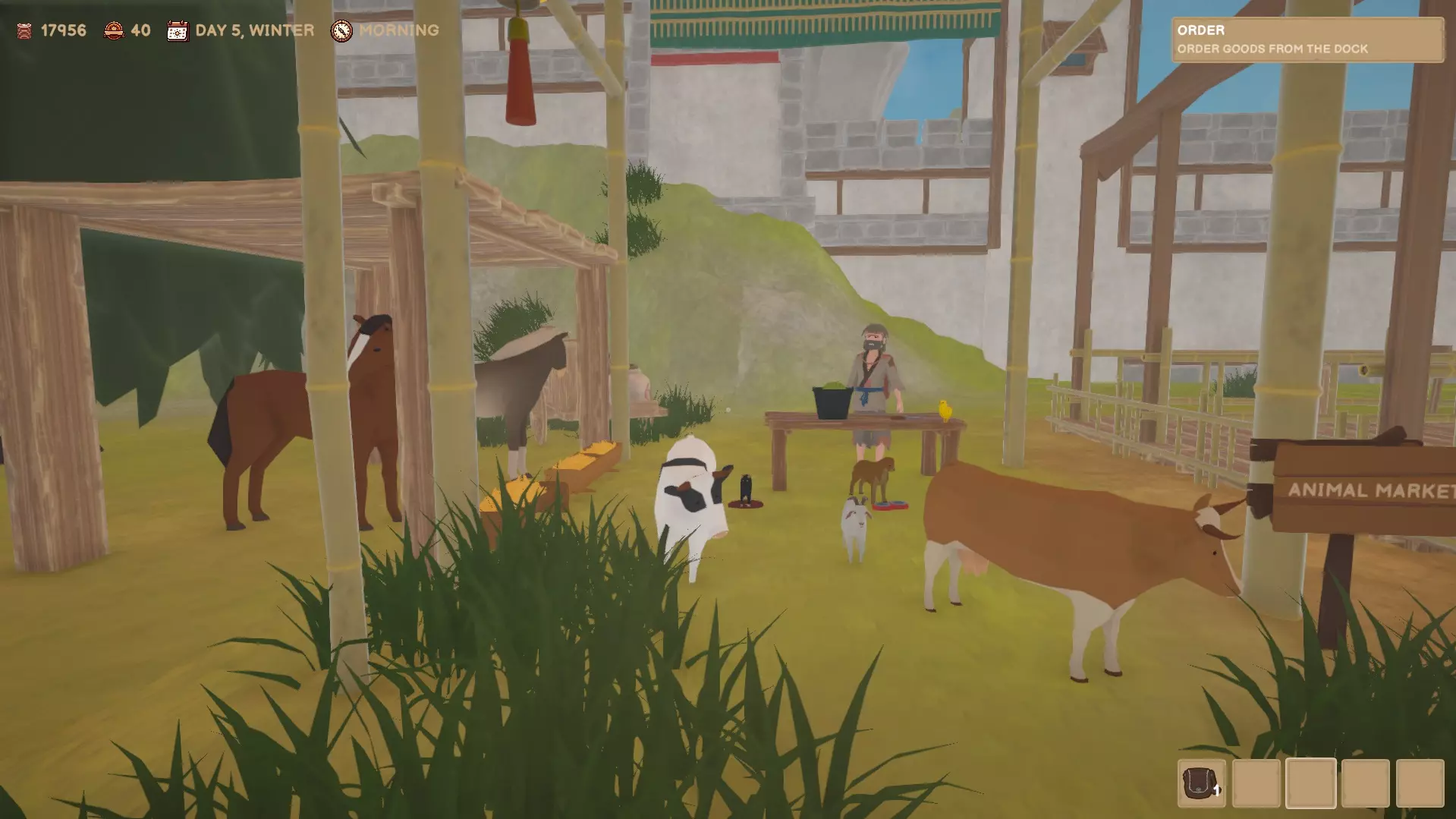 你可以在动物市场购买农场动物以及猫或狗。你也可以在这里购买动物饲料和屠刀。 谷仓
