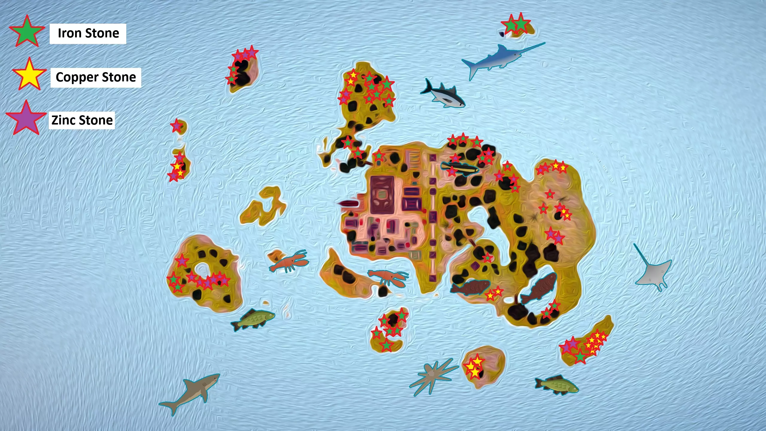 东镇矿石分布图 点击放大图片可查看详情。 绿色星星=铁矿石(3天后重置) 黄色星星=铜矿石(2天后重置) 紫色星星=锌矿石(3天后重置)