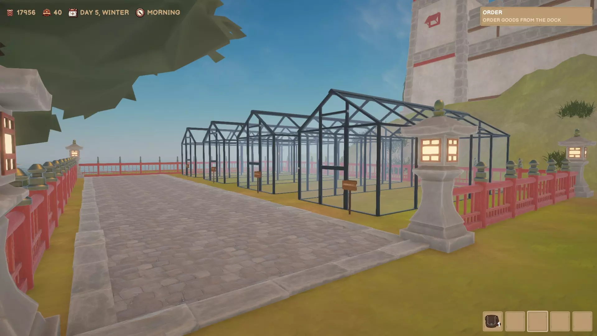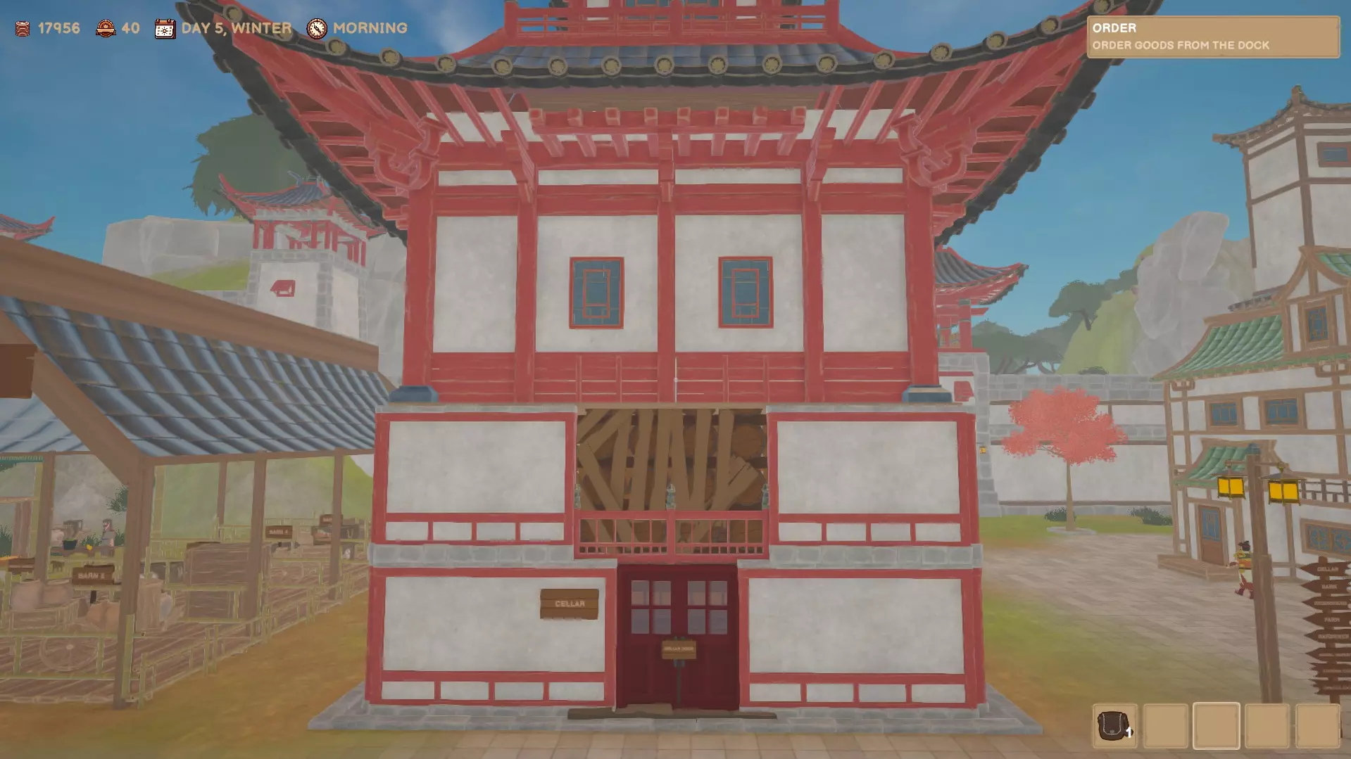 这是你的市场,你可以在这里出售商品。你的家在塔内,你可以通过睡觉来保存进度或直接跳到第二天。你的工坊在塔的二楼,只有在完成市场的第一次升级后才能解锁。 园丁