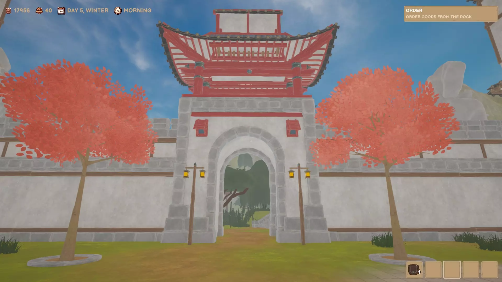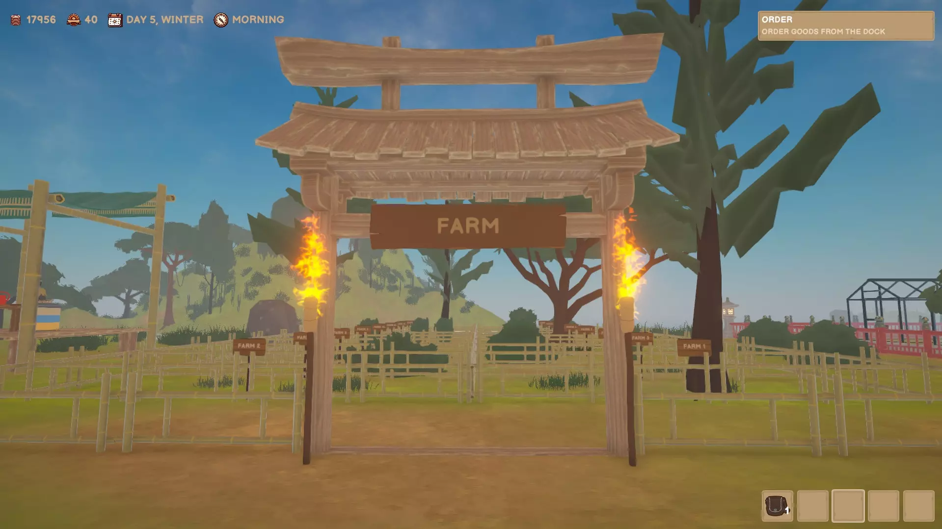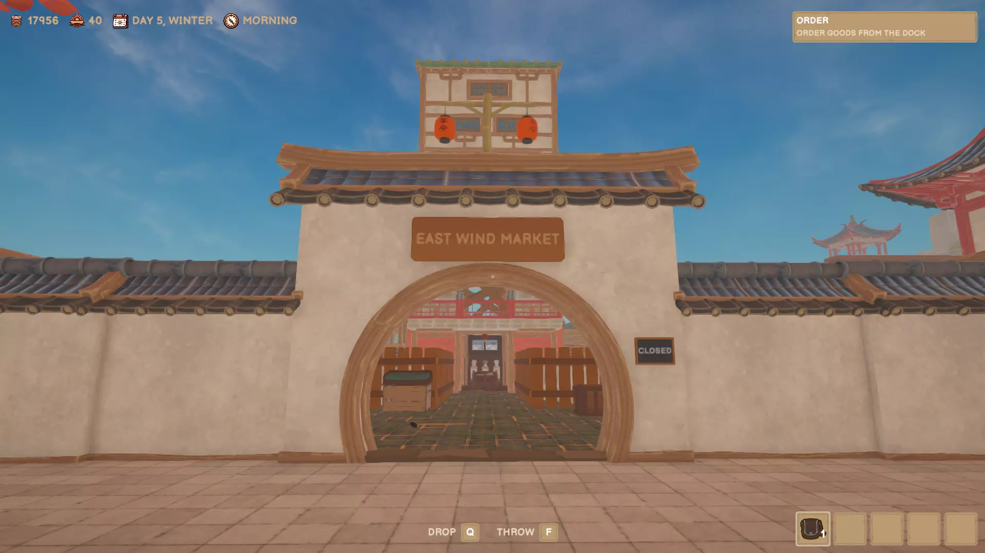 这是通往岛屿其他区域获取更多资源和鱼类的通道。你可以绕着围墙走,但为什么不穿过这个漂亮的大门呢?它很精致。 从这里出去可以找到大型鲤鱼塘,在那里你不仅可以钓鲤鱼,还能获得皮革、骨头和竹子。 服装店