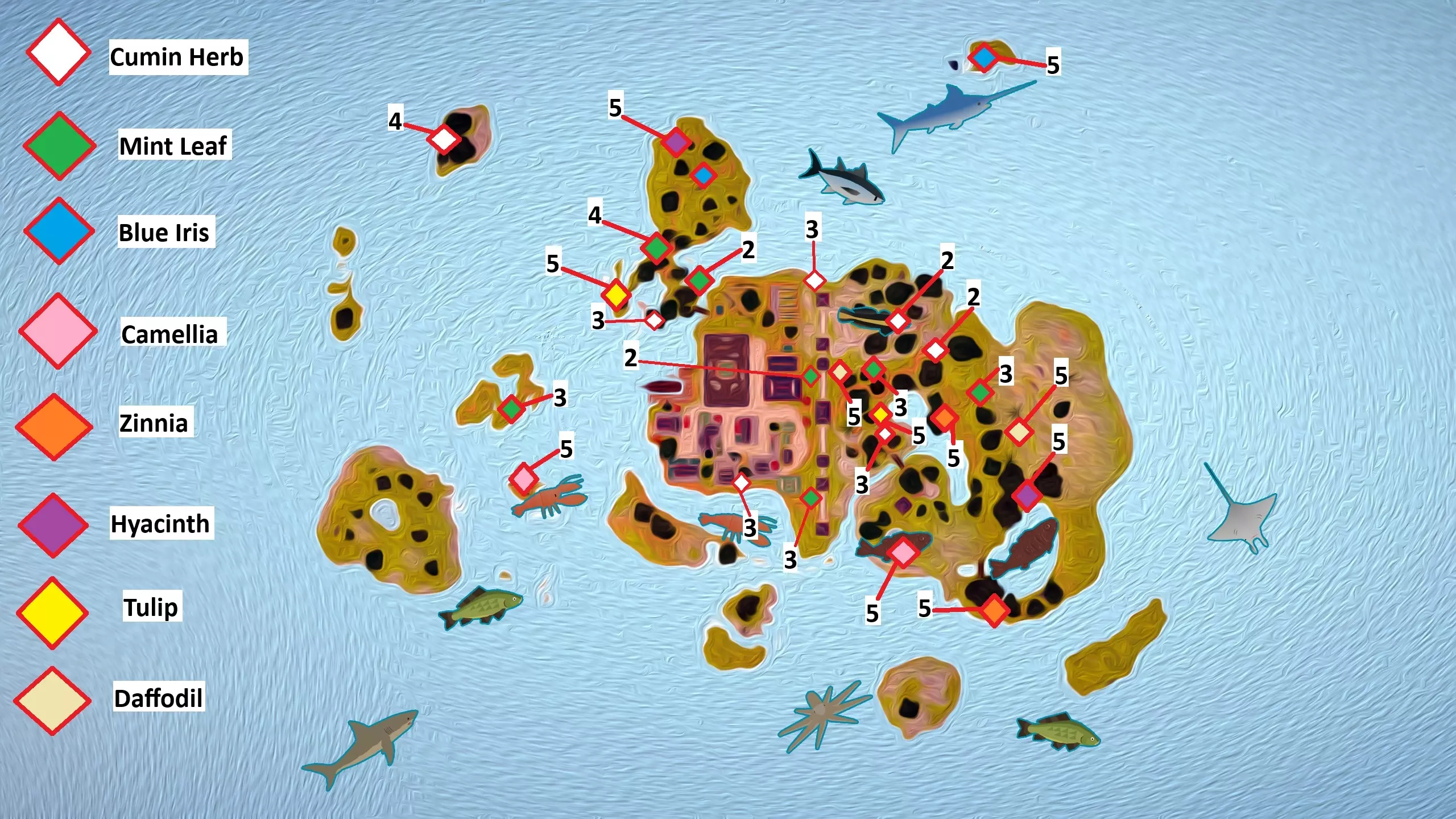 你可以从工程师处购买机器,这些机器可放置在你的工坊中,帮助你制作更多种类的商品进行销售。请注意,你需要先解锁【市场1级】升级,并且解锁工坊本身,之后才能放置这些机器。 东镇花卉和草药位置 点击图片可放大查看。 数字代表可采摘的数量。 花卉每天都会重新生长。 孜然草和薄荷叶每个区域每天只重生一株。这意味着如果你在一个地点采摘了3株,每天会重生1株,需要3天才能重新长回3株。 白色 = 孜然草 绿色 = 薄荷叶 蓝色 = 蓝色鸢尾花 粉色 = 山茶花 橙色 = 百日草 紫色 = 风信子 黄色 = 郁金香 浅黄色 = 水仙花
