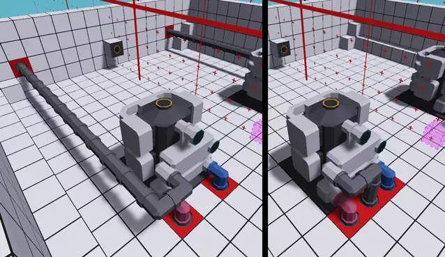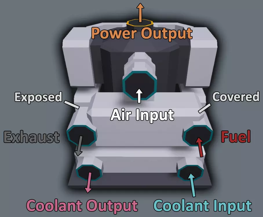 你会注意到,有一个类似油箱的部件连接着中间的两个孔,但它并没有完全覆盖其中一个孔。你需要调整它的朝向,使这个“油箱”覆盖靠近船中部的孔,而不是外侧的孔。放置好后,安装发动机,然后将光标悬停在各个孔上查看其功能(选择一个普通方块可以让查看更清晰)。正确放置后,标有“冷却液输入”和“燃油输入”的孔应朝向船中部,“冷却液输出”和“排气”孔应朝向侧壁,并且所有孔都应朝船头方向。记得开启对称模式(你应该还开着吧?)。另一侧将放置一个相同的发动机,其管道输入口朝向正确方向。 最大转速(转速限制器,红线转速) 继续操作前,请选择选择工具,并将两个发动机的“最大转速”更改为16。保持20也可以,但完全没有必要,因为我们永远不会让发动机以那么快的速度运行。对称模式不适用于选择工具,因此你需要分别对两个发动机进行设置。“最大转速”的作用类似于汽车的红线转速,通常可以防止发动机爆炸。一个常见的误解是,将限制器提高到100会增加发动机在低速时的功率输出,这完全是错误的。限制器的作用只是防止发动机转速超过特定速度。请记住,我们希望所有将要连接在一起的发动机都设置相同的RPS限制,否则一台或多台无RPS限制的发动机将试图让受RPS限制的发动机超过其转速限制,并给无限制发动机带来巨大压力,从而更有可能导致过热。 发动机流体 正如上一节所提到的,发动机需要3种流体输入,并会有2种流体输出。为实现这一点,我们需要使用物品栏中【方块】类别下的各种管道。如果物品栏未按类别排序,你可以点击左上角的第二个按钮。第一个按钮用于取消分类,第三个按钮则会按字母顺序排列物品栏。目前游戏中有7种管道方块,每种都有对应的防水/封闭式变体,总计14种。建议你通过点击并从物品栏拖动的方式,将直管、弯管和三通管添加到快捷栏中,不过这取决于你的个人喜好。除非另有说明,否则我们将使用普通管道,而非封闭式管道。需要注意的是,尽管普通管道的“开口”端看起来是开放的,但流体无法从这些开口进出。流体要进出管道,必须连接到发动机、液罐等部件,或者连接到流体端口、流体排气口、流体进气口等特殊“流体接口”。 颜色编码:为了让你杂乱的管道布局更容易理解,你可以将每条管道设置为不同的颜色。你选择什么颜色完全取决于你自己。我个人会用浅蓝/粉色分别表示冷/热冷却液,自定义红色表示燃料,深灰色表示废气,白色表示空气。这纯粹是为了美观和让内容更易读,所以选择适合自己的颜色就好(或者不选也没关系,燃料才不在乎它流经的管道是什么颜色,只要能到达目的地后爆炸就行)。 冷却液