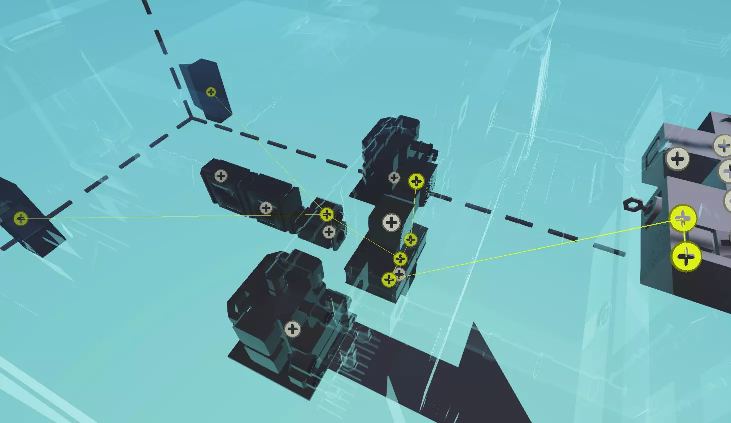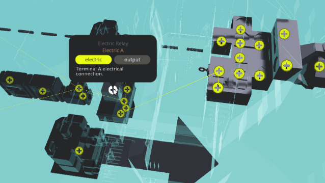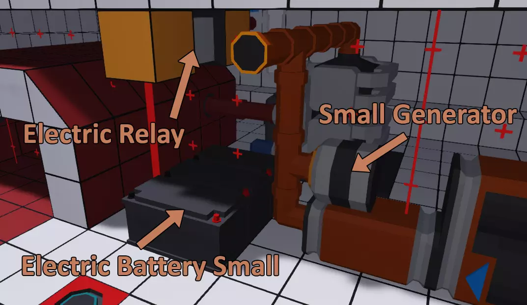 现在我们来为这台发电机添加一些电池以便充电。在物品栏中找到小型蓄电池,将其放置在管道和燃油箱之间的地面上。你可能希望放置3个,这样能在电量耗尽前提供更多电力,但单个电池应该也足够了。要记住,在资金有限的战役模式中,电池和发电机往往都相当昂贵。电池也比较重,所以在船上塞满电池是不明智的。 大多数船只都包含一个或多个电路断路器,但我们将设计这样的电气系统:当我们转动发动机钥匙时,系统就会启动,且只有很少的组件直接连接到电池。为实现这一点,我们将使用一个继电器。电动继电器的功能与电动断路器相同,不同之处在于断路器只能通过手动扳动开关来操作,而继电器可以远程激活。在我们的示例中,当我们转动发动机钥匙时,它就会开启。将电动继电器放置在电池附近的某个位置,我把我的继电器安装在了天花板上。 电气逻辑 连接电气元件比使用管道连接发动机部件要简单得多。我们无需铺设实体电缆或管道,而是使用逻辑工具将电气节点连接起来。在屏幕顶部选择【逻辑】,然后在左侧点击【电气】。此时应该会出现几个带加号的黄色圆圈,这些就是我们要连接的电气节点。与发动机离合器将传动轴分为两个独立系统的原理类似,我们的继电器会将两个电力系统分隔开,直到我们将其开启。如果你不小心将一个系统的节点连接到另一个系统的节点,电路就会闭合,所有设备将作为一个系统运行,因此要注意你所连接的对象。也不要将继电器的一侧连接到另一侧,因为这同样会使电路短路并产生相同的效果。 要进行实际连接,只需点击并拖动一个节点到另一个节点即可。尝试建立已存在的连接将会删除现有连接。按住CTRL键的同时点击,可以快速建立多个连接。建立连接最快的方法是选择一个电池,然后将其连接到电池系统中所有需要供电的设备以及继电器的一侧,接着按住Ctrl键点击,将其他所有设备连接到继电器的另一侧。这种方法会产生大量黄色连接线,虽然能正常工作,但如果进行大量连接,可能会导致视线受阻,难以看清其他内容。 另一种方法是采用链式连接。电流可以毫无问题地通过这些连接流动,路径甚至可以在任何地方进行分支、合并或分叉。关键在于确保每个组件都有一条连接路径,能够连接到电池、继电器或断路器。“蜘蛛网”和“链条”两种方法均有效,因此选择其中一种(或根据需要将它们结合)并开始连接。