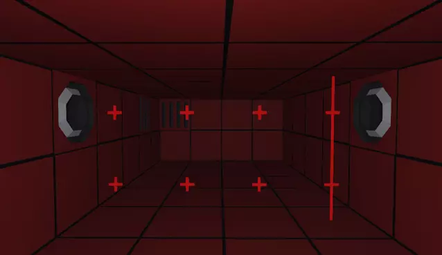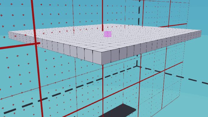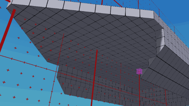 我们先从建造船体甲板开始。确保第一个快捷栏插槽中已选中方块,并从对称菜单中启用X平面对称(工作台区域应出现红色网格)。点击并拖动现有方块的侧面来开始建造方块平面,注意相同的方块会自动在红色对称网格的另一侧镜像生成。按住Shift键通常会改变方块的建造方向,但这在很大程度上也取决于当前的相机角度。启用测量功能也是个好主意,这样我们可以检查甲板的尺寸。我们需要一个宽19方块、长21方块的甲板。