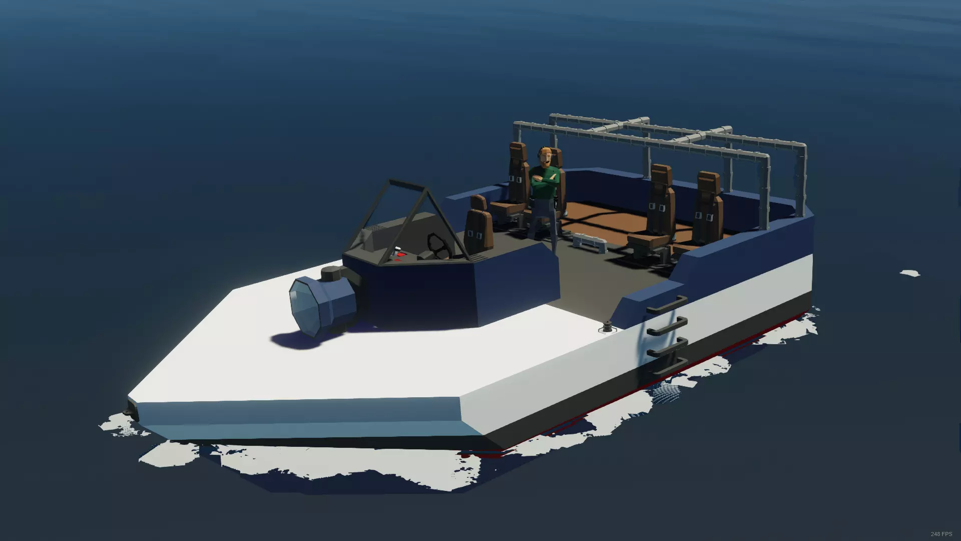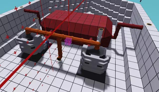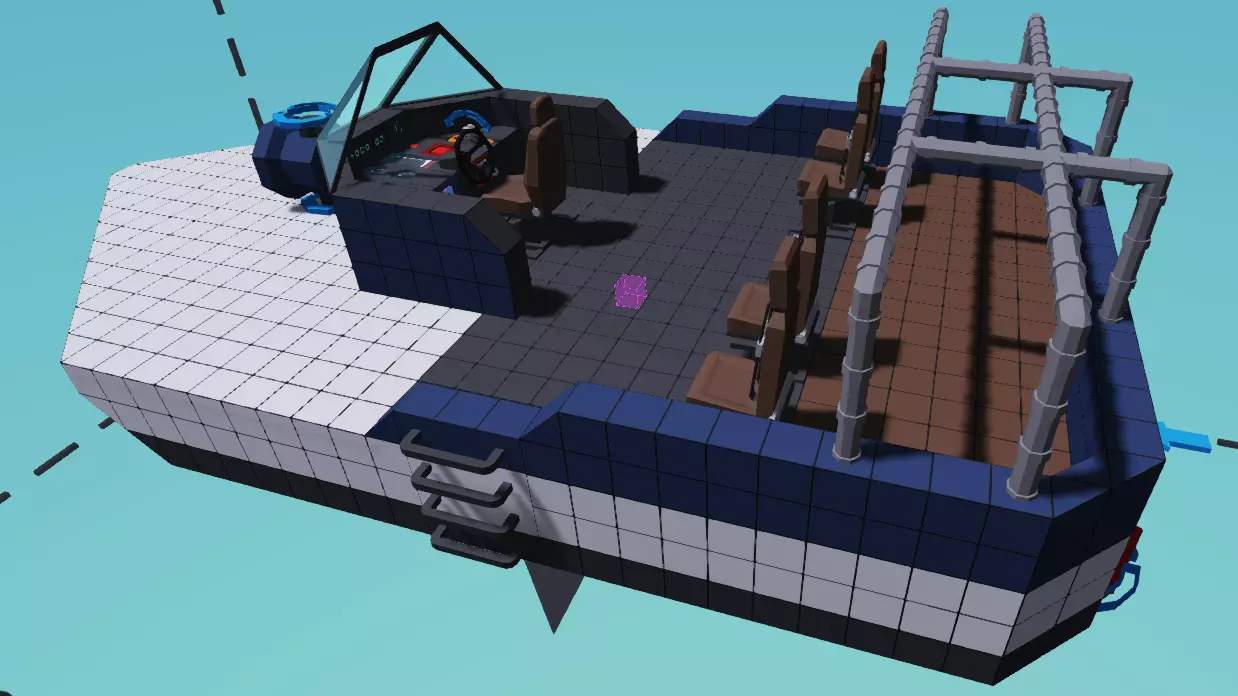 现在前往船尾。将向内倾斜前最底部中间的完整方块替换为小型螺旋桨。在仍启用对称模式的情况下,从螺旋桨向一侧数5个方块,垂直删除1个楔形块和2个完整方块。现在暂时禁用对称模式,因为我们要放置方向舵,如果在启用对称模式的情况下放置它们,那么每次尝试转向时它们都会相互抵消。拿起鳍状推进器,将它们放置在我们刚刚在两侧删除的垂直方块组中,确保实心箭头指向右侧。完成后确保重新打开对称模式。你可以删除方向舵下方的单个楔形块,用完整方块替换它们,然后添加另一个楔形块使其看起来更美观。最后的修饰 让我们在乘客座位后面添加一个类似笼子的结构,这样当我们遇到汹涌的海浪时,运输的货物就不会飞出去。你可以组合使用直管、弯管、三通管,甚至四通管。或者你可以复制下面截图中的样子。我还在两排椅子之间的过道上添加了一组管道,以防止板条箱从 cargo area(货物区)向前滑出。 在船的最前端,楔形物之间有一个完整的方块。我们可以用 Rope Anchor(绳索锚)替换这个方块,这样在需要救援船只时,我们就可以在船上系上拖绳。如果你不嫌麻烦,想尝试用这艘船拖曳其他车辆,也可以在船尾添加一个。涂装 到目前为止,我们一直在使用纯白色方块进行建造。启用屏幕顶部的涂装工具,在左侧选择一种颜色,然后点击方块即可更改所选面的颜色。你可以点击并拖动来加快涂装速度,也可以点击左侧颜色上方的按钮来更改涂装模式。平面填充模式可以一次性涂装整个区域,而替换颜色模式则可以将所有一种颜色更改为另一种颜色。使用平面填充模式时,它会保留颜色的变化,因此你可以先涂装一个空白矩形,然后进行填充。你还可以通过点击所有小彩色圆圈下方的大圆圈来获取和保存新的自定义颜色。你可以尽情地按照自己的喜好为船只涂装。 这是我涂装它的方法。