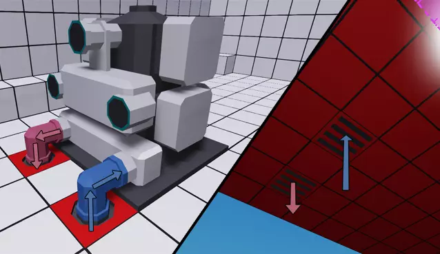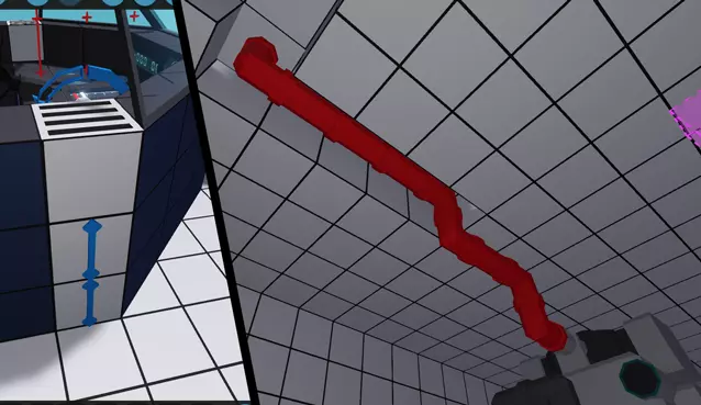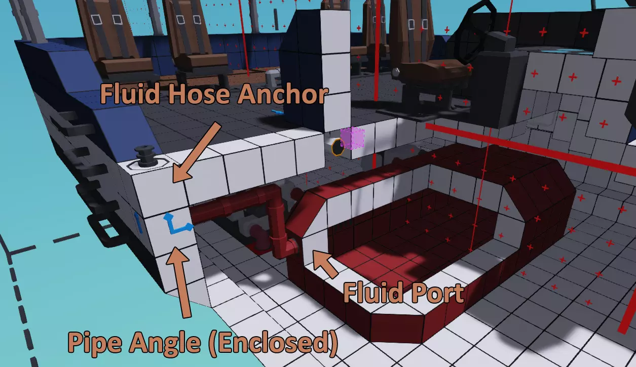 关于进气口,我们将采用逆向操作。回到之前创建的舵手区域,在仍启用对称模式的情况下,删除角落窗口部件后方的普通方块,并用一个通风口朝上的流体端口替换它。接下来,将其下方的方块替换为封闭式直管。启用屏幕右侧的方向箭头选项,以查看管道的连接位置。