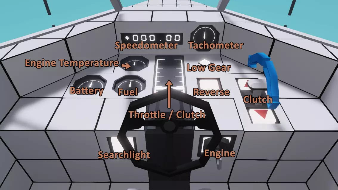 展示一种启动移动的方法。注意观察,换挡时转速表会下降,但船只不会减速。 要让船只移动,我们需要加大发动机油门并接合离合器。过早接合离合器会导致发动机熄火。最简单的操作方法是:按住前进键,直到油门显示上的白线完全到达顶部,然后增大离合器,直至红线也完全到达顶部。此时船只应该开始移动了!你会发现我们很快就达到了RPS限制,所以需要按下热键1来换挡。不用担心换挡前要分离离合器,它可以自动顺利换挡。 当你在航行时,可以尝试一些转向操作,感受一下船只的操控性能。你会注意到转速可能会开始下降,所以如果转速过低,就用热键1降挡。当你开始移动且离合器达到100%后,除非你想完全停车,或者即使在一档时发动机转速也非常低(通常是在极其缓慢移动时),否则你不需要触碰离合器杆。你也可以使用少量油门并小心操作离合器,让船只以低速“爬行”前进。 当你准备尝试倒车时,尽量将船完全停稳,并将离合器设置为0。按下仪表盘上的【倒车】按钮,然后给发动机施加少量油门。逐渐增加离合器压力,如果转速开始下降,同时加大油门,最终你应该能在离合器100%的情况下,即使只使用很少的油门也能倒车。你甚至可以启用高速挡来降低敏感度。这艘船的设计并不适合快速倒车。螺旋桨经常会露出水面,而且操控通常非常不稳定,所以只在需要时使用倒车,实际行驶时尽量使用前进挡。 如果你启用了创意模式,可以打开创意菜单调整时间来测试灯光,或者调整天气设置,看看船只在波涛汹涌的海面上如何操控。完成后,你可以将船只带回工作台,方法是看向船只并按R键,或者按M键打开地图,点击船只将其带回。
