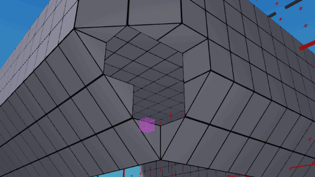 制作拐角时,我们将使用位于快捷栏第三格的金字塔方块。你会发现,当正确旋转后,它能与我们之前在侧面制作的3格高斜坡完美对齐。只需点击并拖动拐角区域,它就会自动填充所有部分。这可能会生成一些多余的方块,需要按需移除。如果遗漏了某个方块,可以尝试使用倒金字塔方块来填补,或者删除其中一个金字塔方块后重新尝试。记得尝试按住Shift键来改变线条方向。最后,使用普通方块填充船的底部(我忘记做这一步了,所以下图中的底部仍是空的)。 船头:如果你还没有在前端建造3×3的垂直方块,现在应该这样做。将甲板向前延伸2个方块,然后使用楔形方块向前斜向建造,直到船头甲板达到所需位置。删除多余的方块,然后在前端用标准方块填补最后一块。移除刚才建造的线条内侧的楔形方块,接着点击并拖动一片方块来填满整个区域。如果操作正确,系统会自动只填充甲板区域,不会在外侧建造多余的方块。