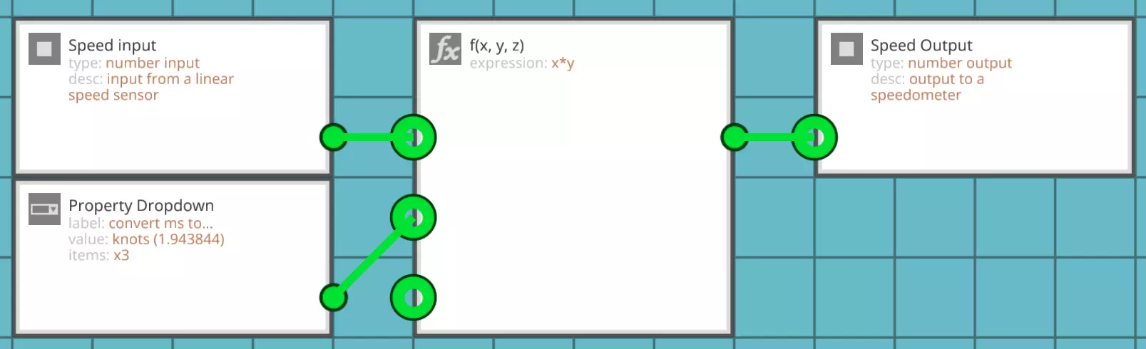 以下是我们将要创建的微控制器(MC)。具体创建方法将在下方详细说明,先展示出来是为了让你了解我们要做什么。 准备就绪后,点击屏幕顶部的【逻辑】按钮,切换到微控制器的“内部视图”,这里就是实现功能的关键区域。在设计模式中创建的两个节点目前叠在一起,点击并将它们拖到两侧。如果需要移动视角,可以按住鼠标中键平移视图。我们还需要添加两个节点,所以像在载具编辑器中一样打开【物品栏】。找到【f(x, y, z)】(在【算术】分类中查找比搜索更容易找到)和【属性下拉菜单】,并将它们都放置好。现在请进行如下布置:将设计视图中创建的输入项和属性下拉菜单放置在左侧,f(x, y, z)函数模块置于中间,输出项放在右侧。 接下来,将速度传感器输入连接到函数的X输入,将属性下拉菜单连接到函数的Y输入,并将函数的输出连接到速度表输出。现在点击该函数以打开其属性面板。与我们创建的另一个函数类似,我们将把速度传感器的输出乘以一个常数。不同之处在于,这个常数将来自我们的【属性下拉菜单】,这是一个特殊的逻辑门,允许我们点击微控制器并更改其属性,就像我们可以更改油门杆或驾驶座的属性一样。因此,我们这次的函数很简单,就是“x*y”,即“线性速度传感器乘以属性下拉菜单”。函数的“Z”输入对我们没有任何作用,因为我们只需要X和Y输入。如果我们现在尝试在函数中使用Z,Z将始终为0,因为它没有输入。如果逻辑门的某个输入功能不需要,或者默认状态可以使用,那么无需连接该输入。