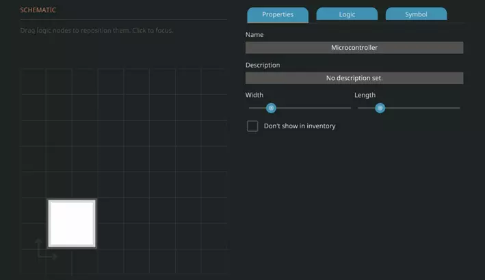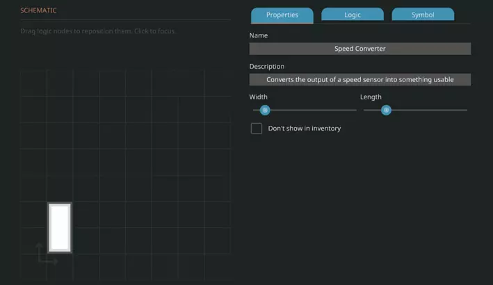 你会看到一个与载具编辑器有些相似的界面,只是顶部的部分选项有所变化,主视图也看起来大不相同。左侧应该是【示意图】,它是我们微控制器(MC)的俯视图,右侧则有三个标签,分别是【属性】、【逻辑】和【符号】。现在先选择【属性】标签,为微控制器输入一个名称(我觉得“速度转换器”比较合适,但你可以自己决定)。这个名称就是我们保存后微控制器在物品栏中的名称。【描述】是在物品栏中选中该组件缩略图时显示在下方的简短说明,这是可选的。宽度方面,我们需要将其缩小到1,长度可以缩小到2,这样我们就能得到一个1x2的微控制器来进行操作。
