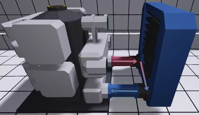 冷却发动机最常见的方式是使用水。小型发动机自带约196升水作为冷却液,因此在许多情况下,最简单的冷却方法是将其直接连接到散热器。如果你放置一个流体散热散热器,会发现它的输入/输出接口与发动机冷却液管道的输入/输出接口完美对齐。需要注意的是,散热器无需暴露在空气中即可工作,且冷却液的进出方向并不重要,因为它就像一个没有特定输入/输出的大型管道部件。我将以这种方式连接其中一个发动机来展示其外观,但由于我们车辆的设计,有一种更好更简单的发动机冷却方法。