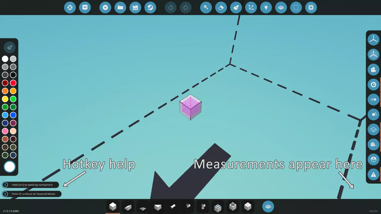 顶部面板 用户界面的顶部面板左侧用于保存/加载载具,右侧则包含多种专用工具。 第一个按钮用于退出工作台,在战役模式中会退还载具组件的费用以便后续使用。之后再次进入工作台时,除非创建或加载了新载具,否则会加载该载具供再次编辑。生成按钮会生成当前载具,将鼠标悬停在该按钮上会显示载具的重量/质量以及总成本。 新建载具按钮会清除所有内容,并生成一个带有单个方块的新载具供开始建造。加载按钮用于访问您已保存的载具以及任何已下载的创意工坊作品。保存按钮用于在建造载具时避免进度丢失。经常保存!创意工坊允许你将载具上传至Steam创意工坊,供其他玩家下载和使用。 两个圆形箭头按钮用于撤销/重做操作。这些按钮也有快捷键,正如你所期望的,CTRL+Z用于撤销,CTRL+Y用于重做。 接下来的8个按钮中,大部分将在后面详细介绍,但在这里你可以找到删除和涂装工具。至于选择、移动、逻辑、合并、选择网格和微控制器编辑器,目前可以先不用管它们。值得注意的是,删除工具设有快捷键,按X键即可切换。 右侧面板主要是用于视觉辅助以及相机/对称控制的工具。第一个按钮用于切换所有三个轴的对称工具,此外还有一个【禁用】按钮和一个【显示/隐藏移动控件】按钮,分别用于禁用对称平面和移动对称平面。设置好对称方式后,你可以点击该按钮隐藏面板,直到需要时再重新调出。 剖面平面工具与对称工具类似,不过它用于查看载具的剖面/横截面视图。 相机部分有一个【重置相机】按钮,可将相机恢复到默认视图,还有用于在【轨道模式】和【自由模式】之间切换的选项。大多数人建议将其切换为自由模式,这样你就可以使用常规移动键来移动相机。 质心会在载具上显示一个紫色方框,表示载具总重量/质量的集中点。这对于平衡载具很有用,可防止其在水中向一侧倾斜或原地打转而无法直线行驶。 方向箭头会为各种特殊方块显示蓝色箭头,指示它们的朝向,同时也会显示涂装方块的蓝色边框。因此,如果你使用涂装方块进行涂装,可以关闭此功能以便更清晰地查看涂装效果。通常建议启用此功能。 旋转标签是放置方块前用于指示旋转方向的视觉标记。最终你可能会记住哪个按键对应哪种旋转方向,届时就可以关闭此功能。可通过P热键切换这些标签的显示。 网格线会在方块周围显示轮廓,有助于方块的放置。我并不喜欢它们,但为了本教程的目的,我还是启用了这些功能。 测量功能会在你以直线或平面放置方块时显示所覆盖区域的尺寸。每个方块为0.25米。第一个数字是方块数量,第二个数字是实际测量值。放置方块时,你点击的点会显示彩色线条,以表明哪个测量值对应哪个轴。 世界视图会显示工作台区域在实际游戏世界中的样子。载具会完全按照这里显示的样子生成。 编辑器警告是一项调试功能,当某些组件缺少连接或电力等时,它会发出警告。因此,如果你的载具中某个部分无法正常工作,开启此功能来检查是否有缺失的内容可能是个好主意。请注意,这也可能会显示误报,因此不要将其建议视为绝对正确。 底部面板 此部分大部分是方块和组件的快捷栏,可通过按数字键或直接点击来访问。快捷栏右侧是物品栏界面,也可通过按Tab键打开。在生涯模式中,公司当前资金也会显示在右侧。 空白区域 底部面板与左右两侧面板之间有一些空白区域。如果启用了测量功能,右侧会显示测量数据。左侧是上下文提示,这些提示通常容易被忽略,我强烈建议在使用新工具或按住修饰键时查看此处。左侧面板 这是一个上下文敏感的工具栏,但最常见的是显示一组默认颜色样本,用于为你的载具上色。底部的大圆圈是你访问自定义颜色和RGB滑块的地方(不过没有十六进制或HSV输入!开发者请添加)。当选择不同工具时,此面板会替换为其他选项,特别是逻辑工具会显示各种不同的逻辑类型,选择网格会显示剪切/粘贴、调整大小选项、插入子载具等。选择涂装工具还会解锁顶部的涂装模式按钮。 边界框和灰色大箭头 视图中间有一系列虚线,显示你可以制作的载具的最大尺寸。每个工作台都有其自己的最大尺寸。如果你使用的是初始基地,那么这是最小的工作台区域之一。底部始终会有一个灰色大箭头,指示载具前端应朝向的方向。 建造(防水)船体 现在是时候开始实际建造了。首次打开工作台时,屏幕中央应该有一个白色立方体,如果启用了质心功能,立方体内会有一个紫色方框。如果显示的不是单个白色立方体,请点击左上角的【新建载具】按钮。