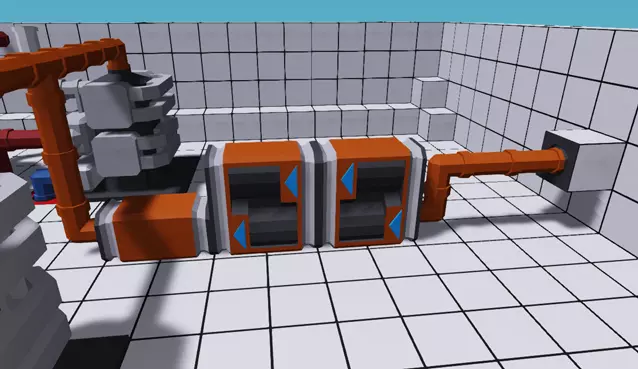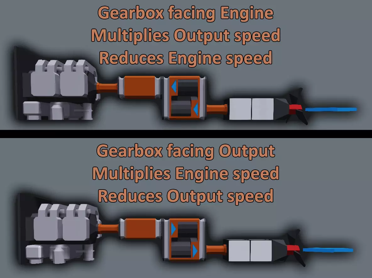 让我们先在曲轴上添加一根传动轴。幸运的是,我们不需要什么特殊工具来完成这个操作,只需找到发动机顶部的动力输出端,然后连接普通管道即可,就是我们之前用来传输流体的那种管道。和流体管道一样,我会给动力管道进行颜色编码,我个人喜欢用橙色。由于我们使用的是两台发动机,所以要将这些管道引向船的中央,并用一个向下倾斜的管道三通接头将它们连接起来。不用太纠结我们是如何随意地让传动轴以这种方式扭曲和弯曲的,“它就是能正常工作”。将输出端连接好后,把管道向下延伸到地板,然后朝船尾方向弯折,但先不要往那个方向继续拖动管道。离合器 不知为何,这个部件对很多人来说理解起来相当困难。如果我们将管道直接连接到螺旋桨,那么只要发动机在运转,螺旋桨也会跟着转动,因为它们是直接相连的。理论上,如果我们能用外力让螺旋桨转动,也会带动发动机转动。离合器将驱动轴分成两部分,这里指的是发动机部分和螺旋桨部分。 当离合器分离时,发动机运转但不会对螺旋桨施加力,船只将保持静止。随着你增加离合器压力,两部分系统会逐渐相互传递动力,使发动机能平稳地带动螺旋桨。对于较重的载具、较大的螺旋桨、较弱的引擎或轮式驱动载具而言,这一点至关重要,因为如果不以此方式平稳接合离合器,很可能会直接导致引擎熄火。完全不使用离合器意味着你将依靠内置的电动启动马达来尝试让引擎和螺旋桨都达到运转速度,这会迅速耗尽电池电量,若在引擎启动前电池就耗尽,你的载具就会陷入困境。 尽管离合器是可选部件,但我们仍将在这辆载具上使用它。学习如何使用离合器仍然非常有益。重要提示:离合器有A侧和B侧,但安装方向无关紧要,所以无需担心装“反”了。继续在我们目前制作的管道末端添加一个离合器。 变速箱简单讲解 警告:自2021年2月18日更新后,变速箱发生了巨大变化,本节内容现已过时。我最近没有玩《风暴工程:建造与救援》,需要对引擎改动进行试验,以便了解如何重写本节内容。 让我们来谈谈新玩家甚至一些有经验的玩家都难以理解的内容之一:变速箱。关于变速箱的教程有很多,但我会让你彻底搞懂它。 就我们目前所讨论的而言:【变速箱是转速倍增器】(它们也是反向的扭矩倍增器,但我们尽量保持简单)。《风暴工程:建造与救援》中,旋转速度以每秒转数(RPS)为单位,玩家通常也以此来衡量。RPS即每秒转数,1 RPS等于60转每分钟。游戏中的柴油发动机运行速度远低于普通汽车的汽油发动机。 显然,这其中还有更多门道,但对于新手而言,了解这些基本内容就足以开始使用发动机了。不过,我们还是来详细解释一下什么是“转速倍增器”。假设你有一台发动机以10 RPS的速度运转,将其连接到螺旋桨后,发动机和螺旋桨都会以10 RPS的速度旋转。这没什么问题……但我们可以做得更好。在我们的情况中,引擎的功率足以驱动螺旋桨以更高强度运转,但我们并不想过度提高引擎的转速(RPS),因为较高的引擎转速不仅会增加燃油消耗,还会使引擎温度升高,更容易发生爆炸故障。下面介绍变速箱/转速(RPS)倍增器。在引擎和螺旋桨之间放置一个变速箱,将其倍增器设置为2,此时引擎会像往常一样以10 RPS的转速运转,而螺旋桨的转速则会翻倍至20 RPS,这意味着船只在燃油消耗与之前大致相同的情况下速度会快很多(在此设置中:引擎转速(RPS)×变速箱=螺旋桨转速(RPS))。 方向 变速箱是转速(RPS)倍增器,但如果你现在尝试放置一个变速箱,会注意到上面有类似箭头的►标记。这是因为乘法运算的结果取决于箭头所指的方向。如果我们将上述示例反过来,发动机转速将达到10转/秒,但螺旋桨转速只会是5转/秒,因为此时是用螺旋桨转速乘以变速箱的传动比。 (在此设置中:螺旋桨转速×变速箱传动比=发动机转速) 那么我们应该如何放置变速箱呢? 由于我们希望提高螺旋桨的转速,因此需要将变速箱按特定方向放置,使较小的传动比朝向发动机,而较大的传动比朝向螺旋桨。记住这一点的最简单方法是:箭头►的小端对应较小的传动比,大端对应较大的传动比。因此,我们希望添加一个连接到离合器的变速箱,使箭头►的小端指向离合器,而大端指向螺旋桨。这通常被称为“将箭头朝向发动机放置”。