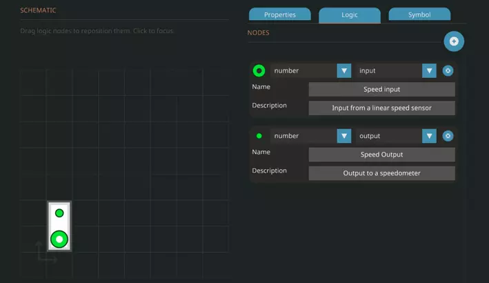 现在在逻辑选项卡下,点击添加节点按钮两次。你会注意到左侧的示意图上出现了一些东西。你需要点击并拖动我们刚刚创建的其中一个节点到空白区域,因为节点不能重叠(重叠时会显示黄色脉冲警告标志)。现在,在两个节点上点击显示为“开/关”的下拉菜单,将其更改为“数字”,因为我们的输入和输出都将是数字。现在将其中一个节点命名为“线性速度传感器输入”或其他你觉得有意义的名称,然后将另一个节点的类型更改为“输出”,并命名为“速度表输出”或类似名称。描述通常会被忽略,但它们是在逻辑模式下将鼠标悬停在节点上时显示的工具提示内容。现在你应该有两个数字节点,一个是输入节点,另一个是输出节点。 符号标签是为1位像素画作者准备的。你在这里绘制的内容将用作物品栏界面中的缩略图。 与载具一样,你需要经常点击屏幕顶部的保存按钮。保存时使用的名称不必与之前在属性标签中设置的名称一致。 逻辑