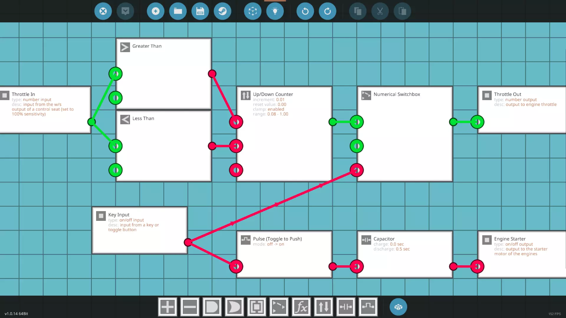 前面的微控制器已经完成,在整个章节中可以参考它。 这是比较简单的部分。现在让我们着手处理船只将要使用的最复杂系统。在之前逻辑的上方某处放置以下逻辑模块:大于、小于、增减计数器和数字开关盒。要记住数字开关盒在物品栏中的位置,甚至可以将其添加到底部的快捷栏中,因为我保证你会一直用到它。现在排列这些逻辑模块,将“大于”模块放在“小于”模块上方,且两者都位于“油门输入”的右侧。然后将“增减计数器”放在其右侧,“数字开关盒”放在计数器右侧,最后连接“油门输出”。有些人可能会建议使用阈值门代替大于门和小于门,但就我们设置驾驶座的方式而言,最终结果是相同的。 按以下方式连接逻辑:将油门输入连接到大于门和小于门的A(最上方)输入。大于门连接到增减计数器的向上输入,小于门连接到其向下输入。增减计数器连接到数字开关盒的第一个值(开启),然后数字开关盒连接到油门输出。最后,将按键输出连接到数字开关盒的开关信号节点。 在解释这些组件的作用之前,请打开增减计数器的属性并设置以下属性: 增量:0.008 重置值:0 启用钳制 最小值:0如果它们朝着错误的方向移动,说明它们被反向放置了。如果它们朝着彼此相反的方向移动,那么是在启用对称模式时建造的,其中一个需要翻转到正确的方向。 • 尝试前后推动油门杆。如果油门杆不移动,那么它的电力需要像钥匙按钮一样连接到继电器的【电池侧】。如果它移动了,你还应该看到仪表显示器上的红色条也随之移动。如果没有,则需要将杠杆的输出连接到仪表的【次要】输入。 • 按下热键2和热键3(默认情况下是键盘上的2和3。你也可以按H键切换控制提示)。当按下其中一个按键时,油门杆应随之移动,松开按键时则停止移动。如果释放热键后油门杆仍继续移动,你需要在驾驶座的属性中将热键模式从“切换”更改为“按压”。完成后确保将油门杆复位到0位置。 启动引擎:现在启动引擎,并按住交互键与钥匙按钮来启用电力继电器。如果使用按钮时没有反应,你需要检查其电气连接是否位于电力继电器的“电池”侧。如果转动钥匙的时间过长,你需要降低其“按住持续时间”属性。当钥匙开启后,多项操作应同时进行。• 你应该能听到发动机的启动马达运转0.5秒。如果运转时间超过这个时长,请确保你将启动器连接到我们之前制作的微控制器,而非直接连接到钥匙。如果已连接到微控制器,则说明微控制器本身存在问题。如果启动马达完全不运转,意味着你需要检查发动机的电气连接,或者检查微控制器的设置是否正确。 • 仪表盘上所有仪表的背光灯应点亮,船底的灯光也应亮起。虽然这些并非至关重要,但在夜间非常有用。如果某个设备无法启动,请确保它与按键有数据连接,并且与继电器有电力连接。 • 假设你未按下热键1,指示灯应处于亮起状态。如果即使按下热键1后指示灯仍不亮,请检查其数据是否已连接至非门,以及其电力连接是否正确。此外,如果热键1尚未连接至非门,请进行连接。继续操作前,请确保指示灯已亮起。 • 转速表表盘读数应约为3-4转/秒。如果读数降至2.5转/秒以下,发动机将会熄火,你需要重新启动它们。如果起动机运转时读数仍停留在0,请确保转速表已与发动机的其中一个转速输出端建立数据连接。• 仪表显示器上的白色条现在应可见,数值显示为0.08。若未显示,请确保微控制器的油门输出已连接至仪表的主数值接口。 • 按左右按钮(默认设置)可控制探照灯左右转动。此时应能听到旋转电机运行的声音,并看到探照灯在驾驶舱旁转动。若探照灯不移动,请检查其与驾驶座的数据连接和电力连接。接着按下仪表板上的【探照灯】按钮。若按钮未亮起,检查其电力连接;若按钮亮起但探照灯仍不工作,而你能用方向键转动它,则需将按钮的数据连接至探照灯。如果松开方向键后探照灯仍继续移动,说明驾驶座的3号轴灵敏度过高,7或8是合适的数值。如果松开按键后探照灯一直回到中立位置,则需要将3号轴的“重置”值改为“粘性”。如果需要,现在可以关闭探照灯。 船只完成!驾驶它去兜兜风吧 假设清单上的所有内容都正确,那么你的船应该已经完成了!现在只需学习如何驾驶它。如果船卡在码头边缘,你可以离开座位,看向船只,然后按R键将其带回工作台。在这里你可以再次生成它,使其回到默认位置。当引擎启动,你舒适地坐在驾驶座上时,就可以准备出发了。08 最大值:1 逻辑门的【增量】显示不正确,因为它会对显示的数字进行四舍五入,尽管其内部使用的是正确数字。 要理解这些逻辑,让我们从驾驶座开始。如前所述,驾驶座会输出一个介于-1到1之间的值。通常,它会沿其轴平滑移动,但提高灵敏度会改变其移动速度。由于我们的灵敏度设为100%,所以每当我们按下前进按钮时,它会立即跳至1;按下后退键时,则立即跳至-1。此外,我们将其设置为【重置】而非【保持】,因此一旦停止按键,它就会朝相反方向移动至0。这意味着我们的驾驶座只会输出三个值之一:-1、0或1,不会有中间值。考虑到这一点,座椅会连接到我们的【节流输入】,然后再连接到【大于门】和【小于门】。【大于门】会比较其A输入和B输入,如果A值大于B值,就会输出一个开启信号。由于B输入没有接收到任何信号,它会默认设为0,这意味着它在检测座椅