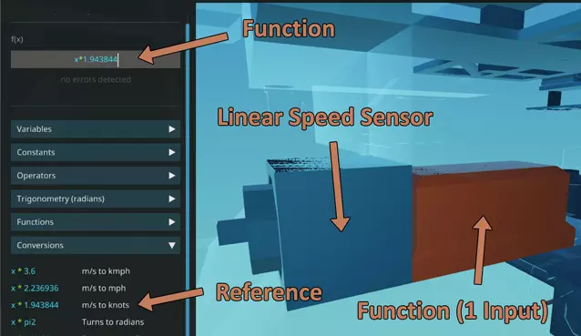 左侧:物品栏中已选中的非门,以及所有可放置的逻辑门。由于微控制器的存在,你不会经常使用这些逻辑门。右侧:放置一个非门,然后将其逻辑从座椅连接到指示器。 如果对称功能仍处于启用状态,可以将其关闭,因为我们只需要放置一个非门。然后在船体内部找一个看不见的空位将其放下。我的非门放在仪表盘下方,正好在它将要连接的指示灯正下方。现在将驾驶员座椅的热键1连接到非门的A输入端,再将非门的非A输出端连接到指示灯。操作就是这么简单,这是一个极其基础的逻辑门。其他逻辑门可能有多个输入,或者只有当输入值为特定数字输入时才会激活信号,这里种类太多无法一一涵盖,所以我只介绍与这艘船相关的逻辑门。 速度表:某些游戏模式可能默认未解锁线性速度传感器,必须通过传感器研究来解锁。速度表是接下来最容易设置的部分,现在我们就来操作。在你的船内某处放置一个线性速度传感器,其感应部分朝向车辆前方(或者不朝向,在这种情况下无关紧要)。使用选择工具将传感器模式更改为水平,使其感应任何水平方向的移动,而不是任意方向的移动。你也可以选择【定向模式】,如果你希望检测传感器探头(我认为它应该是一个特殊的皮托管)所朝向方向的速度,并且会将反向移动检测为负数。 线性速度传感器设置完成后,我们可以直接将其连接到速度表,但这里有个小问题。该传感器的输出速度单位是米每秒,这不是大多数人常用的速度计量单位,通常人们会用千米每小时或英里每小时来衡量常规速度。由于我们正在制作船只,所以我们要将传感器输出的米每秒转换为节。 在物品栏中找到【单输入函数模块】,并将其放置在船内的某个位置。函数逻辑门及其各种迭代版本是非常独特且强大的逻辑门,它将库存中至少12种逻辑门的功能整合到了一个组件中。通常情况下,我们需要同时使用乘法器和常数值才能实现的功能,现在只需输入正确的函数,它就能同时完成这两个逻辑门的工作。 使用选择工具点击【单输入函数】,左侧会出现一个文本框以及可供参考的下拉菜单。点击“单位转换”下拉菜单,你会找到一些最常用的速度单位转换参考。根据你想要显示的单位,找到“米每秒转节”“千米每小时”或“英里每小时”的转换公式,然后将其输入到左上角的f(x)框中。由于我要将米每秒转换为节,所以函数应为x*1.943844(不包含引号)。这意味着x是输入变量(即速度传感器的输出值),星号(*)是乘法运算符,1.943844是用于乘以输入值x的常数。组合起来就是我们的【函数】。