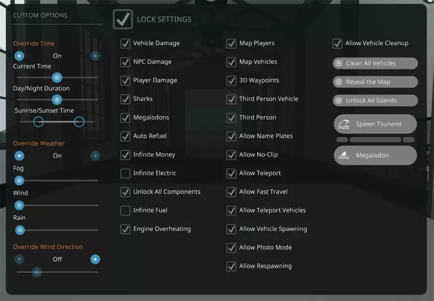 一旦到了室外,你可能会注意到天气可能不太好,而且时间在稳定流逝。如果你创建了自定义游戏,你可以暂时消除这些问题,否则请跳至下一部分。打开暂停菜单(按Escape键),然后点击【自定义菜单】(图标为上半部分白色、下半部分深色的圆形,上半部分有太阳图案,下半部分有月亮图案)。或者,你也可以在【设置】►【控制】►【杂项】►【自定义菜单】中重新绑定一个按键,以便快速访问该菜单。 当创意菜单打开后,会有很多可调整的选项,但我们只关注最左侧的部分。将【时间覆盖】设为【开启】,然后拖动【当前时间】的滑块,将时间调整到大约中午12点左右(我通常设为11:30左右)。这将阻止时间流逝,从而使白天永驻。接下来,将【覆盖天气】设为开启,然后把【雾】、【风】和【雨】的滑块全部拉到最左侧或0%。现在就是无限美好的白天,你可以开始打造你的第一辆载具了!之后我们可以尝试把风力调到最大,看看载具在恶劣天气下的表现,或者切换到夜晚来测试灯光。