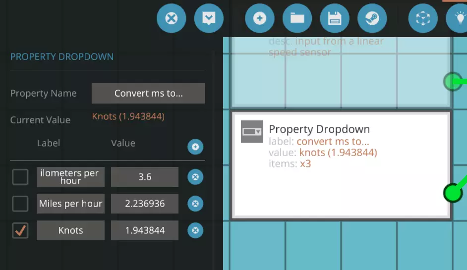让我们为属性下拉菜单添加一些可选选项,使其变得有用。点击该下拉菜单,然后在左侧输入“将毫秒转换为...”作为其属性名称。接着点击“添加”按钮3次,以创建3个选项。然后输入以下值: 标签 值 千米每小时 3.6 英里每小时 2.236936 节 1.943844 勾选标记表示默认选项,因此如果你更常使用千米每小时,可以将勾选标记更改为该选项。 现在,每当我们选择这些选项中的一个时,它将更改此输出的常数。由于当前选中的是“节”,因此它会将1.943844输出到我们创建的函数的“y”变量中。在点击左上角的【返回】按钮回到载具编辑器前,请记得保存微控制器。回到载具编辑器后,你可以用我们刚刚制作的微控制器替换【功能(1输入)】。它应该会以你之前命名的名称出现在【微控制器】分类的物品栏中。像之前一样连接速度传感器和数字显示器之间的逻辑,然后启用【选择工具】并点击微控制器,就能看到我们制作的下拉菜单运行了。如果你出错了或想编辑微控制器,点击带有三个点的小按钮可以当场重新打开微控制器进行编辑。你甚至可以在不保存微控制器的情况下将其更新到载具上,这样就无需将特定于某些载具的微控制器保存在微控制器编辑器中。 发动机管理微控制器 此时,船只已接近完成。现在我们只需要一些逻辑来控制发动机油门和启动马达等。通常人们会在载具上添加一个专门用于启动马达的按钮,但我们已经有一个钥匙按钮可以完成这项工作。问题在于,我们只需要启动马达运行到发动机启动为止,但现在将钥匙直接连接到启动马达会导致启动马达一直运行直到电池耗尽。 除此之外,我们还需要一种控制发动机油门的方法,而我们正通过驾驶座来控制油门。发动机的油门输入值范围为0到1,但驾驶座的控制轴输出值范围为-1到1,这意味着有一半的输出范围是无效的死区。更理想的情况是,只要钥匙处于开启状态,发动机就能平稳怠速;而当关闭钥匙时,发动机就会熄火。我们可以通过一个带有简单逻辑的微控制器来实现上述所有功能。设计