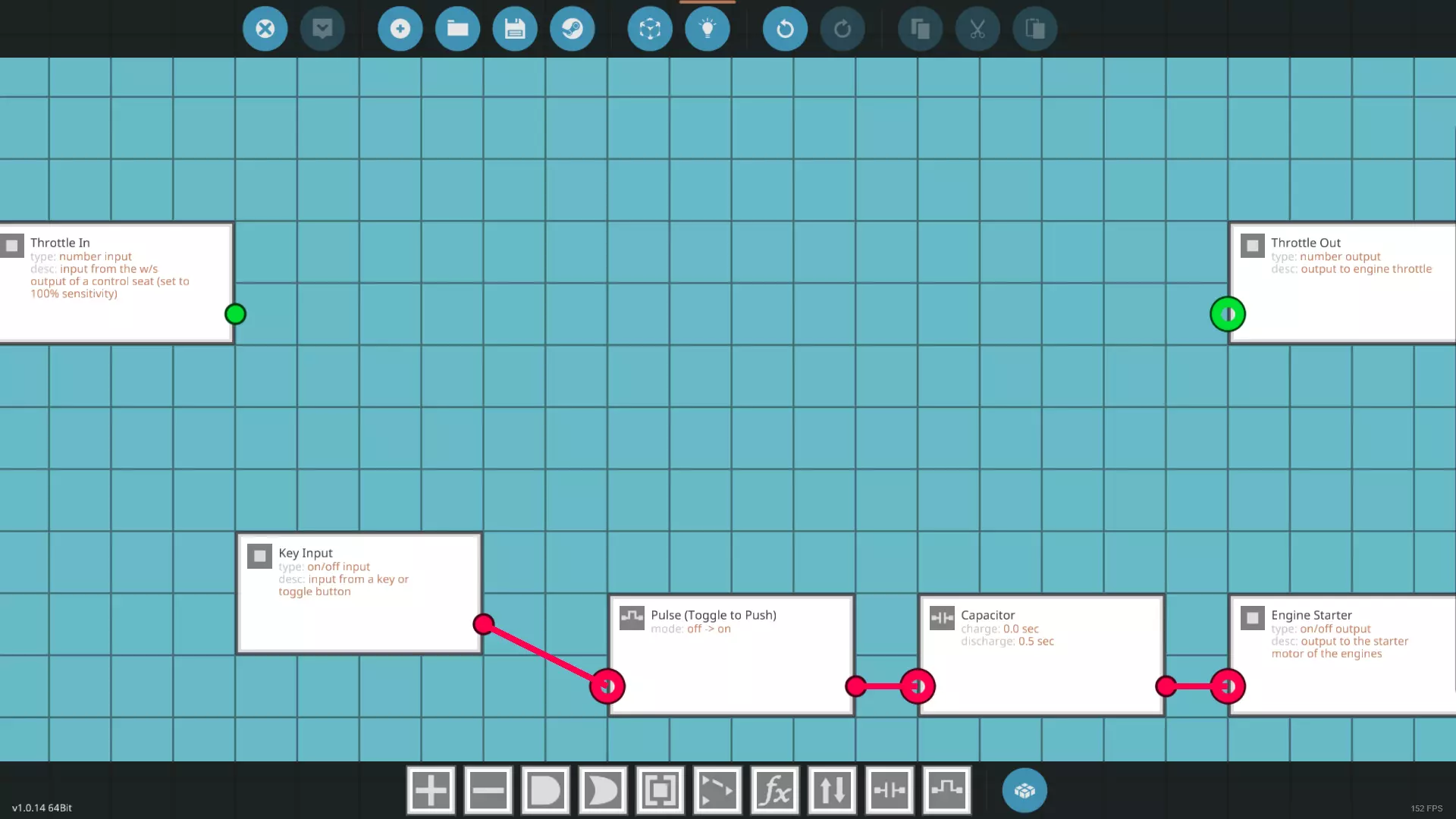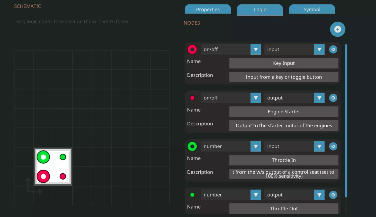 打开微控制器编辑器并点击新建微控制器以清除当前设计。默认的微控制器尺寸为2x2,这正是我们所需要的,因此无需更改尺寸。输入一个名称,我使用的是【引擎启动/停止按键】,你也可以使用【简易引擎微控制器】或类似名称,描述为可选内容。在属性选项卡下点击添加节点四次。我们需要2个开关节点和2个数字节点,且每种类型各需要一个输入和一个输出。至于名称,你可以将开关输入命名为【按键输入】,输出命名为【引擎启动】,然后将数字输入命名为【油门输入】,输出命名为【油门输出】。最后,在符号选项卡中,你可以根据需要绘制图案。 启动逻辑