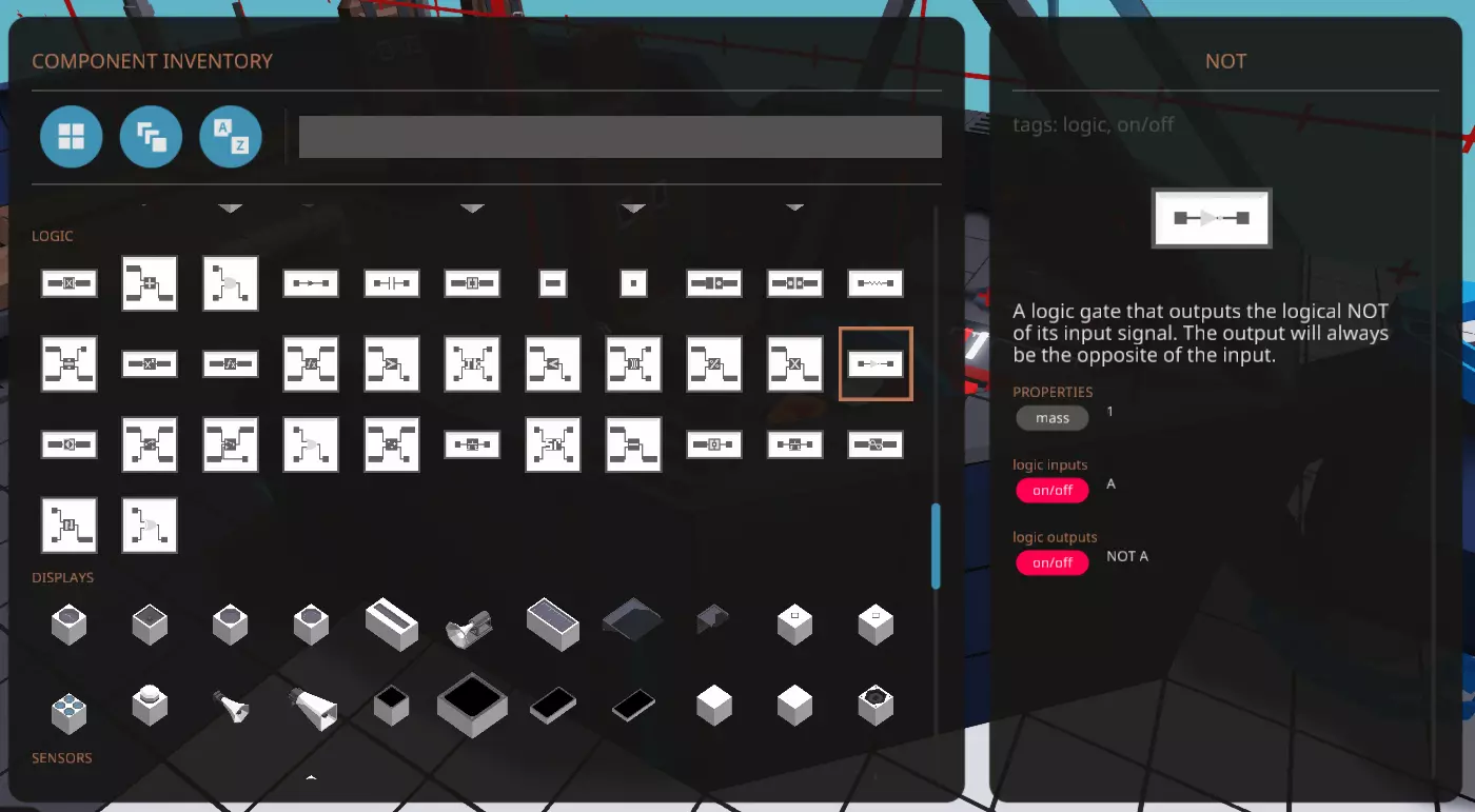 就像电力逻辑一样,你只需点击并拖动一个节点到另一个节点,就能建立逻辑连接。如有必要,你可以从输入端点击并拖动到输出端,但如果需要建立多个连接,从输出端开始使用Ctrl+点击的技巧效果最佳。不过,我们目前还没有连接所有部件所需的全部条件,而且事情很快就会变得复杂起来,所以我们现在先连接所有能连接的部分,其余部分稍后再处理。下面是我们现在要建立的所有逻辑连接列表,分为开关表和数字表。所有连接在图片中也能看到,但从无法旋转的静态图片中很难看清所有连接。开关逻辑连接 输出组件输出节点 ► 输入组件输入节点 驾驶座热键1 ► 变速箱(第二个)档位开关 驾驶座热键2 ► 油门杆向上 驾驶座热键3 ► 油门杆向下 切换按钮(倒车)已切换 ► 变速箱(第一个)档位开关 切换按钮(探照灯)已切换 ► 探照灯灯光开关 按键已激活 ► 继电器继电器状态 按键已激活 ► 灯光灯光开关 按键已激活 ► 仪表盘(全部4个)背光 按键已激活 ► 仪表显示背光 按键已激活 ► 数字显示背光 注意:你可以交换热键2和3以及两个油门杆输入的连接,以改变按下2是增加离合器压力还是按下3是增加离合器压力。根据你的偏好进行设置。 数字逻辑连接 输出组件输出节点 ► 输入组件输入节点 驾驶座轴1 ► 尾舵(两者)旋转 驾驶座轴3 ► 探照灯旋转 油门杆油门 ► 离合器离合器压力 油门杆油门 ► 仪表显示器次要显示值 液体计量器液位 ► 刻度盘(燃油)显示值 电池(任意一个)电量 ► 刻度盘(电池)显示值 小型发动机转速 ► 刻度盘(转速表(转速))显示值 小型发动机温度 ► 刻度盘(发动机温度)显示值 由于我们有两个发动机,但转速和温度各只有一个刻度盘,只需选择其中一个发动机获取数值即可。对于更大、更复杂的载具,你可能希望为每个单独的发动机配备独立的仪表,但就我们目前的情况而言,两者的运行状态应该基本相同,所以这不成问题。 逻辑门 到目前为止,我们一直将输入直接连接到输出,但如果我们想在逻辑信号到达目的地之前对其进行某种修改,该怎么办呢?例如,目前当我们按下驾驶座的热键1时,会使第二个变速箱挂入高速挡,但我们的仪表盘上有一个低速挡指示灯,它应该在我们选择低速挡时亮起。如果我们将热键直接连接到指示灯,那么只有当我们挂入高速挡时指示灯才会亮起,这与我们想要的效果正好相反。不过,如果我们先让热键1信号通过逻辑门,就可以接收输入、进行更改,然后输出修改后的值。在我们的例子中,我们希望指示灯在热键1输出关闭信号时获得开启信号,反之亦然。 幸运的是,这是一种相当常见的情况,我们可以使用一种非常简单的逻辑门,叫做非门。要在物品栏中找到它,只需在搜索栏中输入NOT,因为所有逻辑门都以其实际名称显示,且末尾不带“gate”。