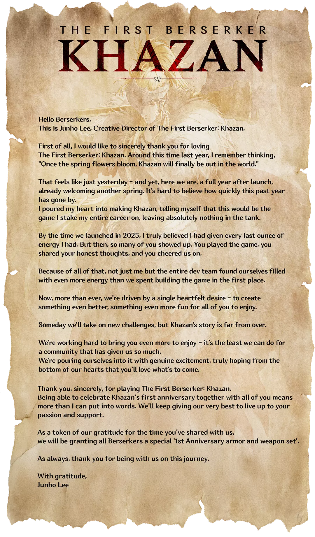 《The First Berserker: Khazan》迎来一周年,制作组感谢玩家支持,将向所有已购买游戏的狂战士玩家发放一周年纪念套装,套装包含编年史巨剑等多款武器。