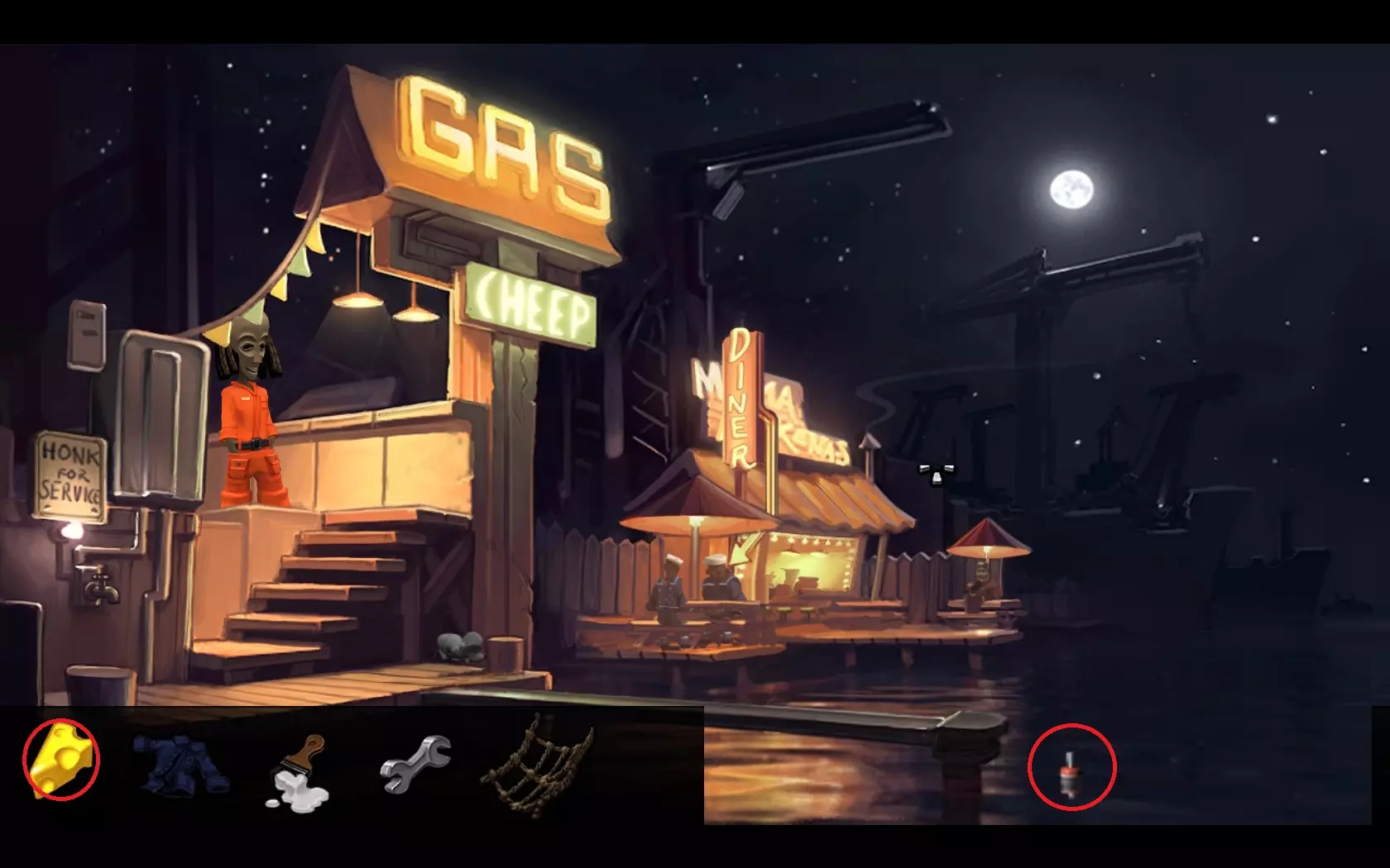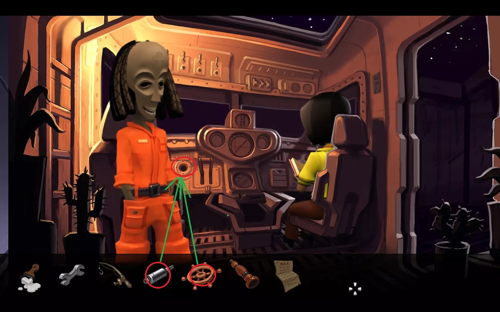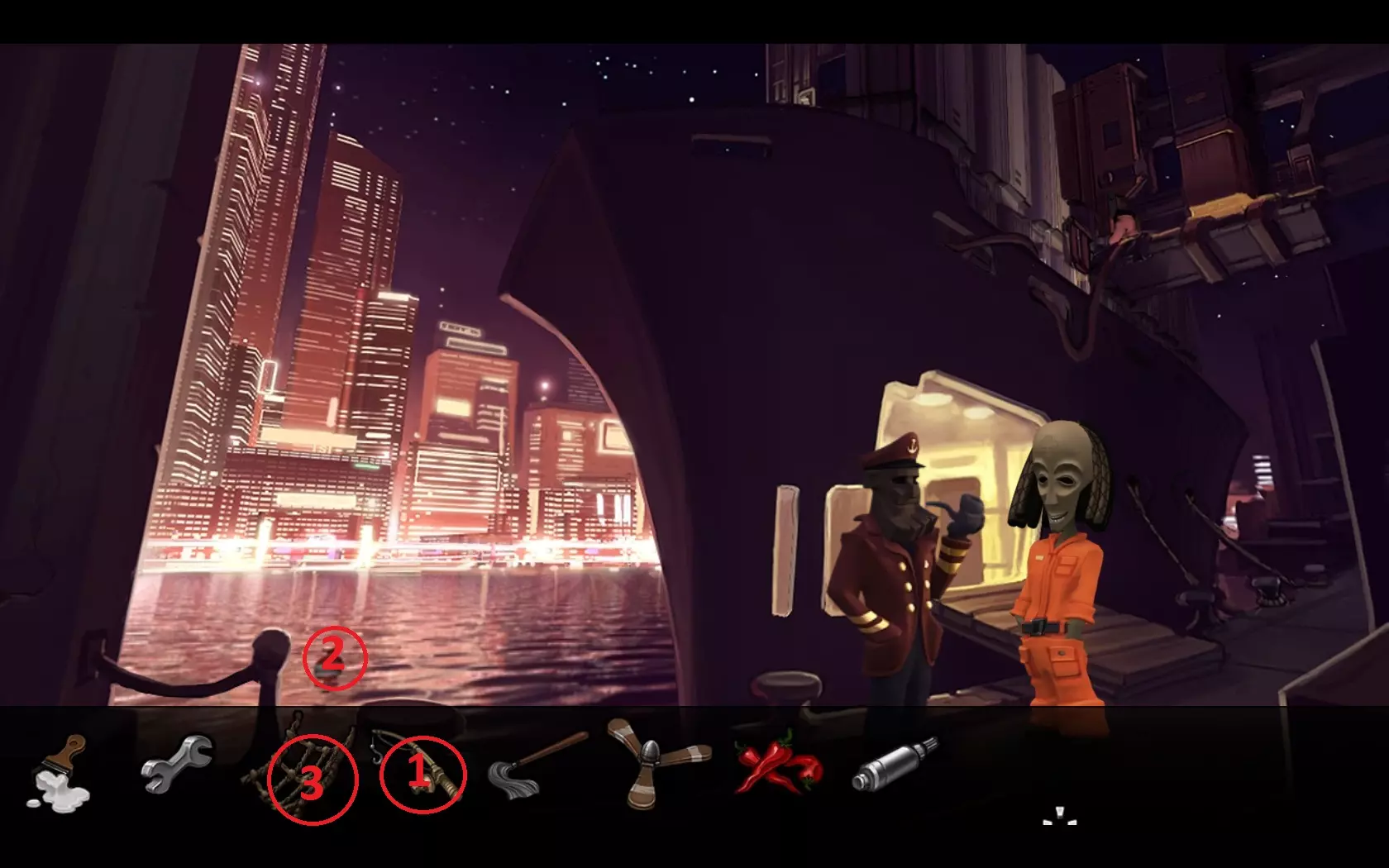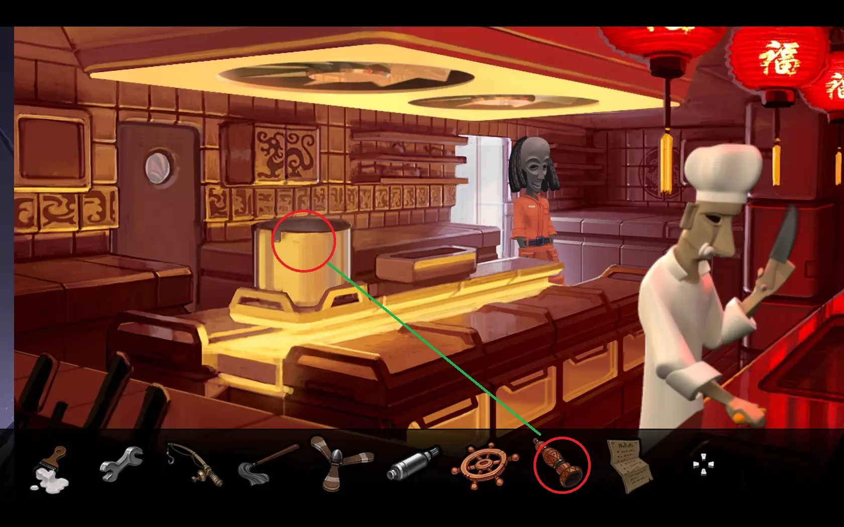 - 返回飞船 - 用鱼竿(1)钓起“浮标”(2) - 查看浮标,会发现有螃蟹的笼子 - 用网(3)对着有螃蟹的笼子使用 - 返回码头——玛玛·麦肯纳餐厅所在的地方 - 用螃蟹引诱鲁弗斯狗,之后狗会跑开 - 进入餐厅内 - 指向方向盘——玛玛·麦肯纳会允许拿走它 07. 两个引擎
