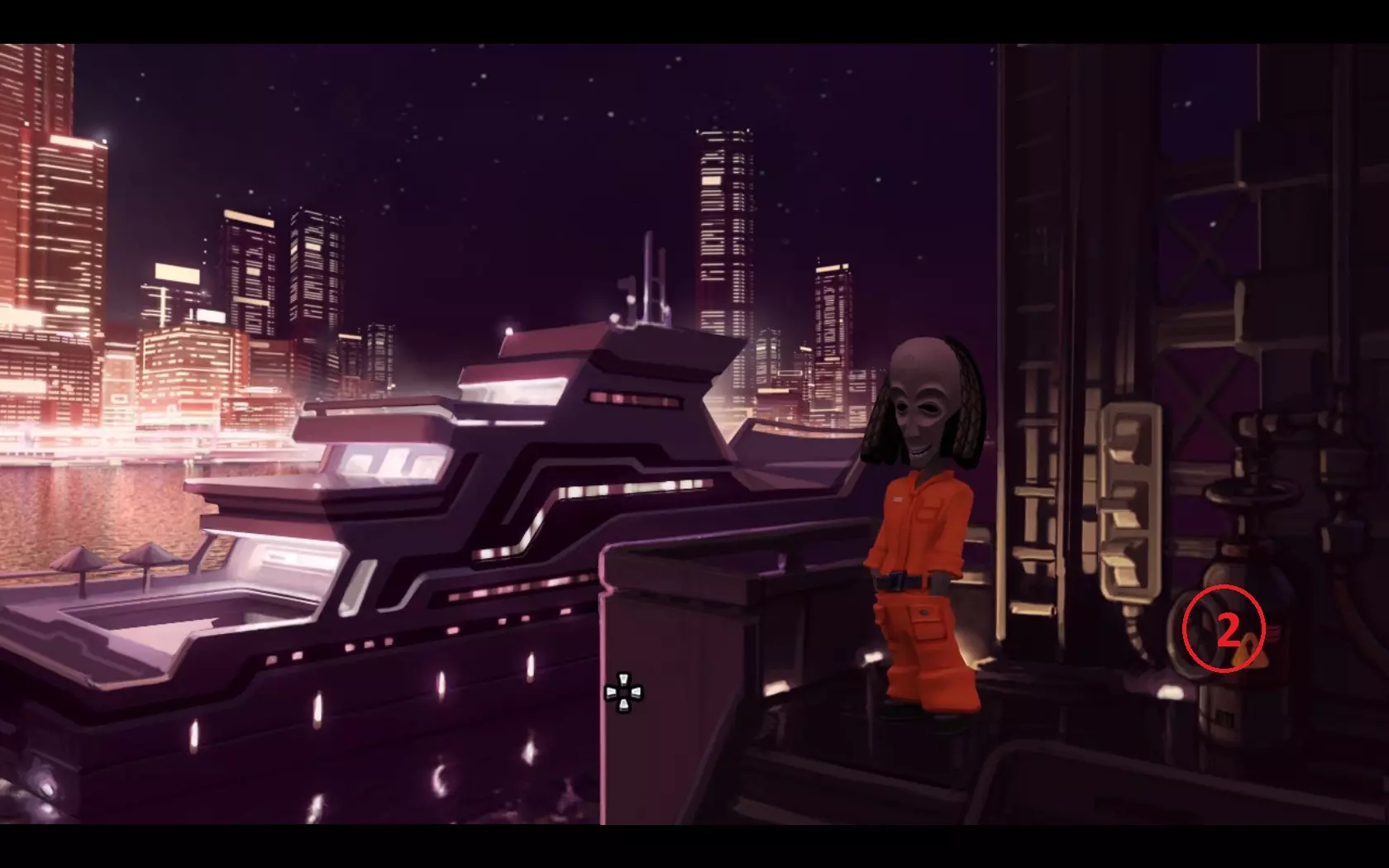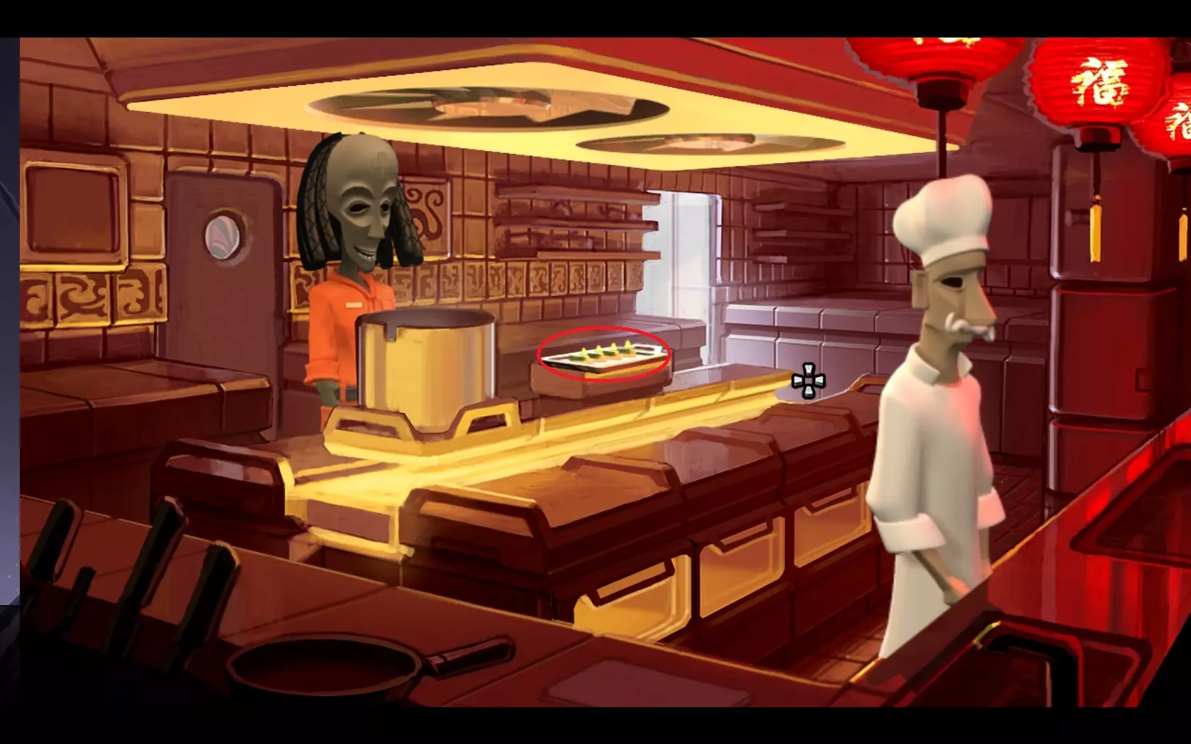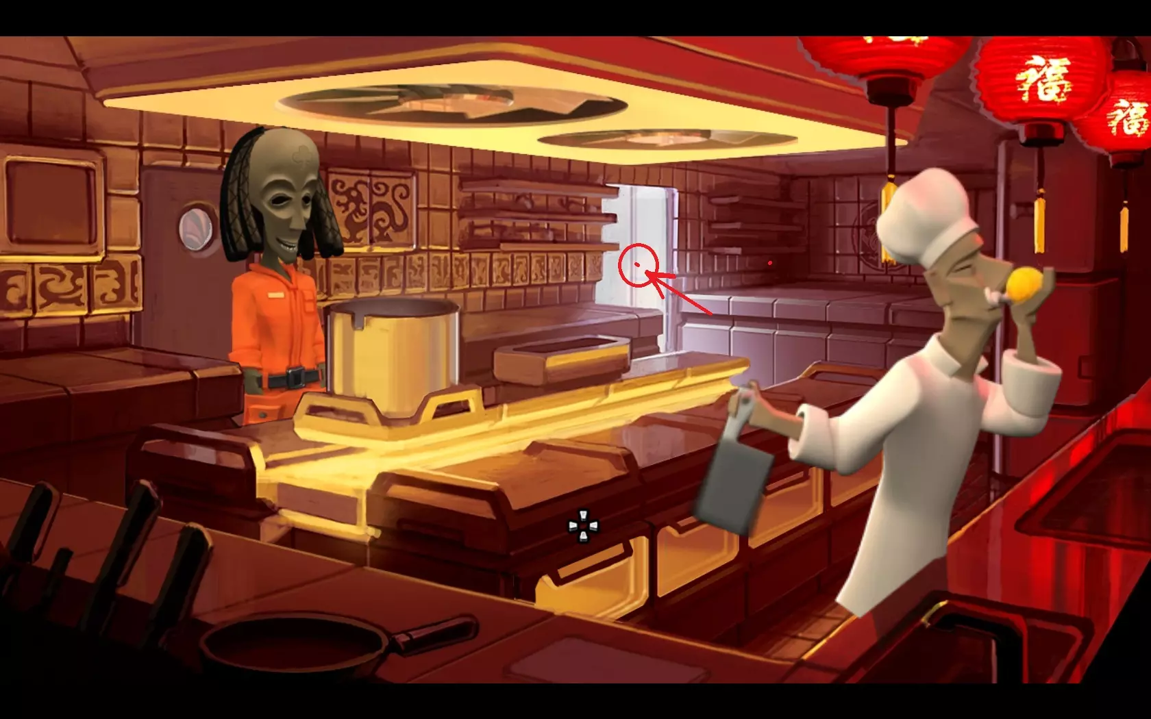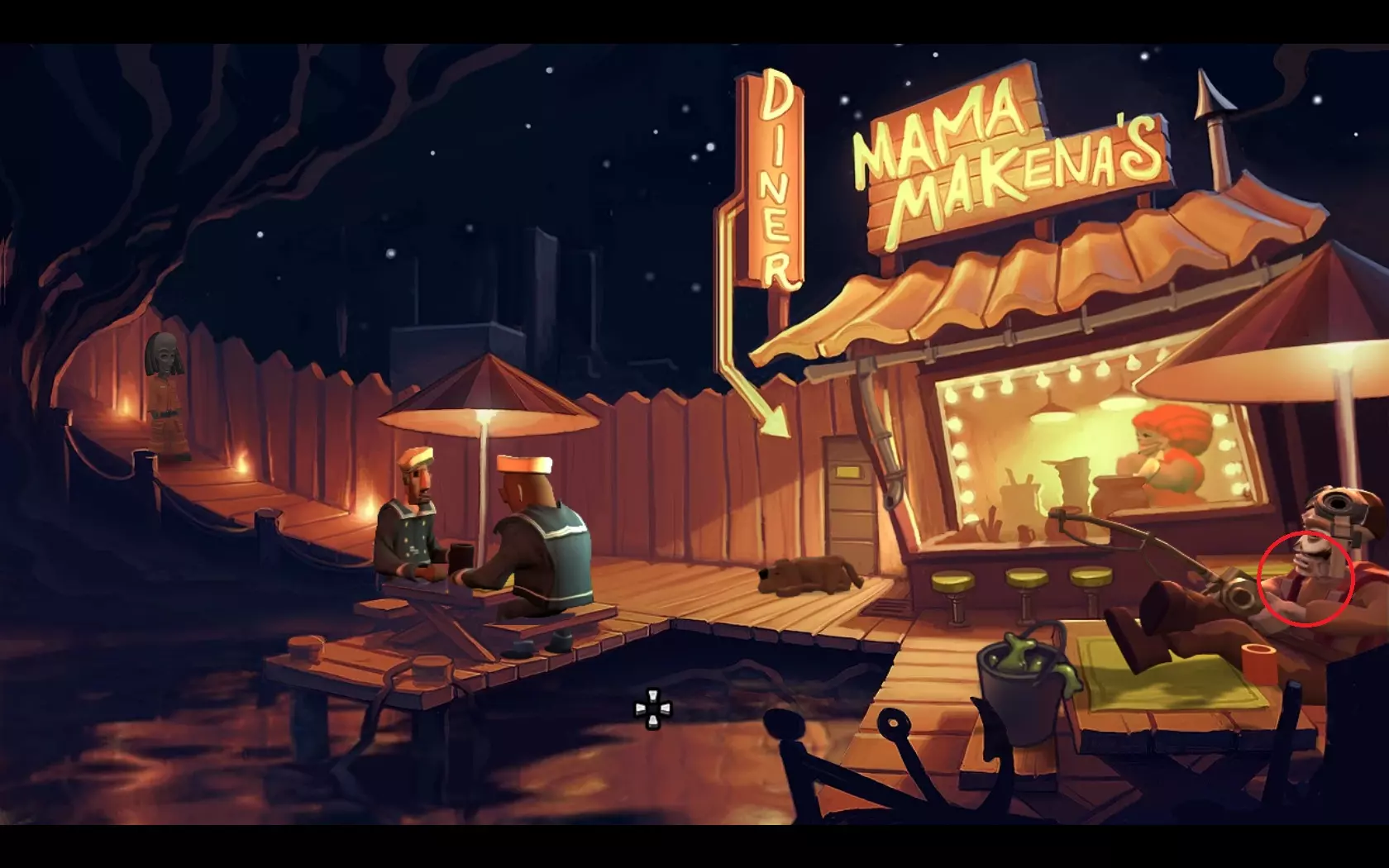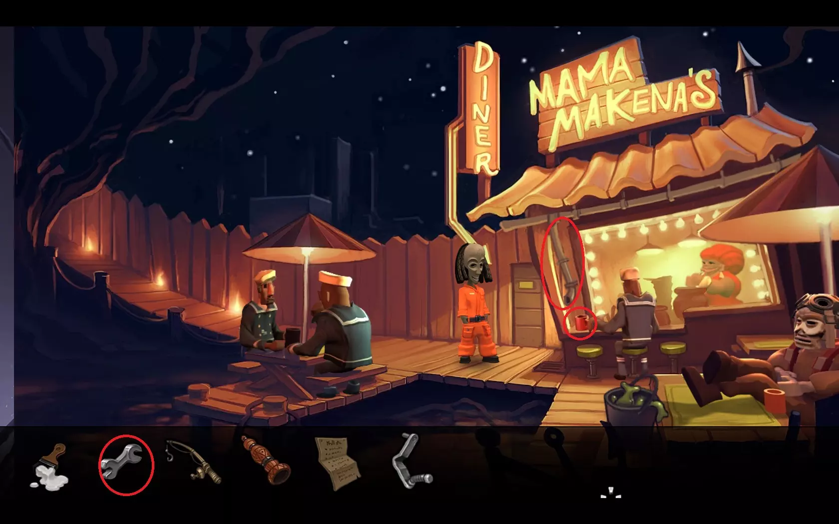 - 返回飞船 - 用鱼竿(1)钓起“浮标”(2) - 查看浮标,会发现有螃蟹的笼子 - 用网(3)对着有螃蟹的笼子使用 - 返回码头——玛玛·麦肯纳餐厅所在的地方 - 用螃蟹引诱鲁弗斯狗,之后狗会跑开 - 进入餐厅内 - 指向方向盘——玛玛·麦肯纳会允许拿走它 07. 两个引擎