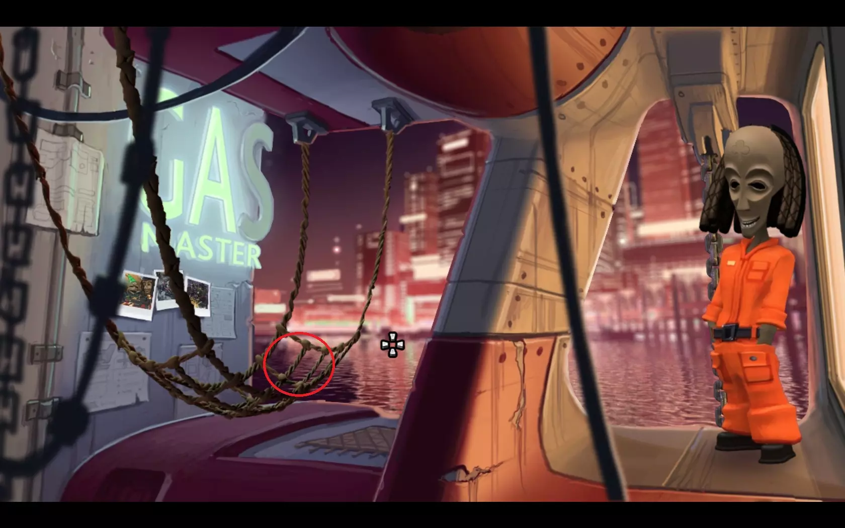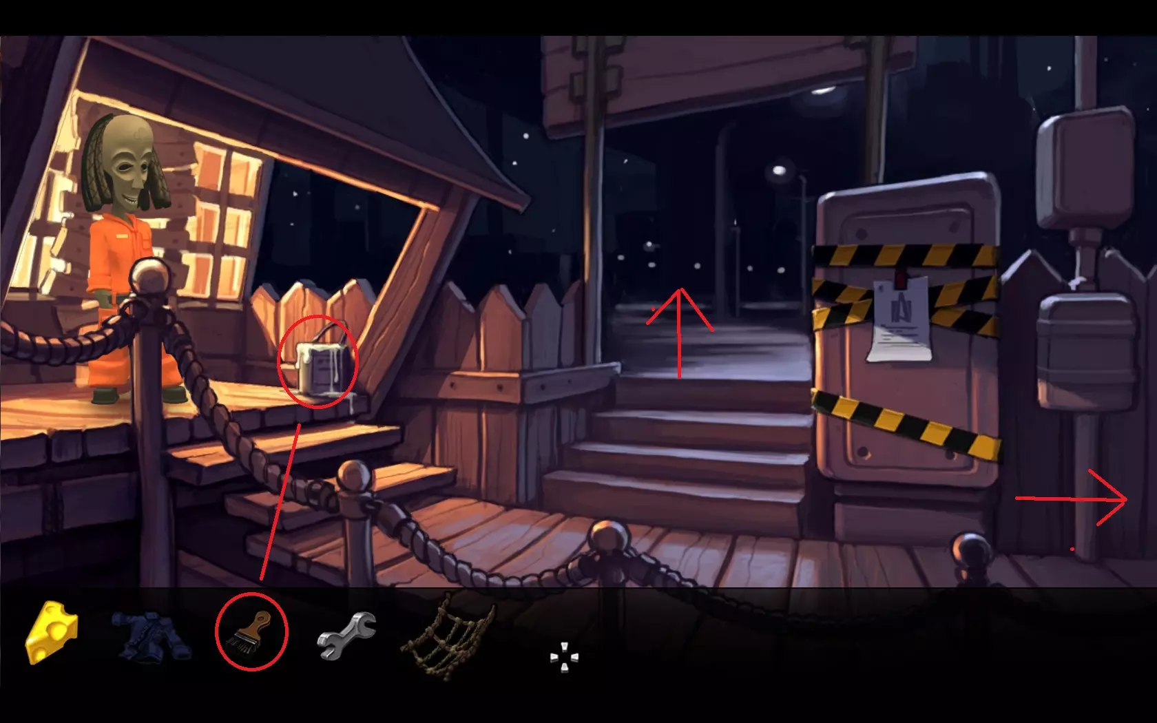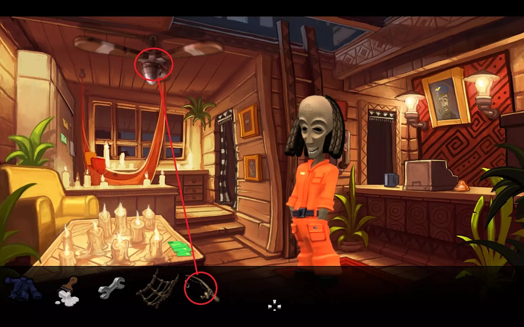 - 检查垃圾并拿起钩子。 - 将钩子装到鱼竿上。 - 返回飞机处并进入屋子。 - 用鱼竿勾天花板上的风扇。 - 你会得到损坏的螺旋桨。 - 回到电车车站。 - 走向船只。