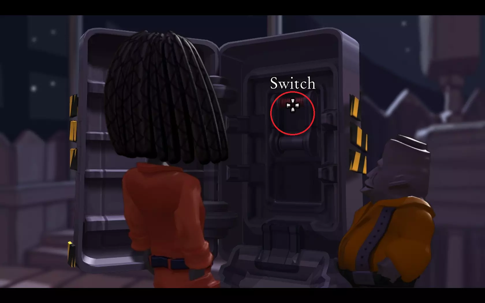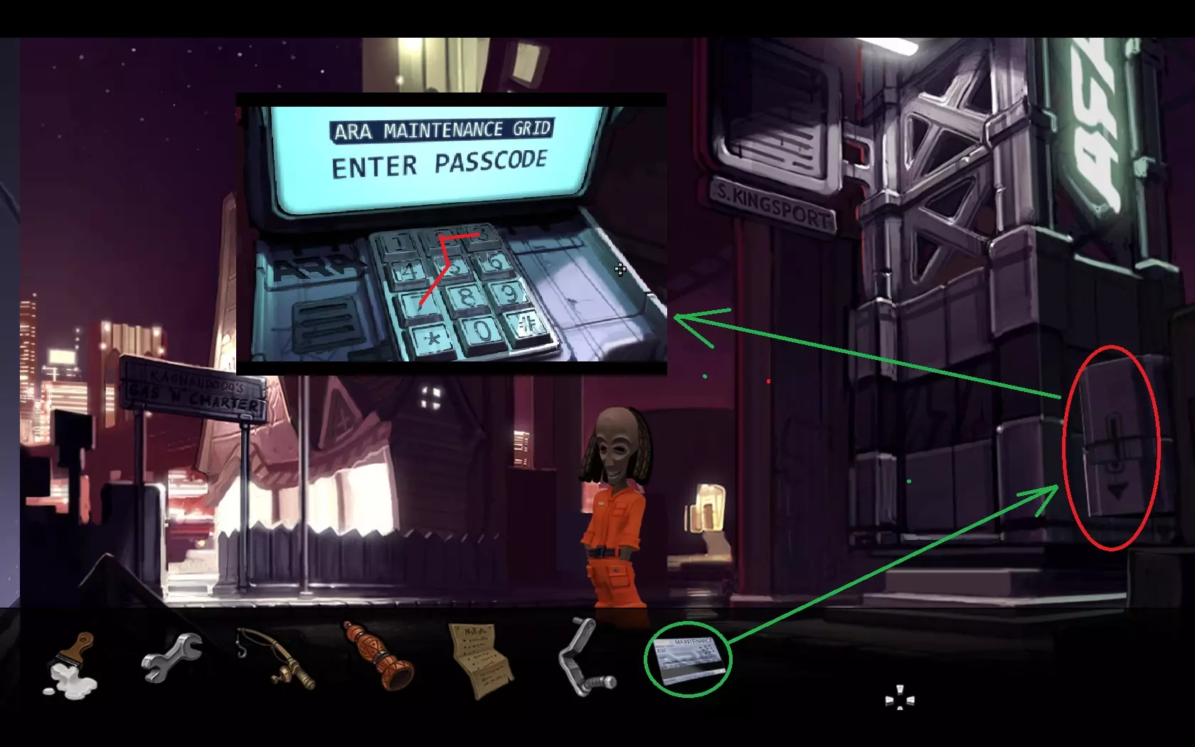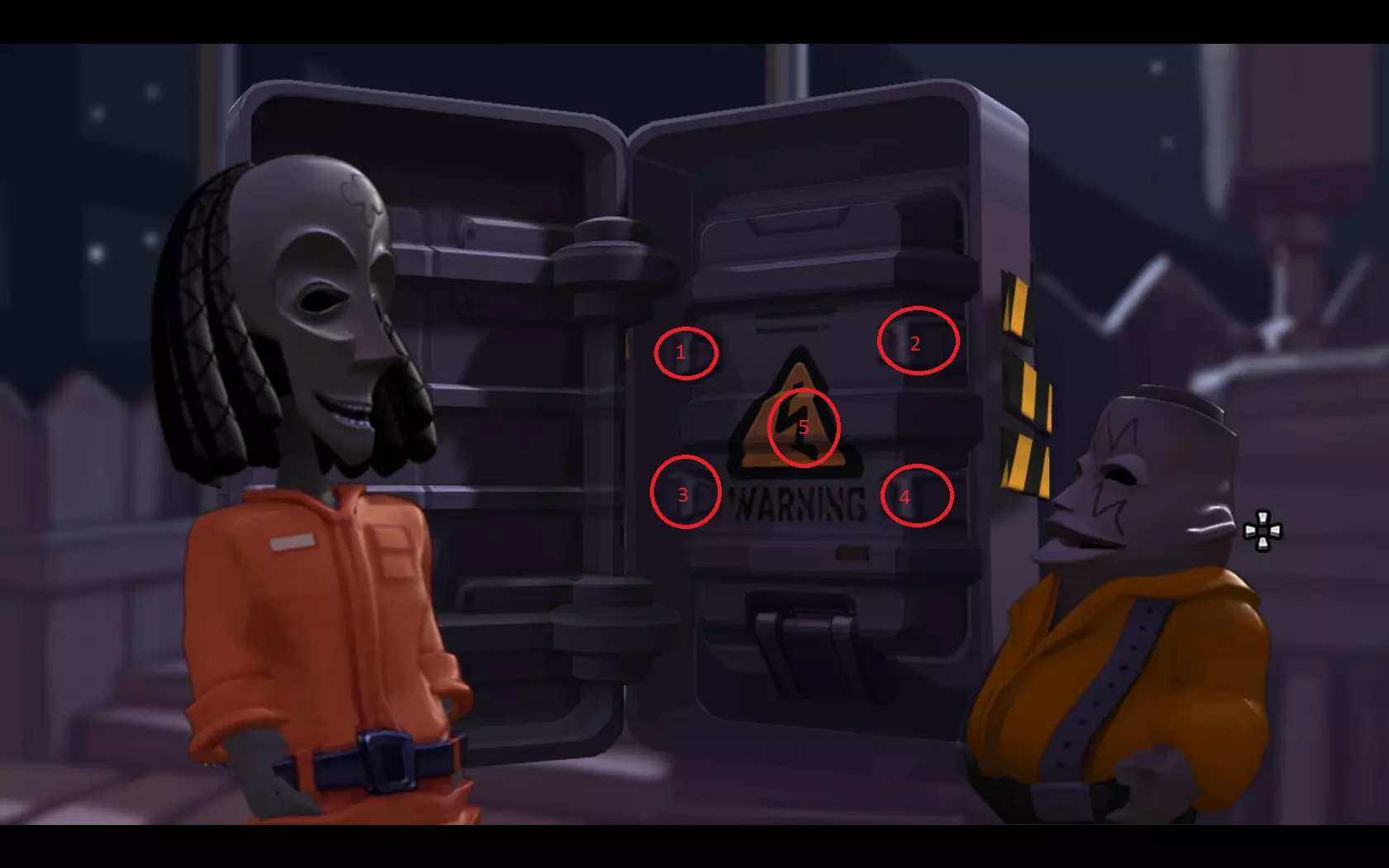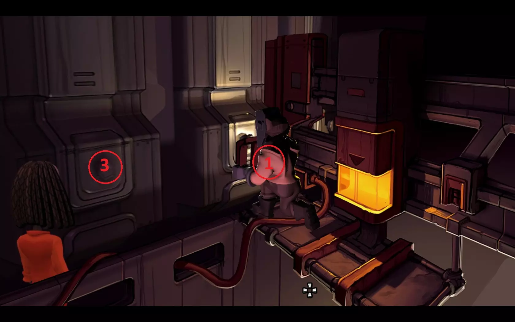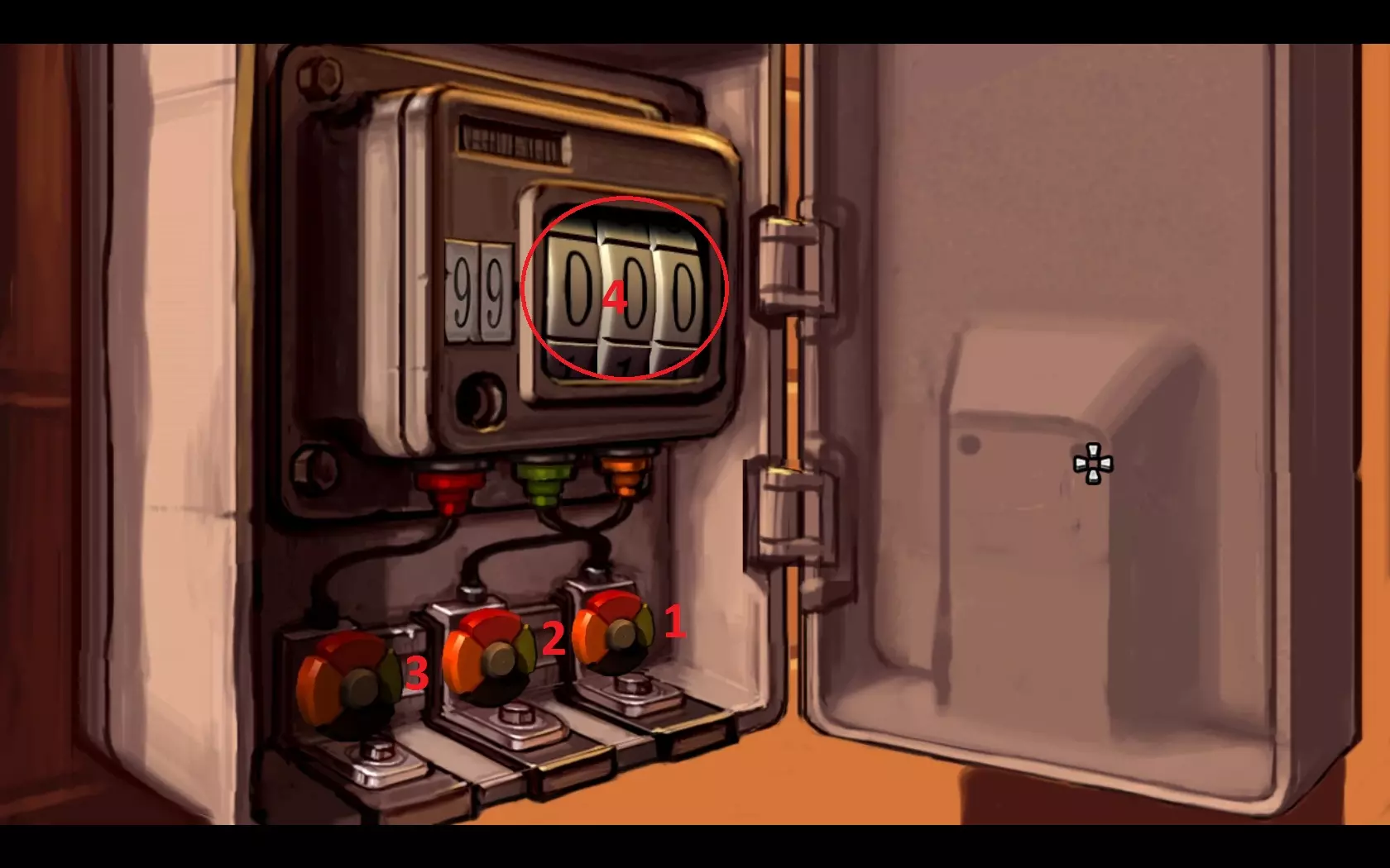 - 打开卡扣(1-4),然后打开墙板上的盒子(5) - 合上断路器 就这样,经历了一些小波折后,我们的主角们为他们的加油站通上了电,并遇到了一位女性……